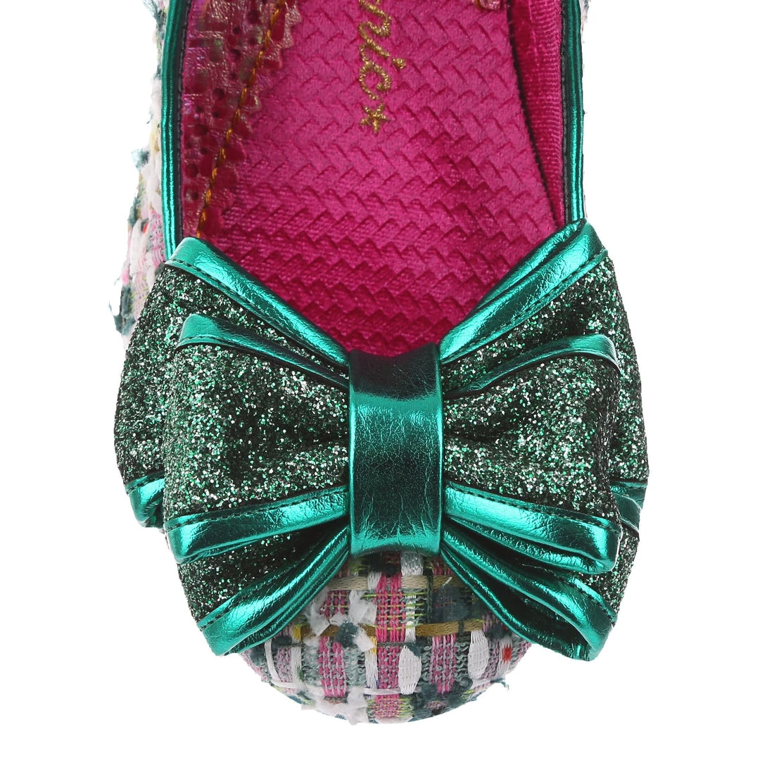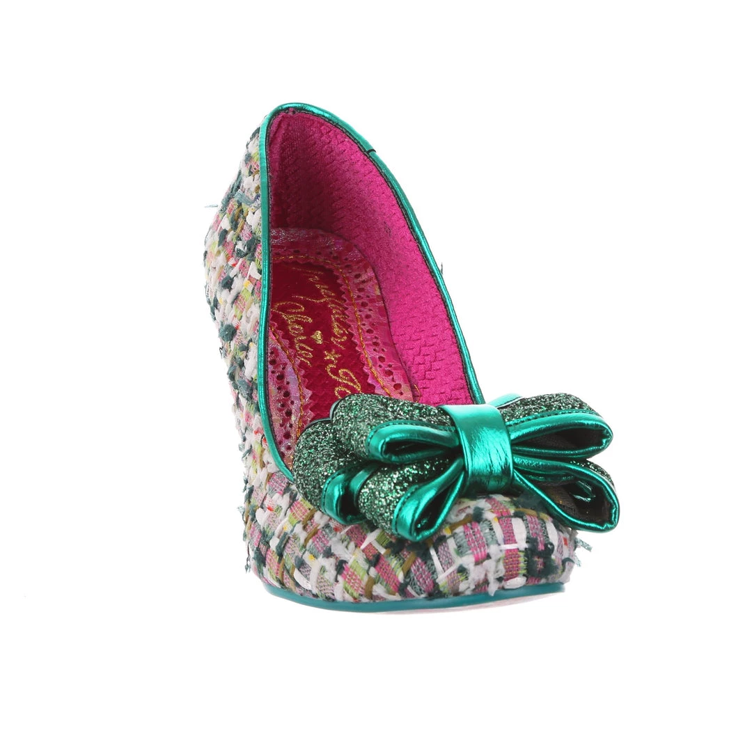 Something fabulous on your feet, these tweed mid heel courts are the perfect way to add something classy but fun to your wardrobe! The gorgeous green textured tweed is paired with a deep forest glitter bow on the toe and a shimmering jade tone metallic wrapped heel. Classically IC and sure to become instant faves!