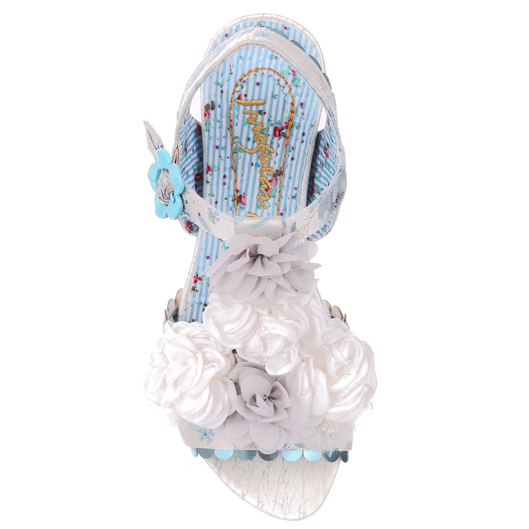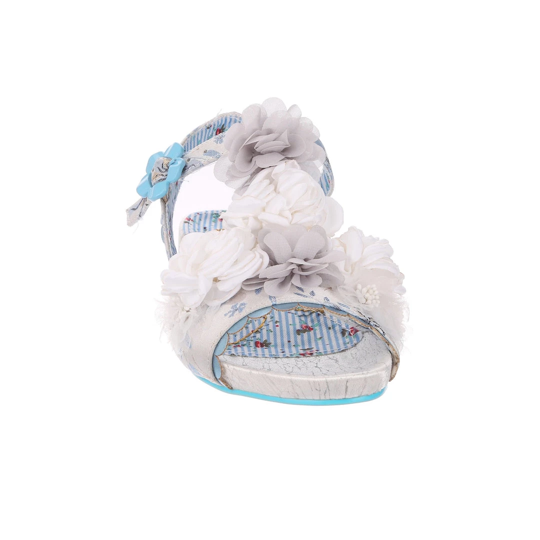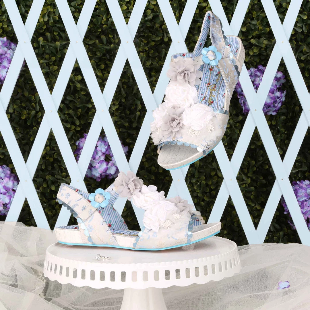 Summer wedding ready! Choose these super comfortable sandals with delicate flowers adorning the strap and t-bar, with pastel blue scalloping and the cute flower shaped buckle, you will be hitting the dance floor all night long! The blue is continued in the floral fabric along with touches of glistening gold thread on these open-toe shoes.