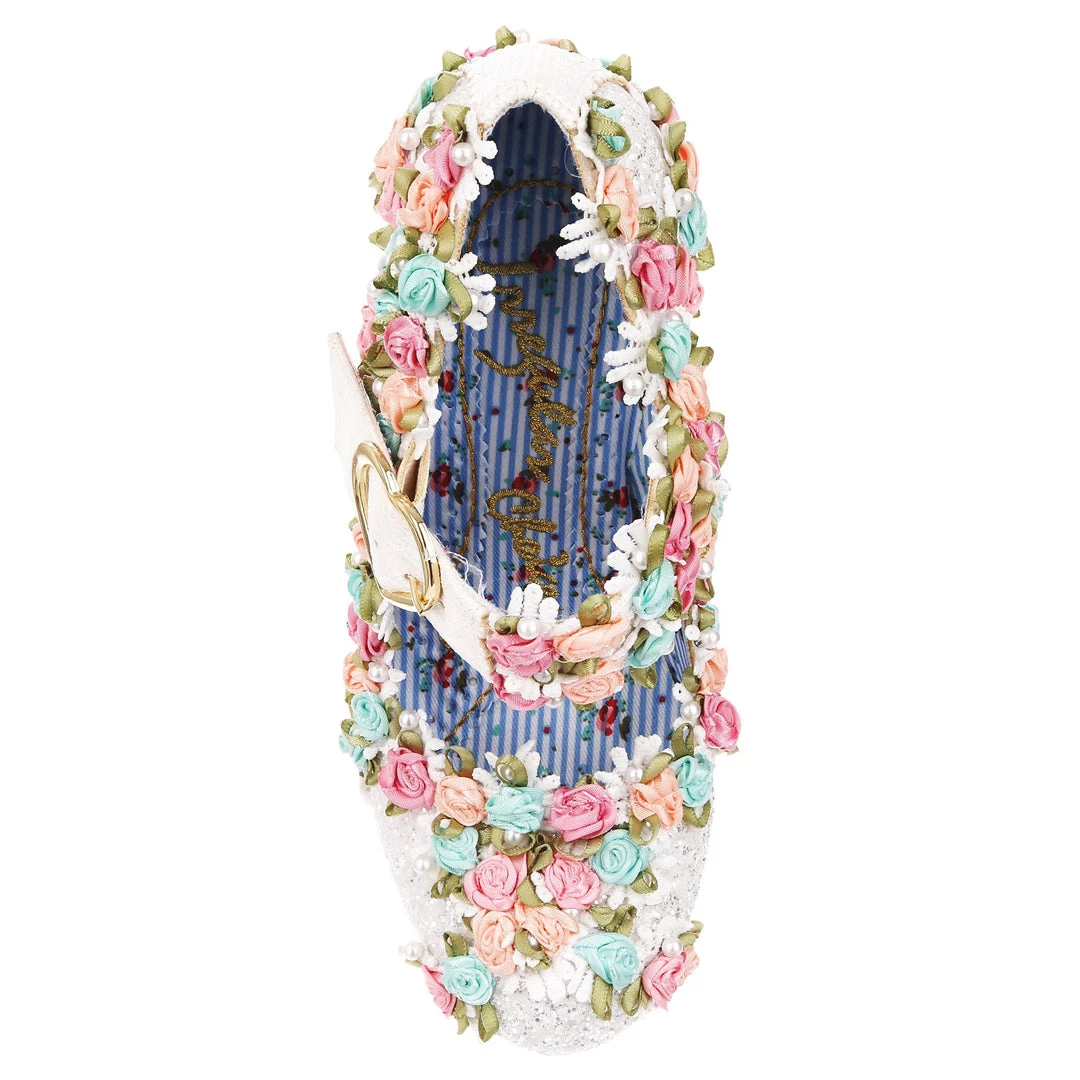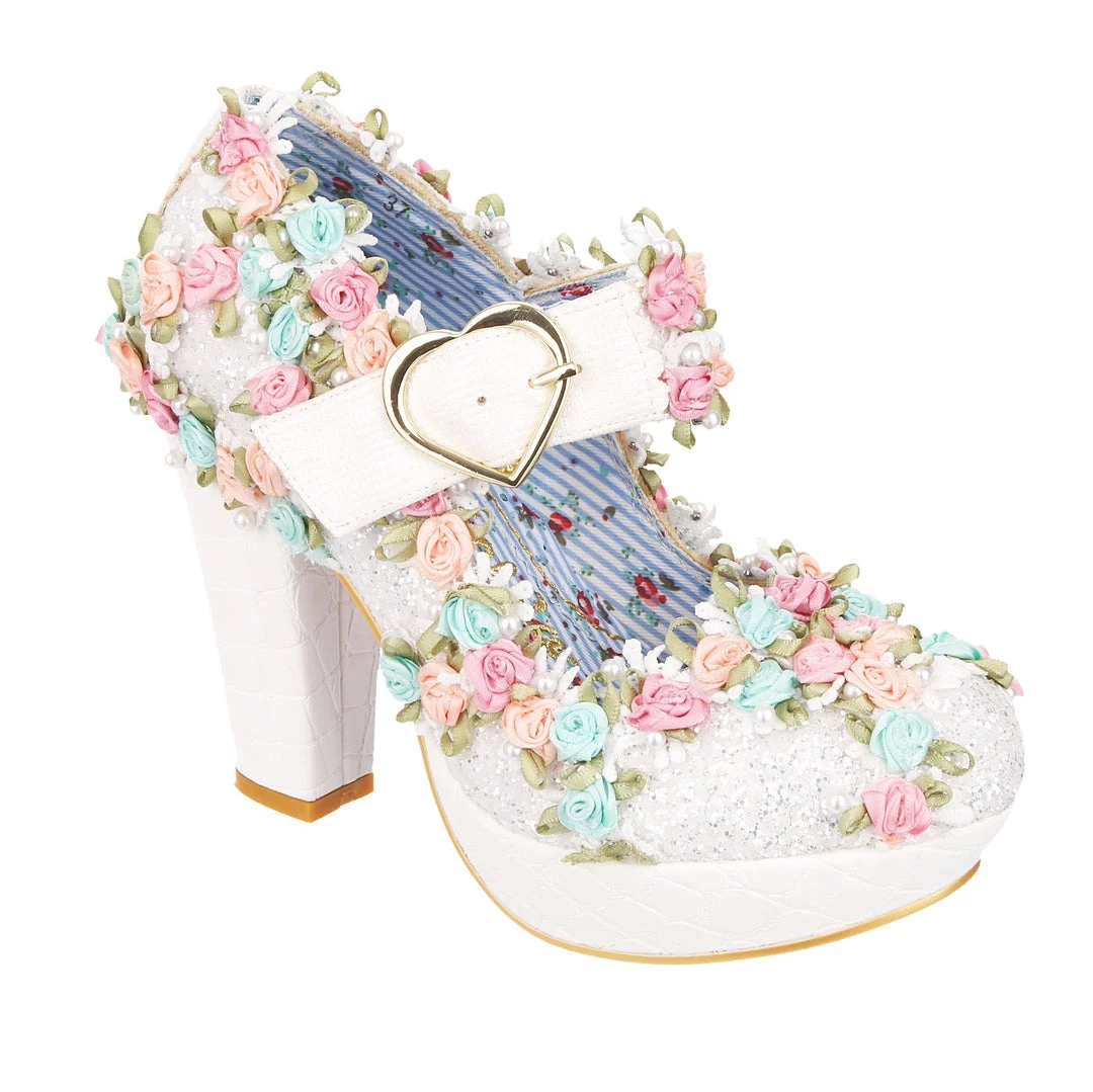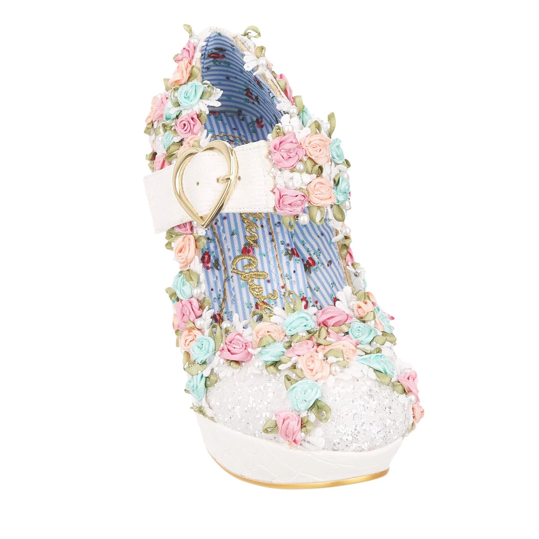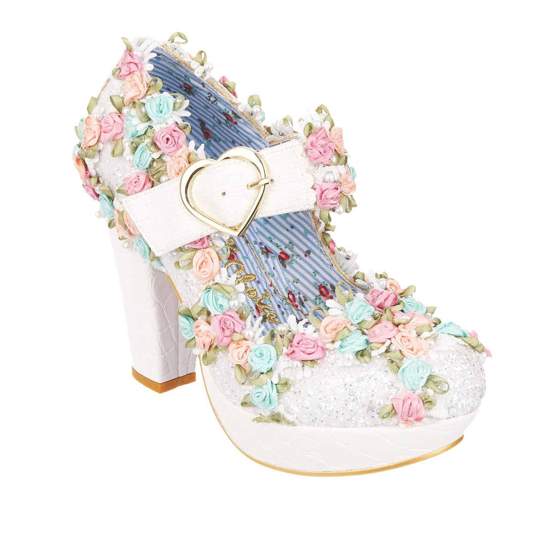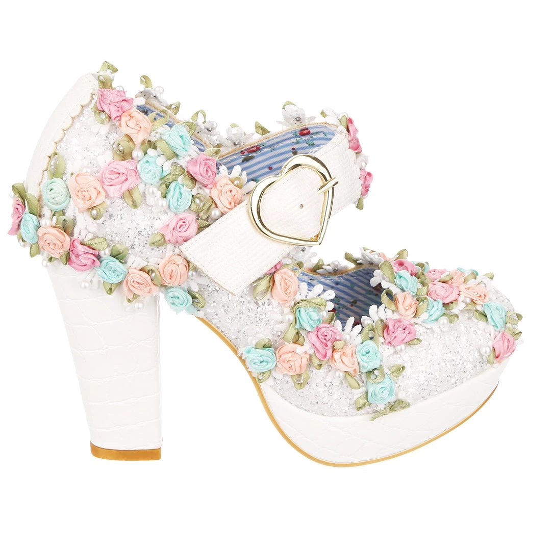 Wrap yourself in flowers and love in these darling heels! Stunning flowers criss-cross around the ivory upper in hues of pink, teal and green, adding opulence and elegance to this gorgeous pair of shoes – this is all pulled together with the delicate sparkling white glitter. The chunky heel and platform are a textured white as the perfect finish. Add these bridal shoes to your big day!