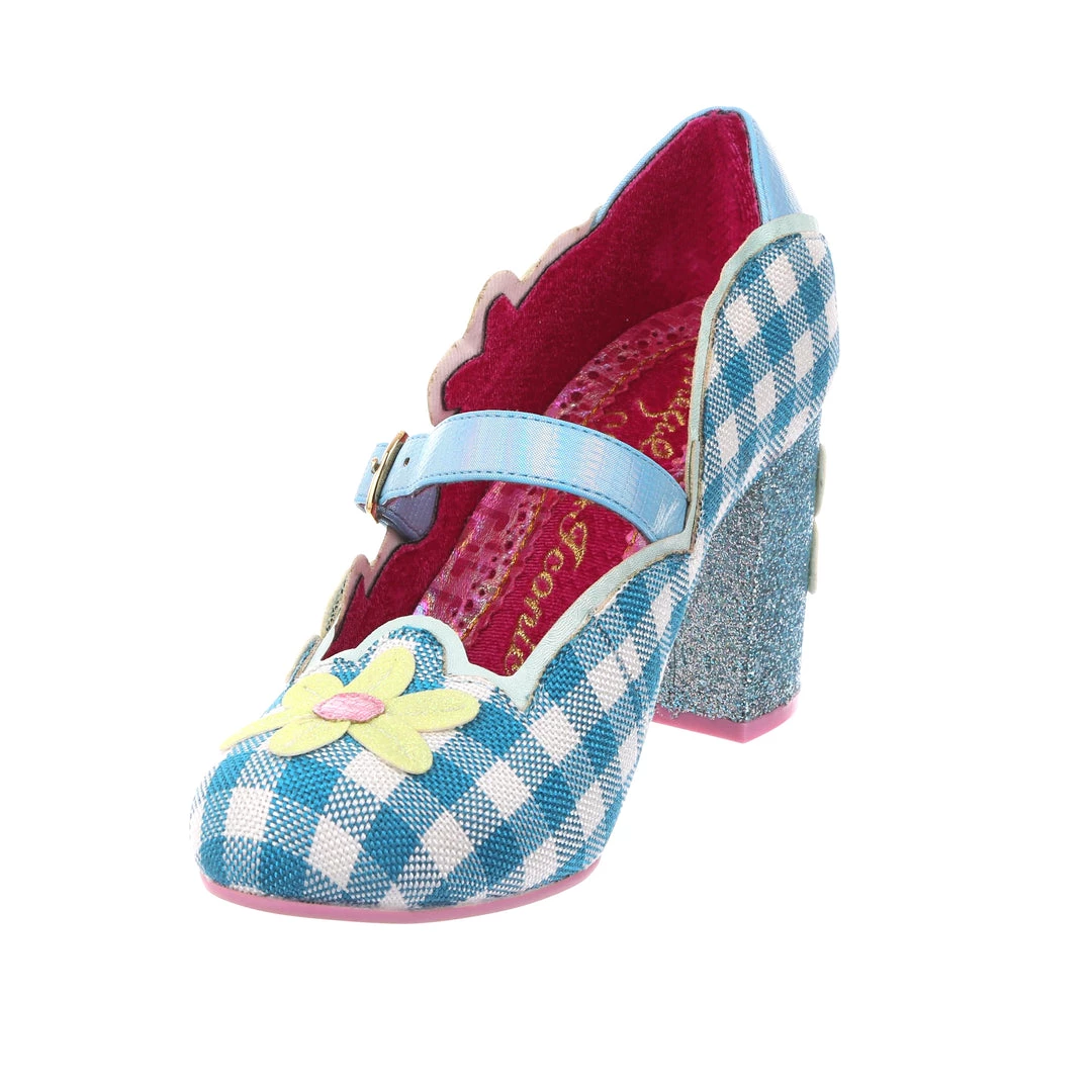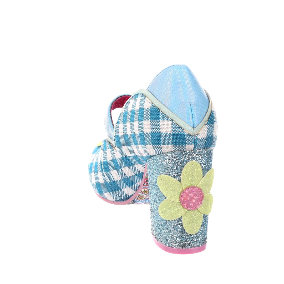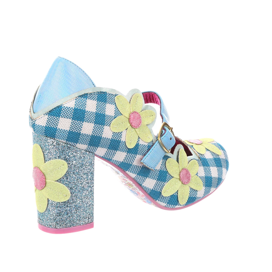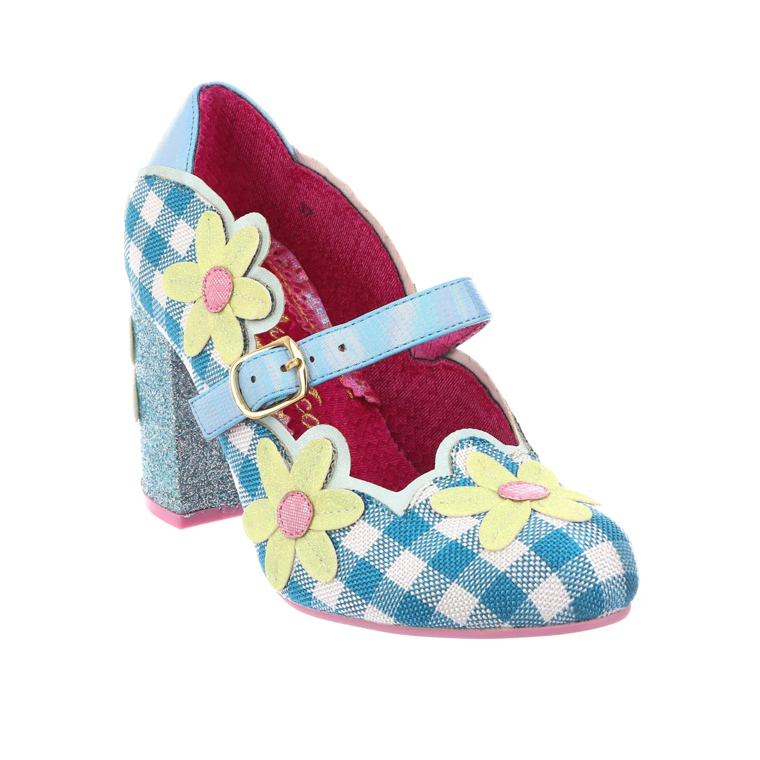 Dance on daisies and dreams in these magical heels! These iconic chunky high heeled Mary Janes have been reimagined this season in all new colours, Daisy Dancer is here for all you flower lovers! Blue and white gingham is paired with yellow and pink blossoms and a metallic blue Mary Jane strap! Add them to your collection today!