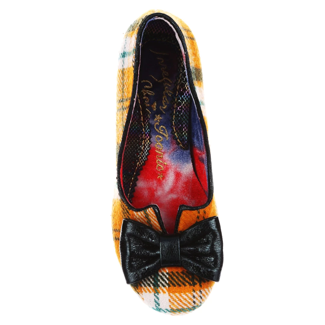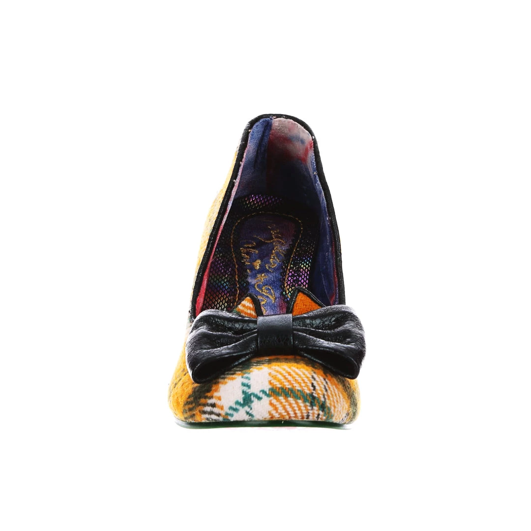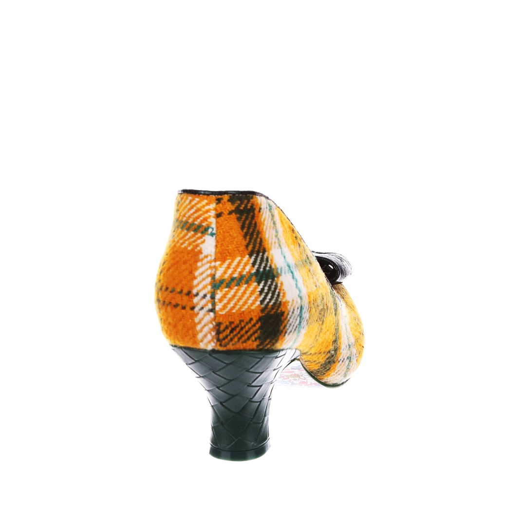 A wearable low heel in green and mustard tartan check is paired with a subtle dark green patent bow to the toe and a woven style pattern green heel. A classic leg-flattering split vamp and a cute round toe make these a perfect pair for your autumn occasions! A perfect new take on our classic Iconic style.