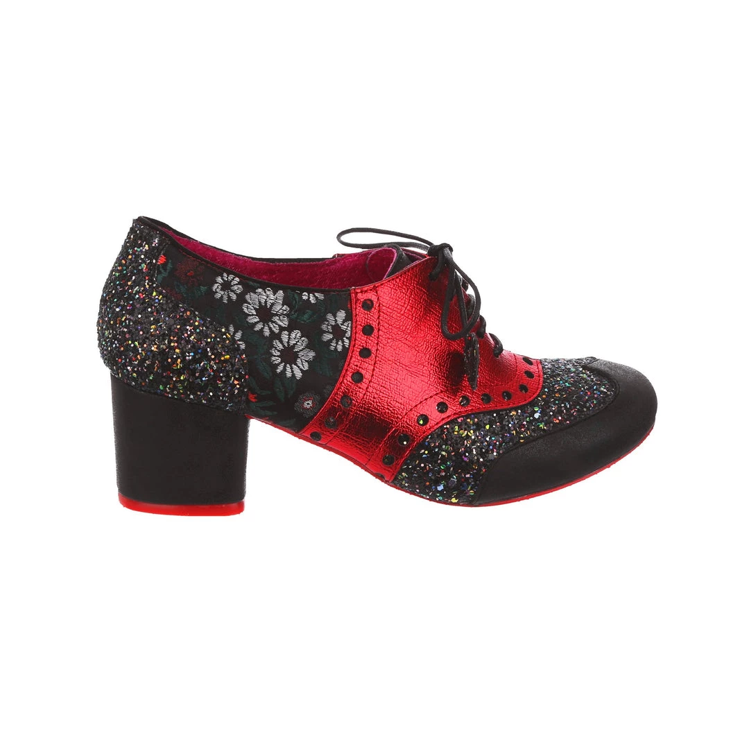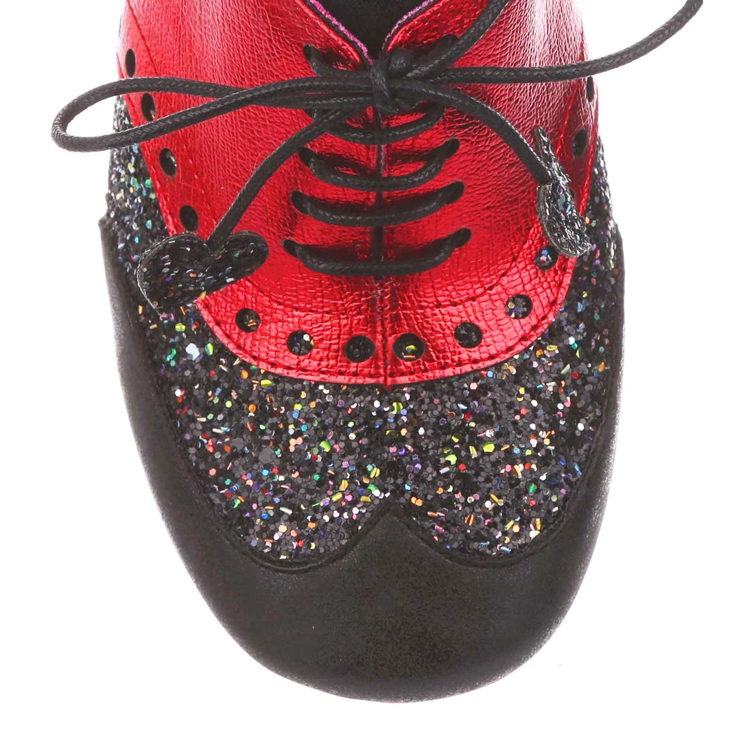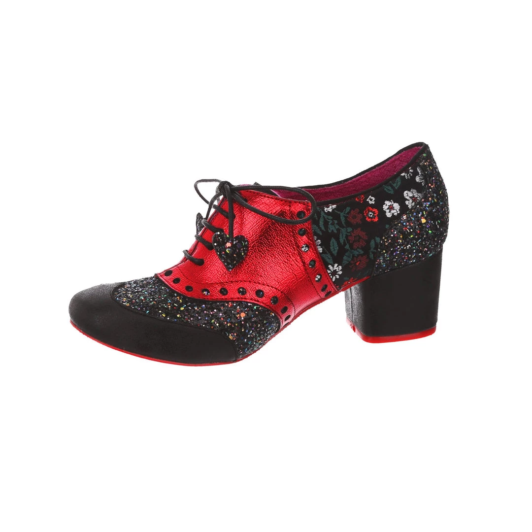 Lace up something lovely! A romantic brogue style red shoe with a low wearable heel is the perfect shoe for the colder months. The mismatched panels of brushed metallic black, deep iridescent glitter and shimmering red, along with a little peep of claret brocade are all tied together with an elegant shoestring bow, tipped with glitter hearts! Perfect to pull any preppy outfit together, add them to your collection today!