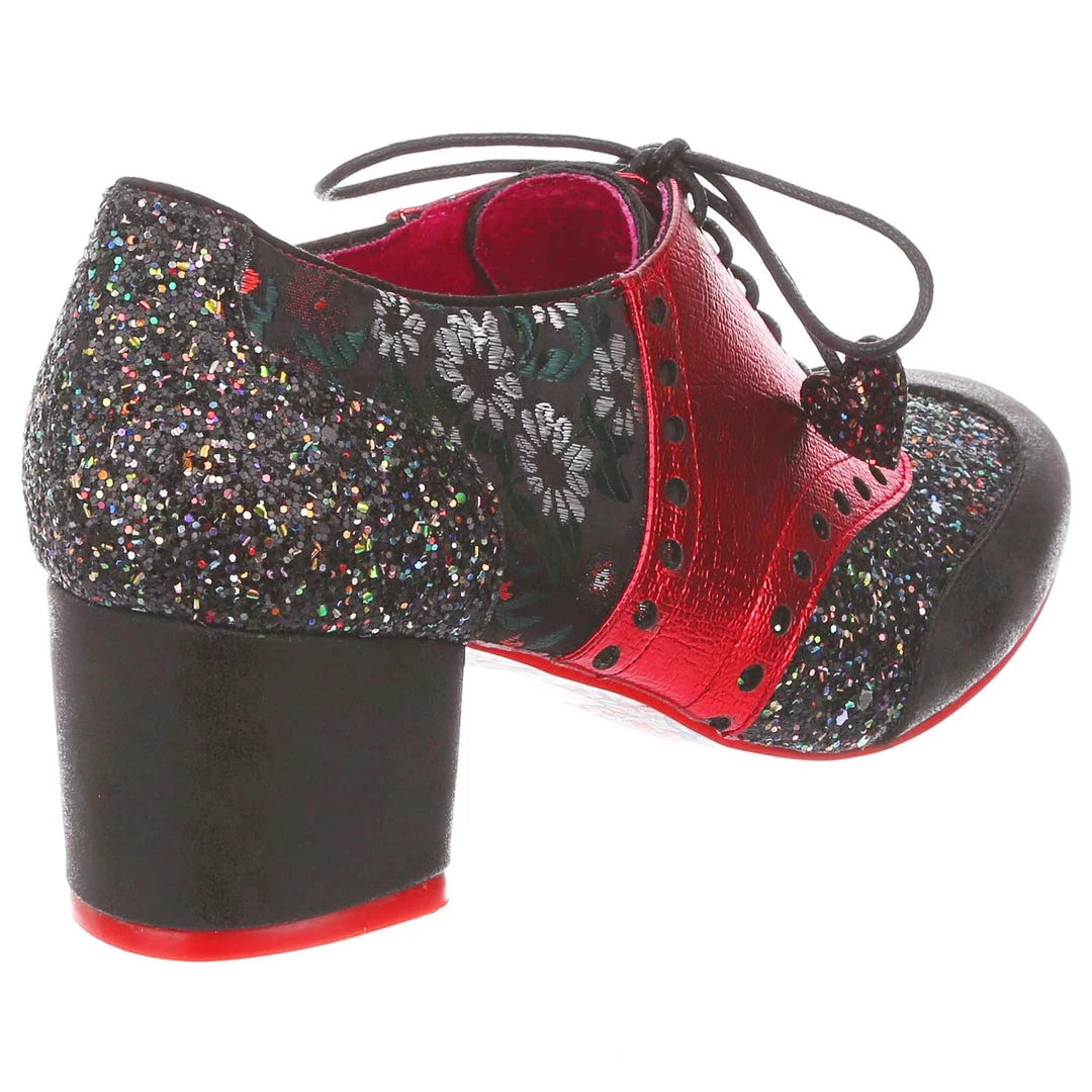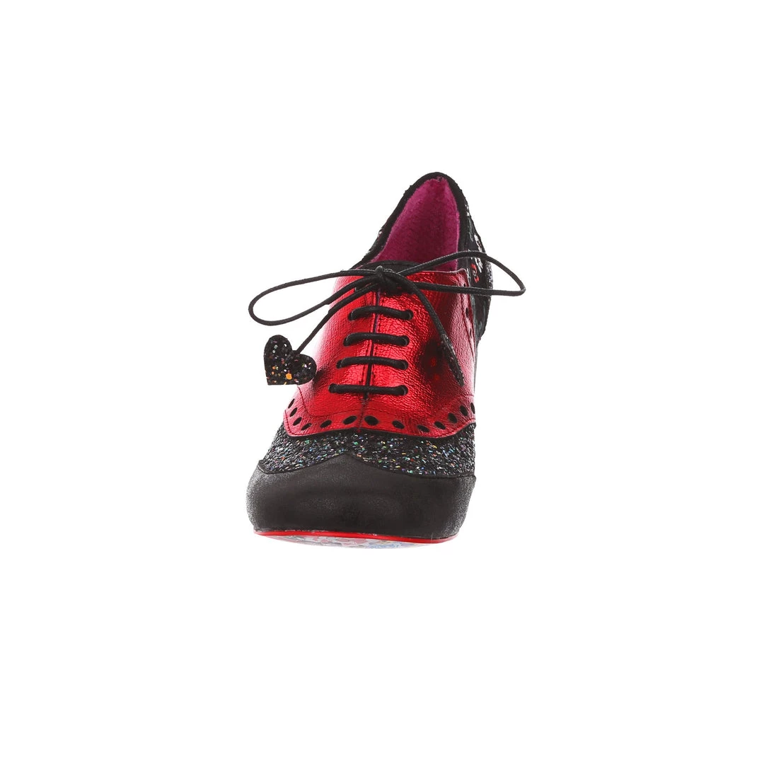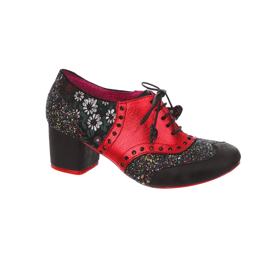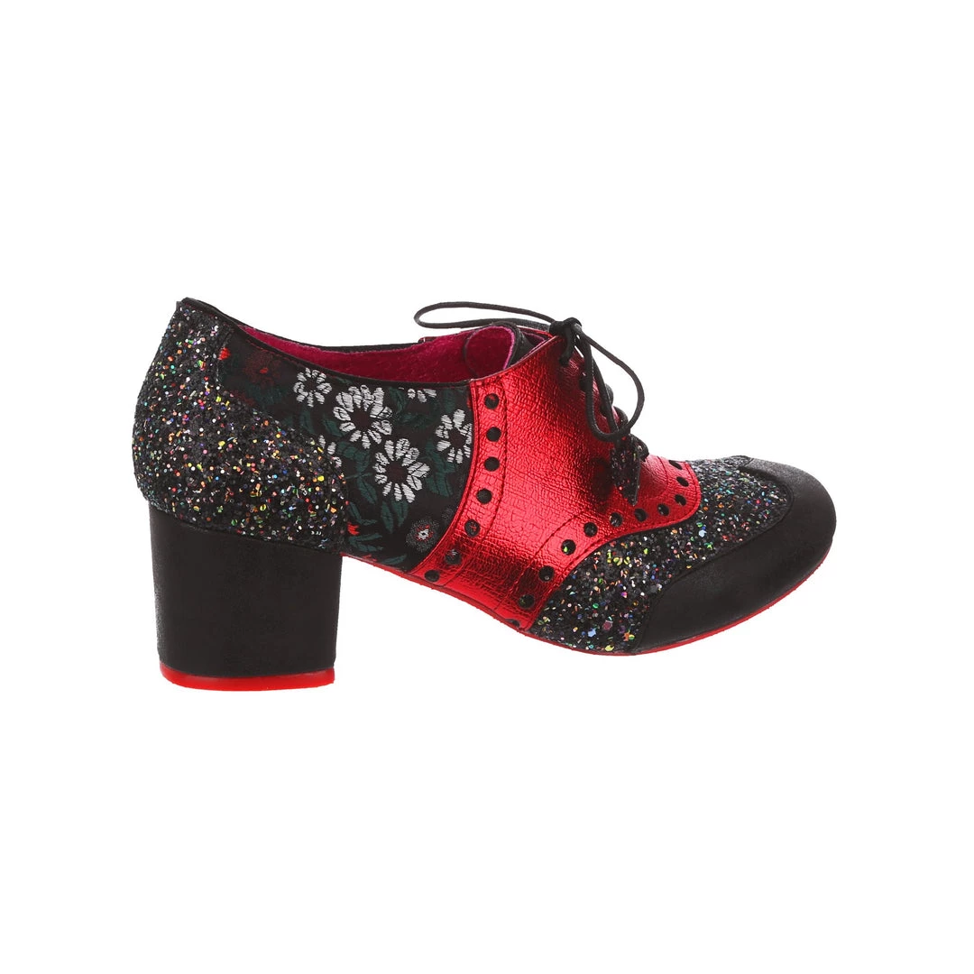 Lace up something lovely! A romantic brogue style red shoe with a low wearable heel is the perfect shoe for the colder months. The mismatched panels of brushed metallic black, deep iridescent glitter and shimmering red, along with a little peep of claret brocade are all tied together with an elegant shoestring bow, tipped with glitter hearts! Perfect to pull any preppy outfit together, add them to your collection today!