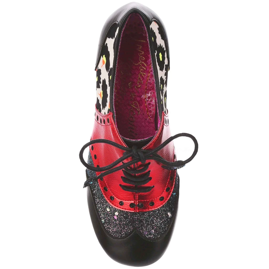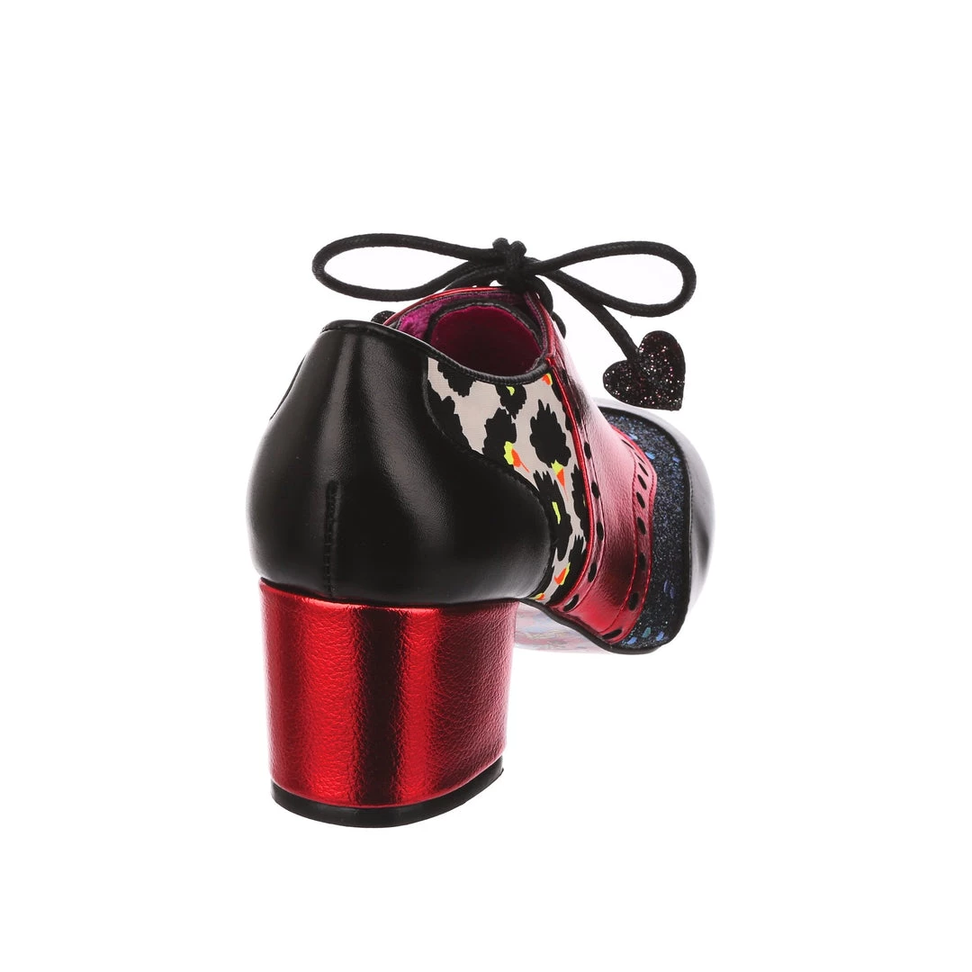 Lace up something lovely! A romantic brogue style red and black shoe with a low wearable heel is the perfect shoe for the changing seasons. The mismatched panelled tones of red in brushed metallic, iridescent glitter and floral with a touch of bright yellow are all tied together with an elegant shoestring bow, tipped with glitter hearts! Perfect to pull any preppy outfit together, add them to your collection today!