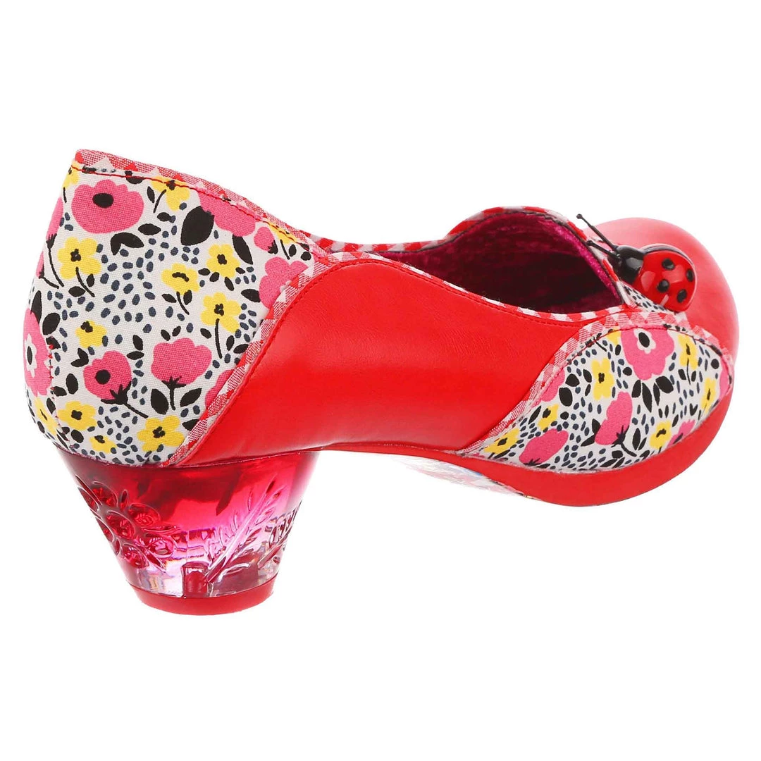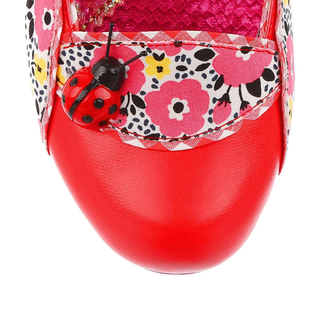 Oh so cute! These little ladybug faves are back! A stunning red is paired with adorable pink, monochrome and yellow florals, along with red gingham piping and, of course, the ladybug charm on the toe! Finished with our adorable lower lucite heel, these are one for all you comfort lovers who still want to be styling!