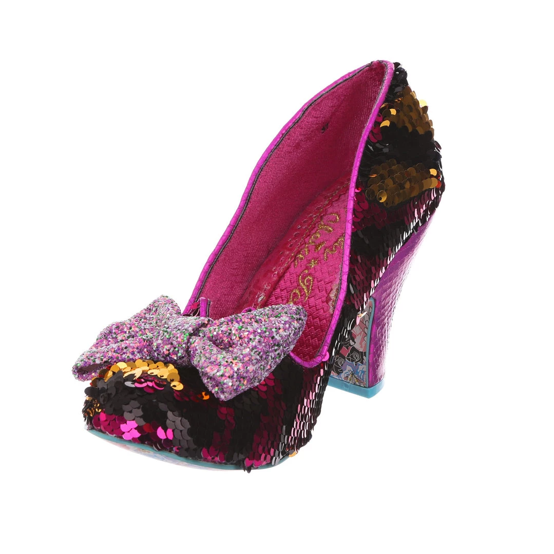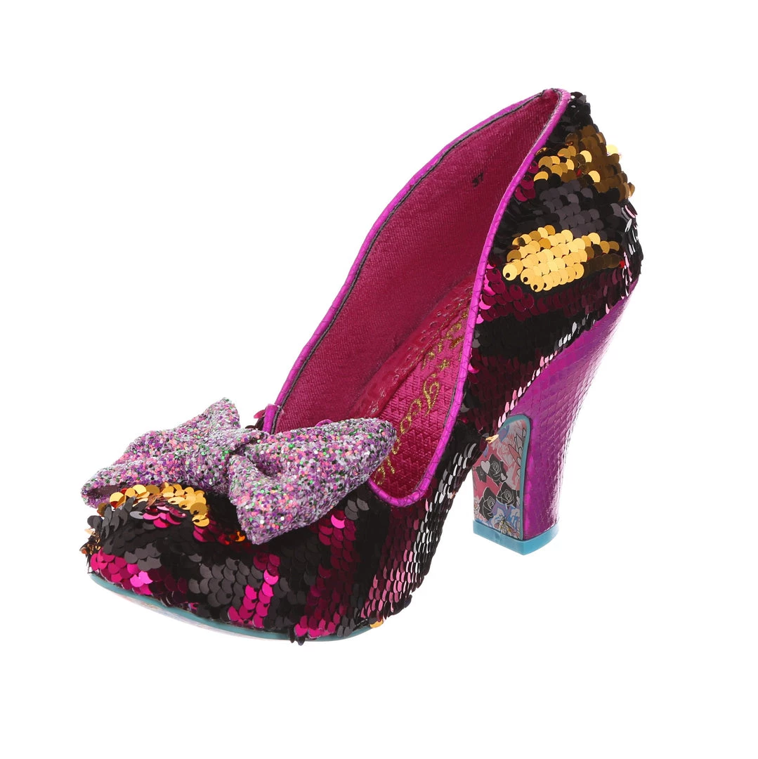 Give your look some serious WOW factor in these sequinned and spectacular heels! Our classic high heels, Nick of Time, have been all decked out in graphic black and pink and gold reversible sequins in a tiger stripe pattern! Tied together with the baby pink glitter bow on the toe, and metallic covered heel – these beauties are here to make your day, and your wardrobe, better!