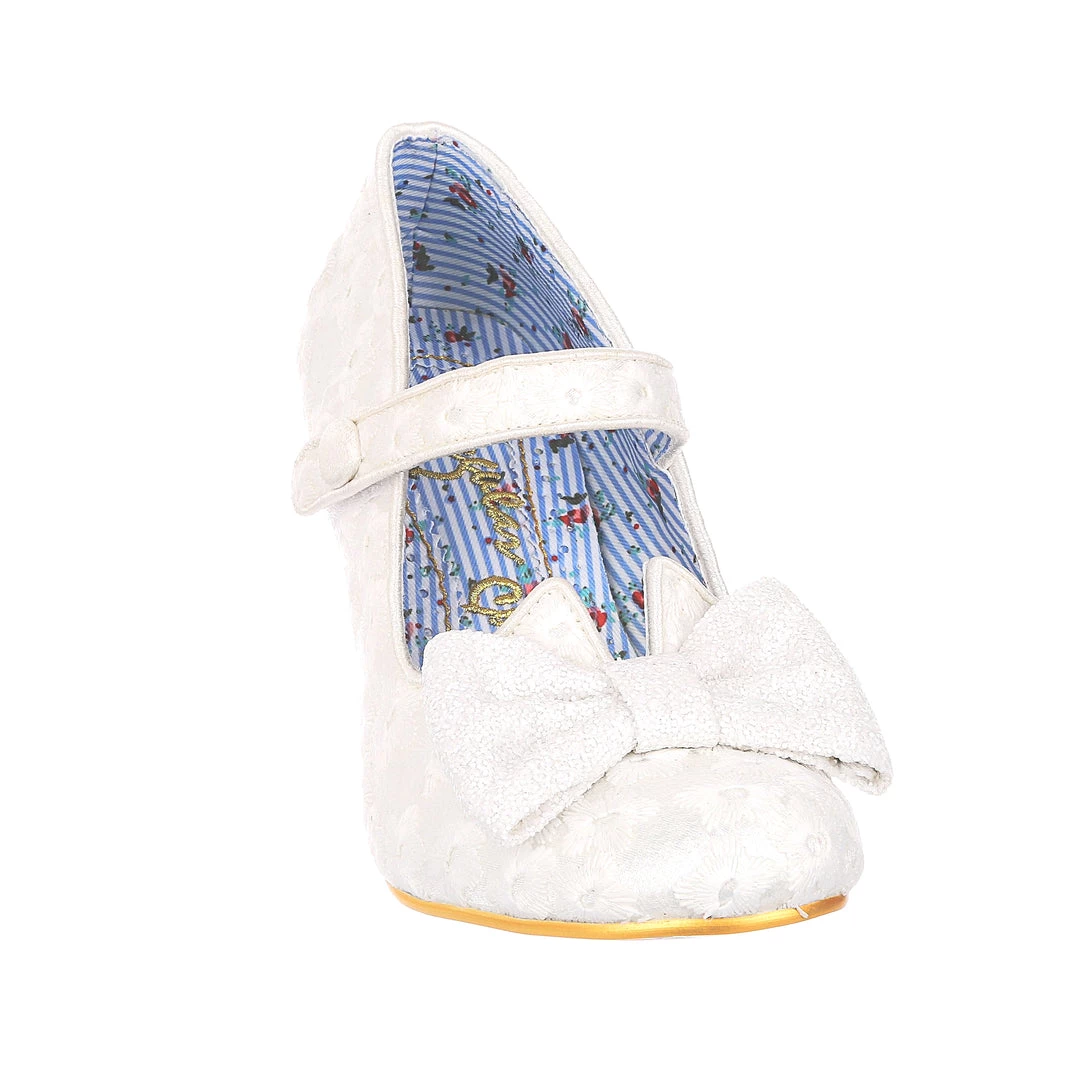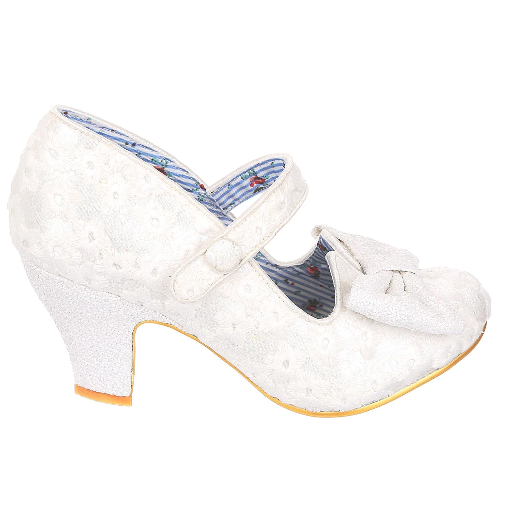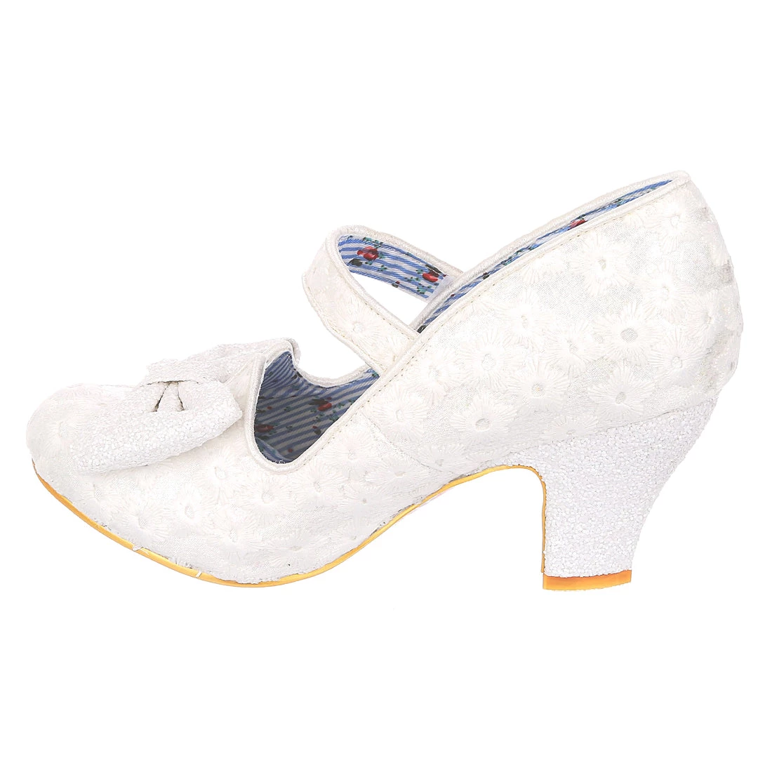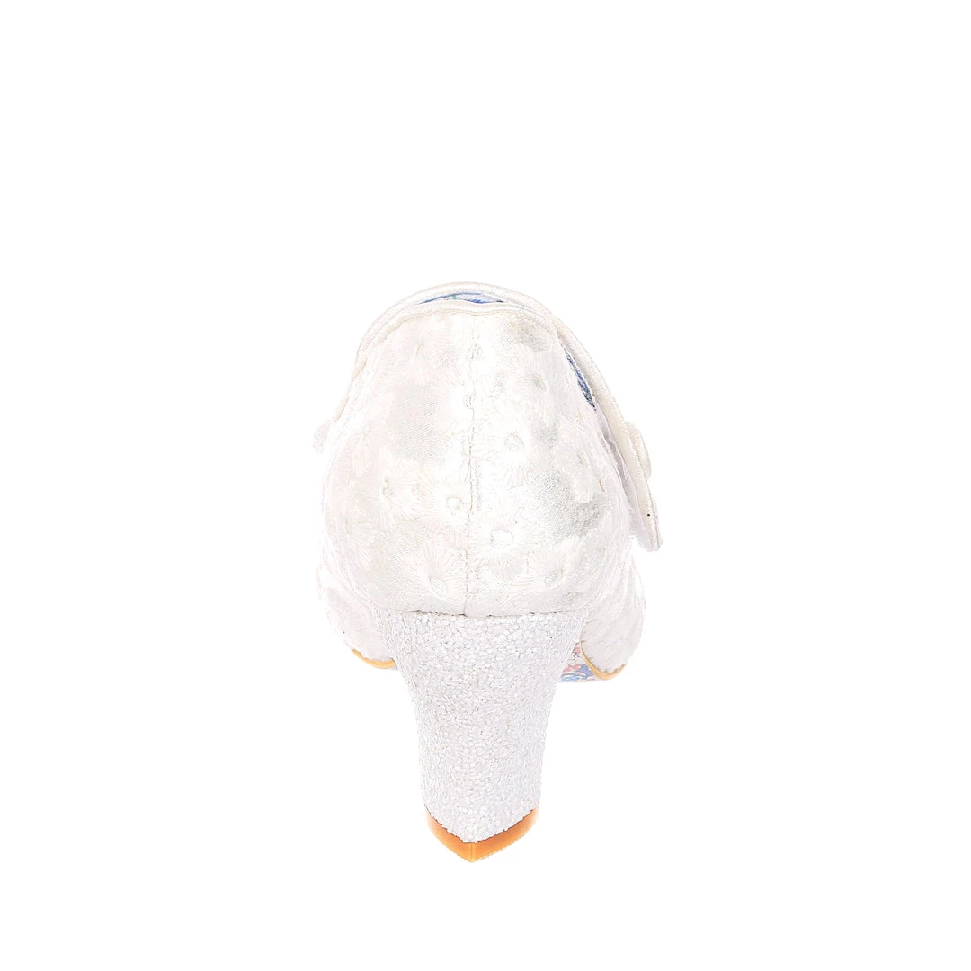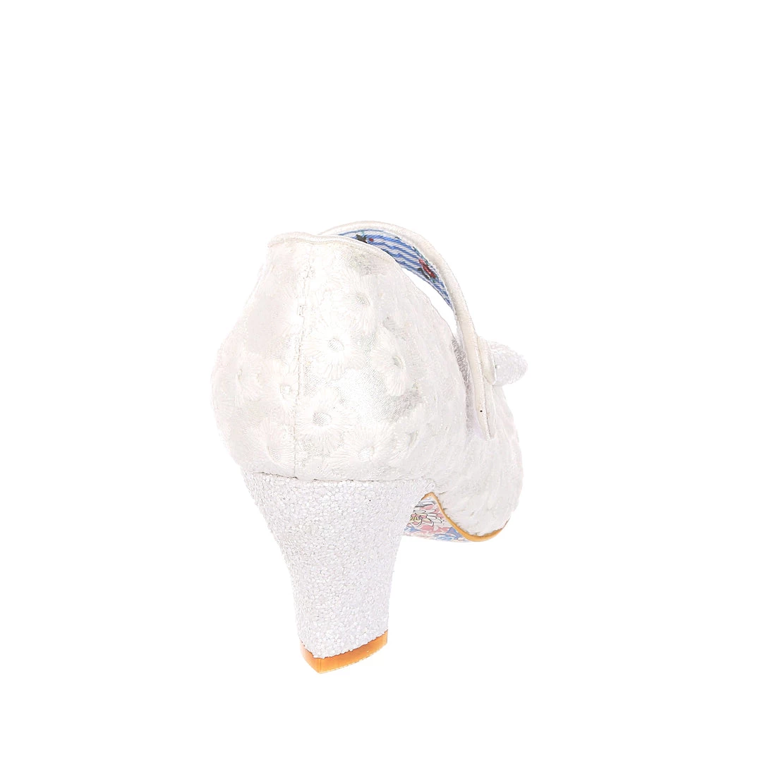 Add some skip to your step with these cuties! Delightful white embroidered flowers are scattered over an iridescent base and piping that catches the light beautifully, with a Mary Jane strap to keep it from slipping whilst dancing the night away! The wearable chunky mid heel is our best selling style that has been covered in a pearlescent white glitter that matches the perfect bow that sits on the toe. Feel like the belle of the ball in these classic bridal heels!