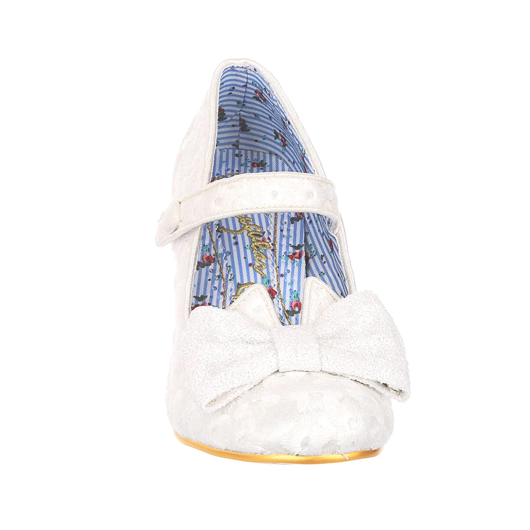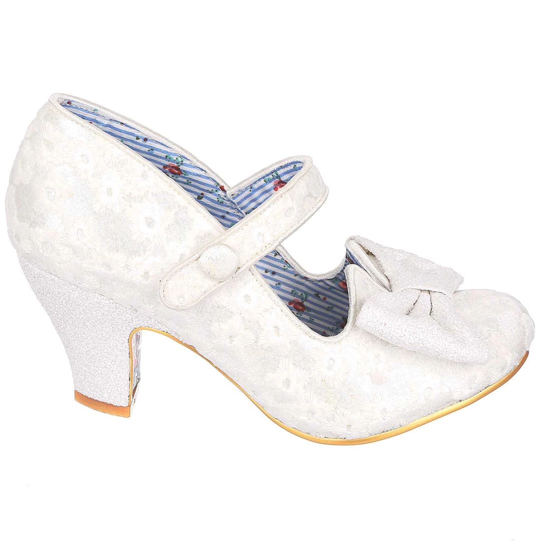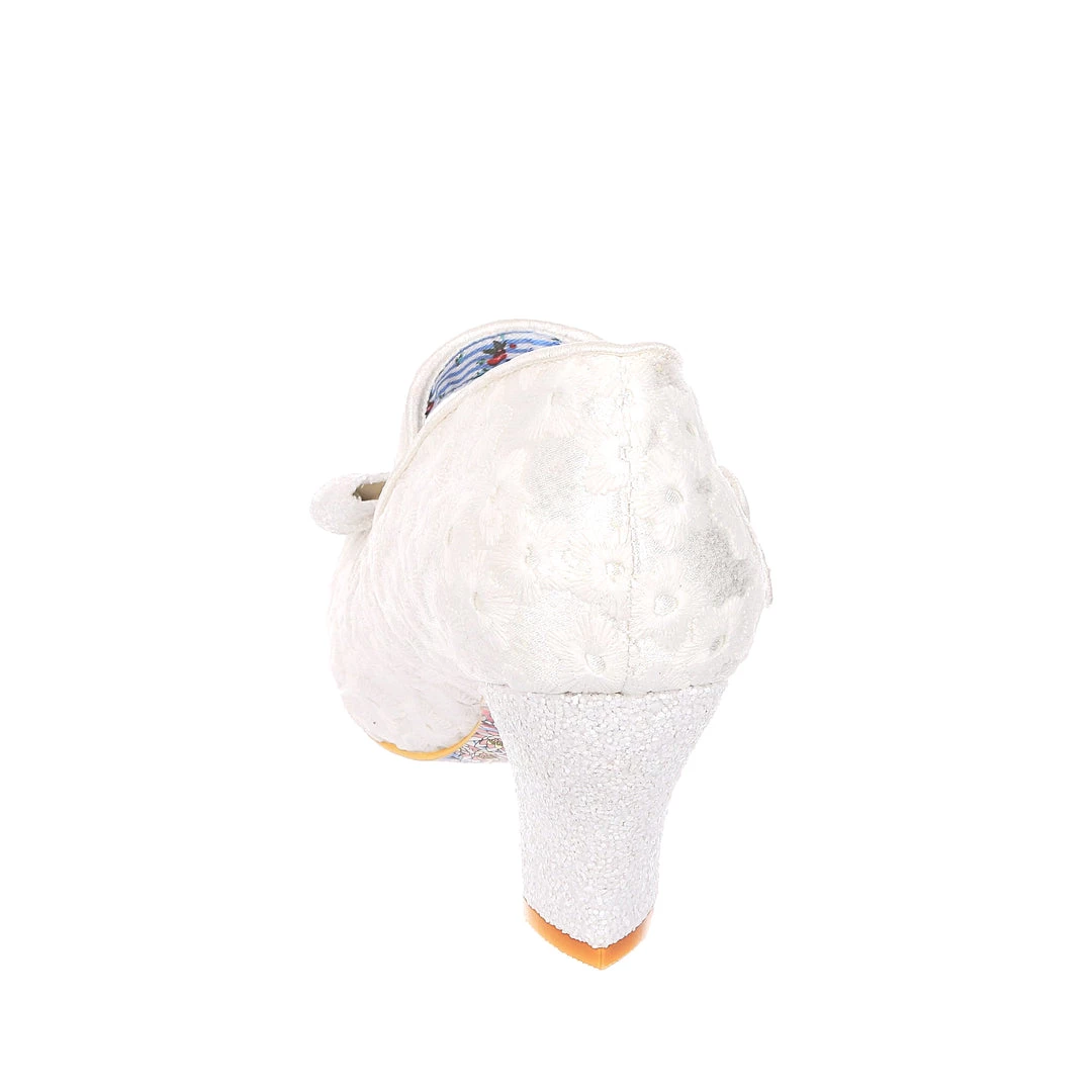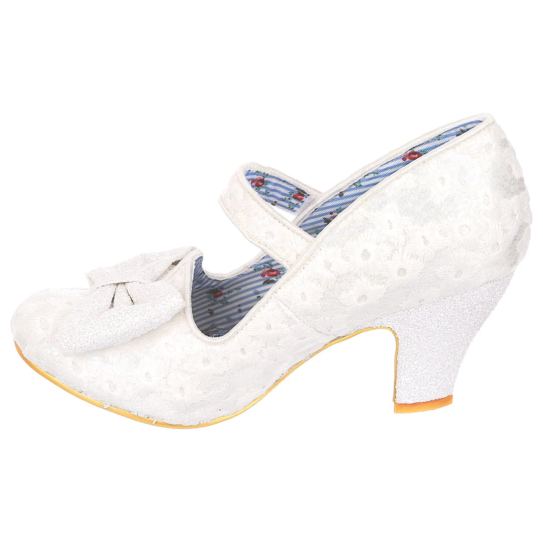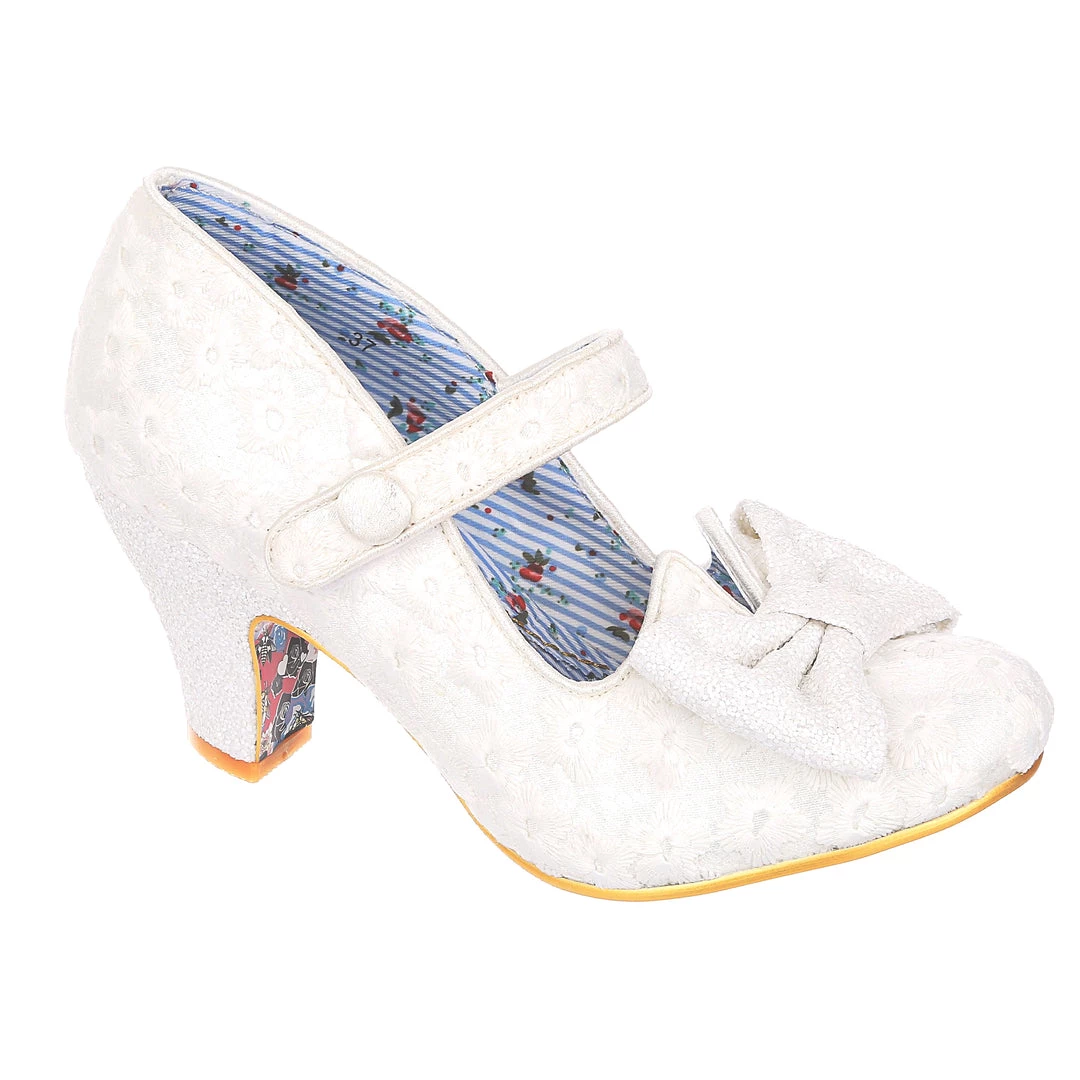 Add some skip to your step with these cuties! Delightful white embroidered flowers are scattered over an iridescent base and piping that catches the light beautifully, with a Mary Jane strap to keep it from slipping whilst dancing the night away! The wearable chunky mid heel is our best selling style that has been covered in a pearlescent white glitter that matches the perfect bow that sits on the toe. Feel like the belle of the ball in these classic bridal heels!