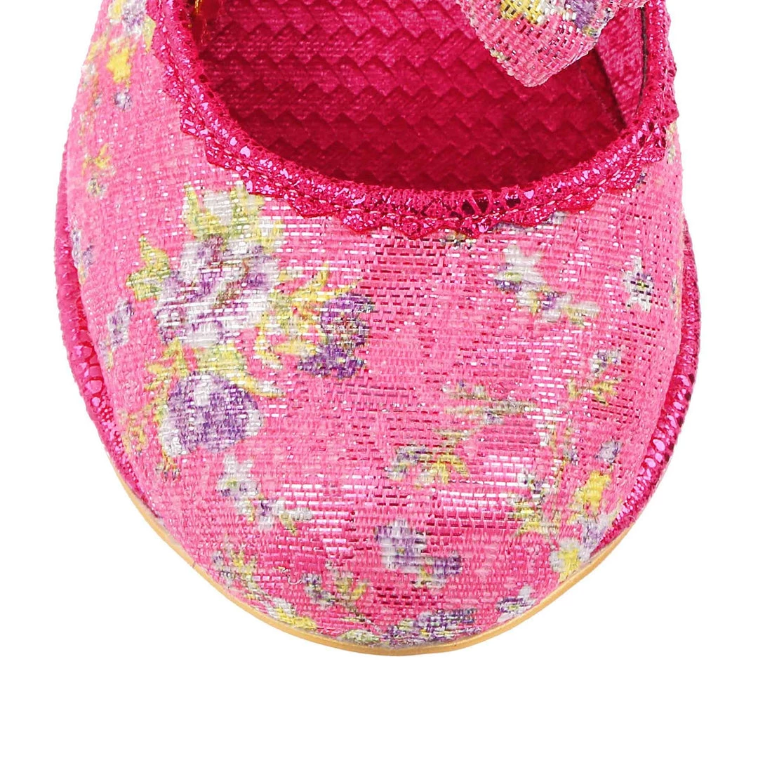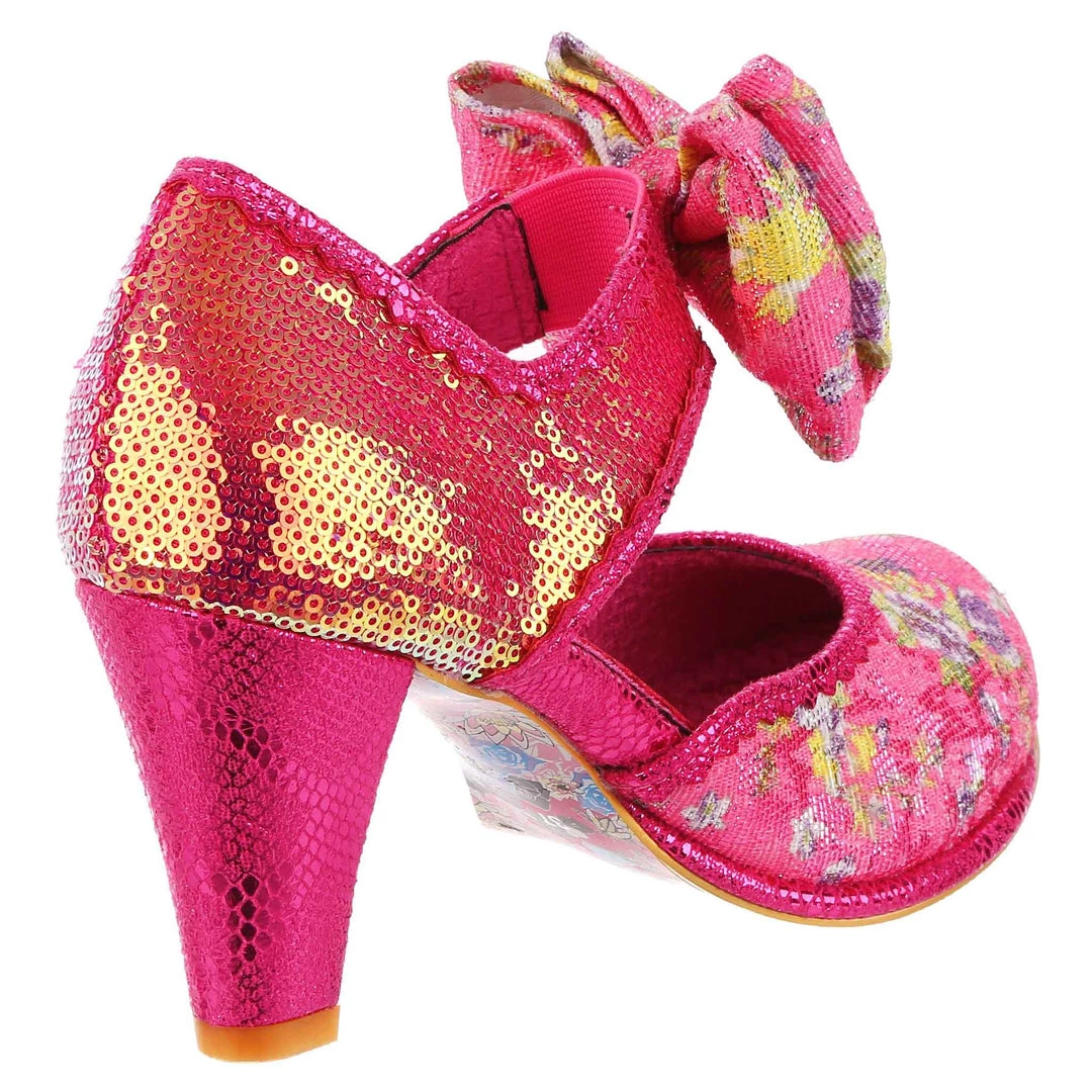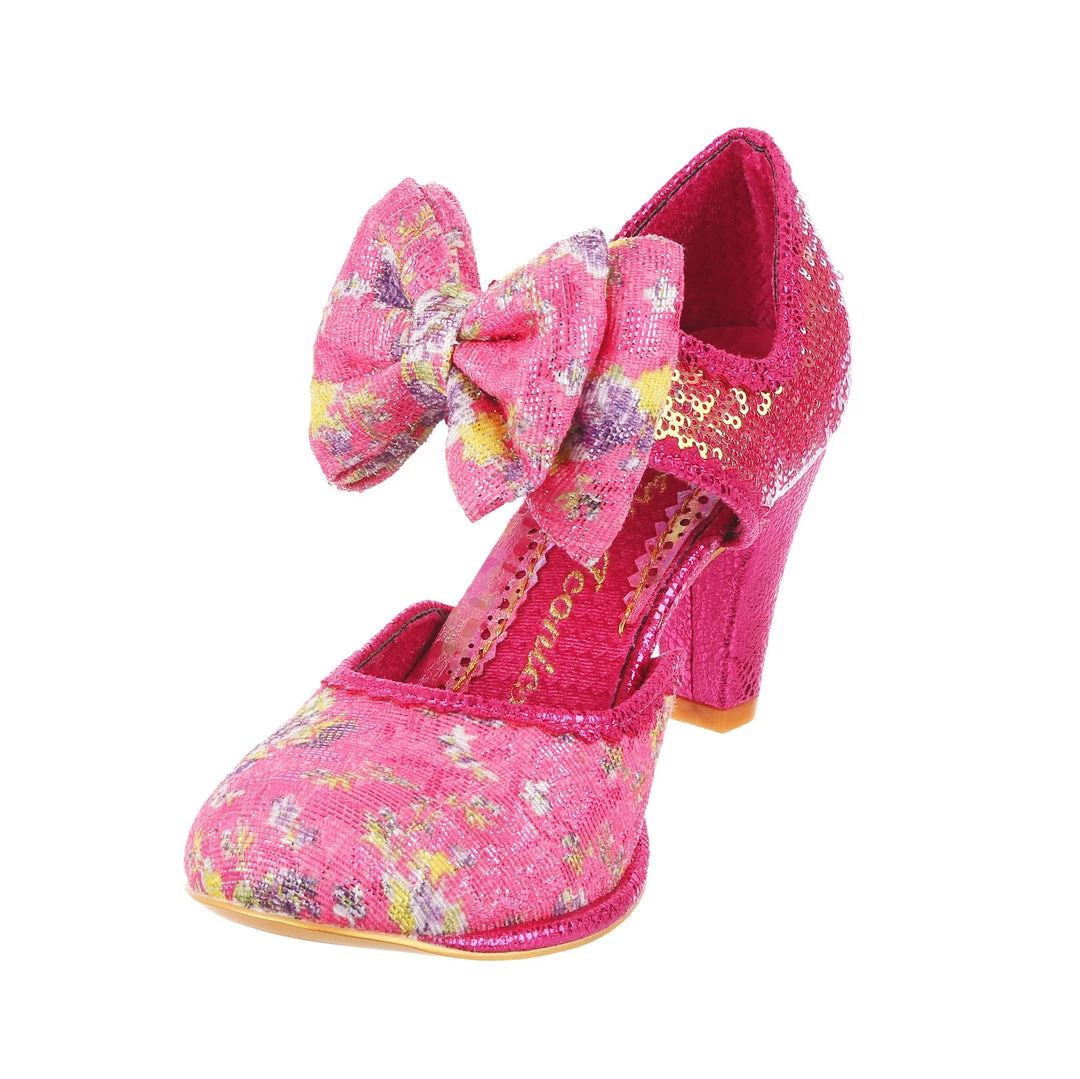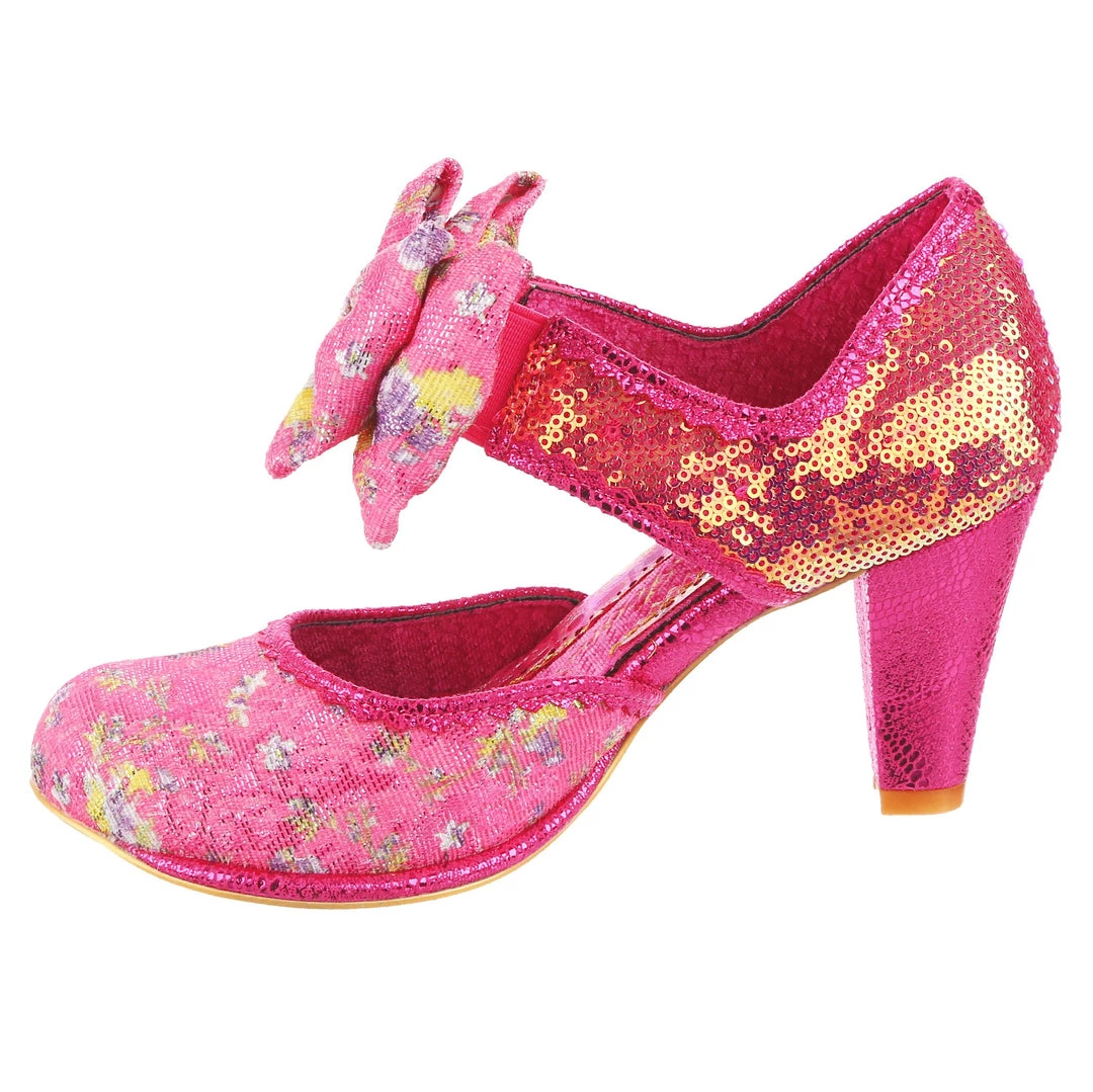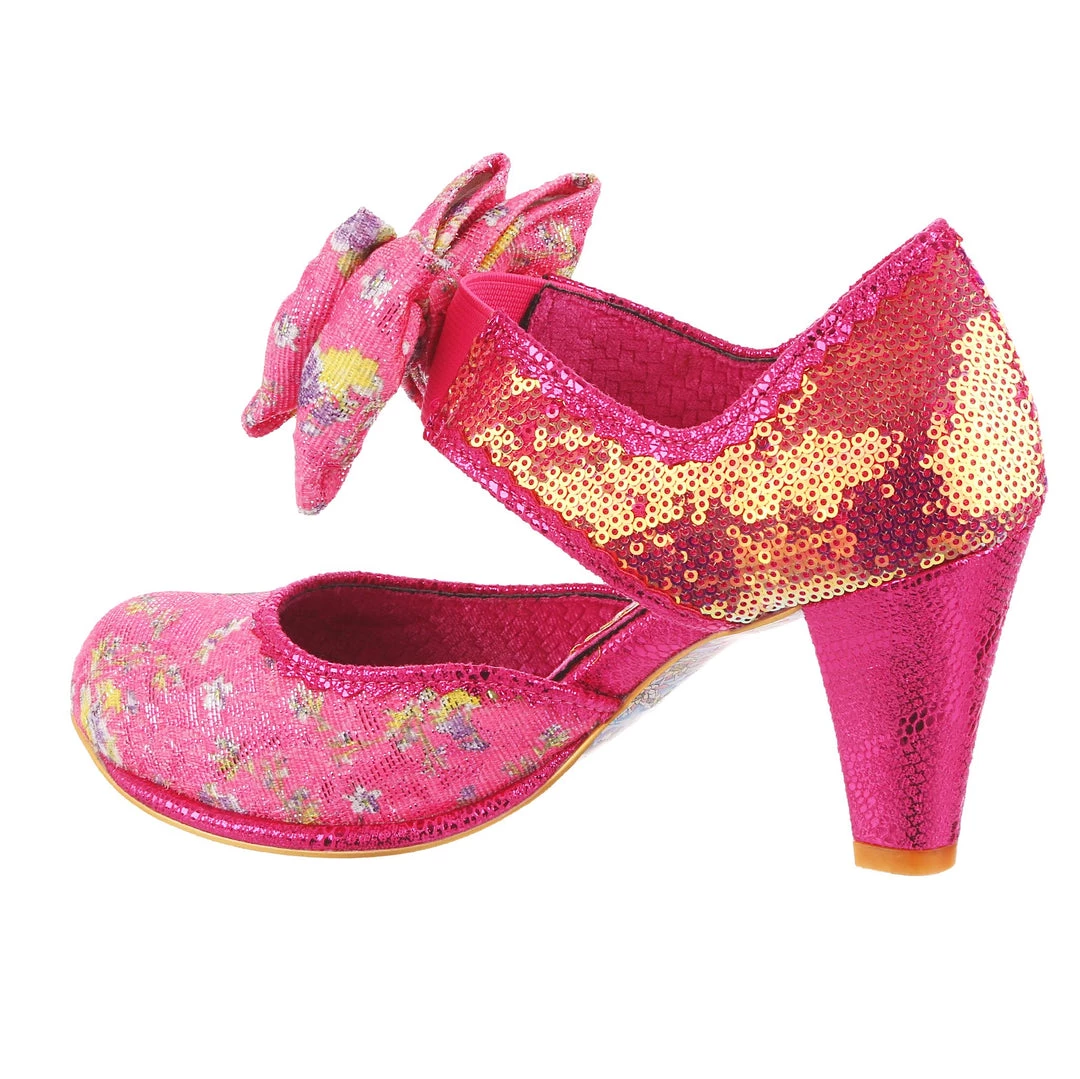 Giggles and Chips sports a cute double bow on the elasticated strap and a classic heel height inspired by our timeless Miaow boot and, destined to be a sweet addition to your IC collection! These pink and purple summer heels are here for all your garden parties and weddings, decked out in a soft velvet woven with strands of glitter and lilac flowers, a golden iridescent sequinned heel and hot pink piping.