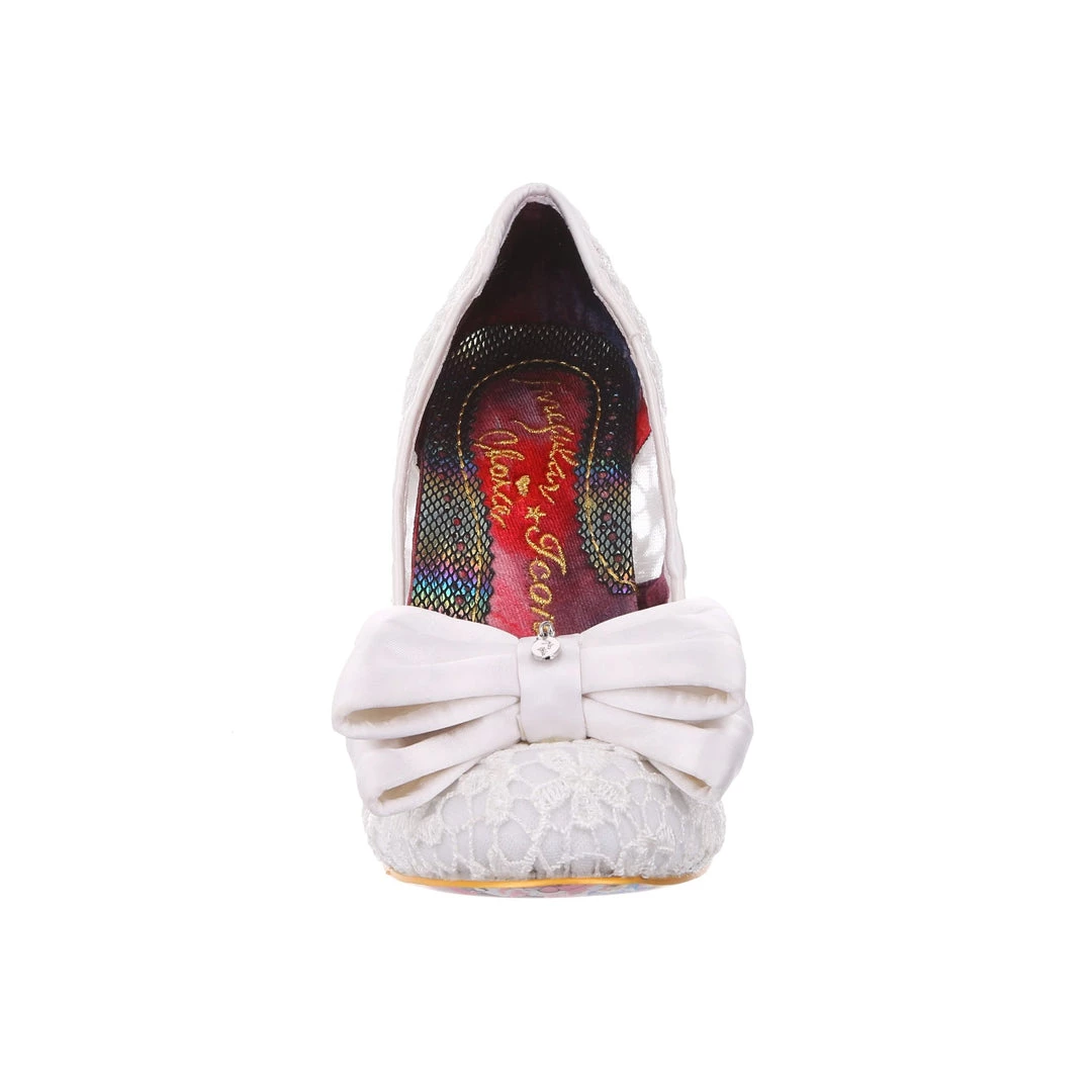 Float down the aisle in these elegant white bridal high heels. Covered in delicate lace with sexy peek-a-boo sides and a statement satin style double bow and silvertone trinket on the toe. Perfect for a bride wanting to complete their wedding outfit with a sweet statement style!