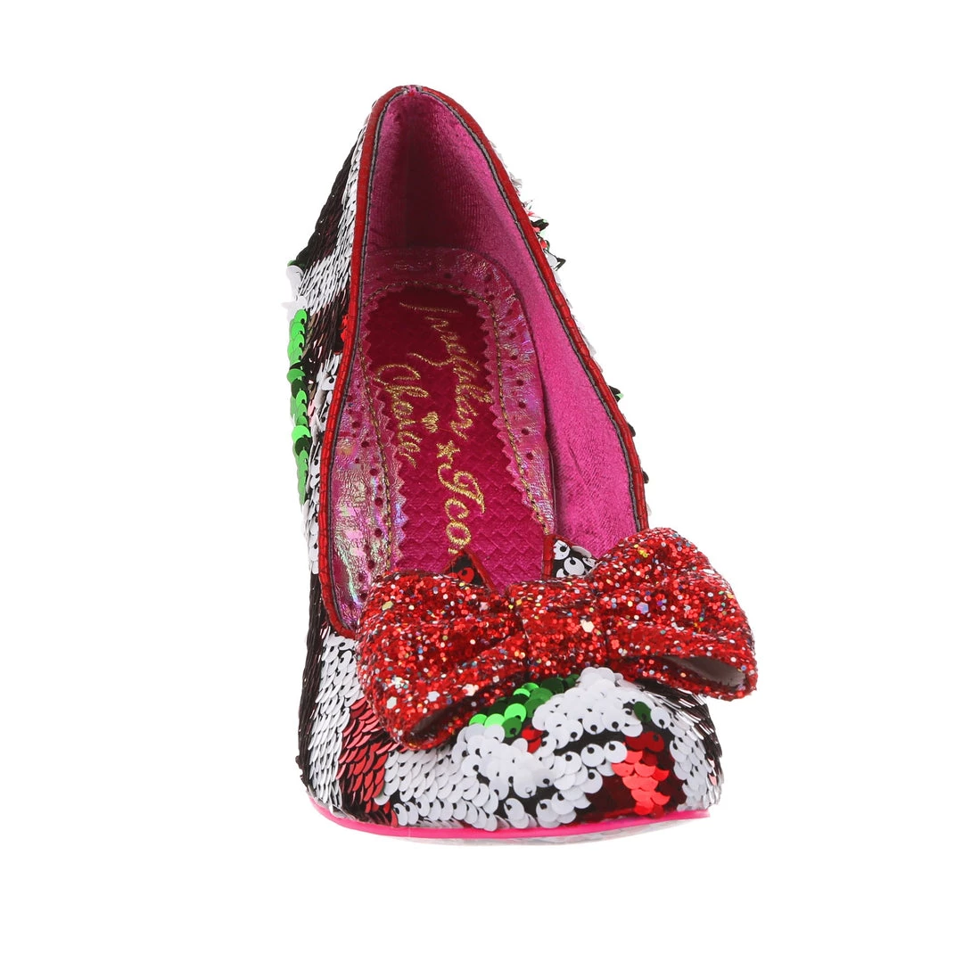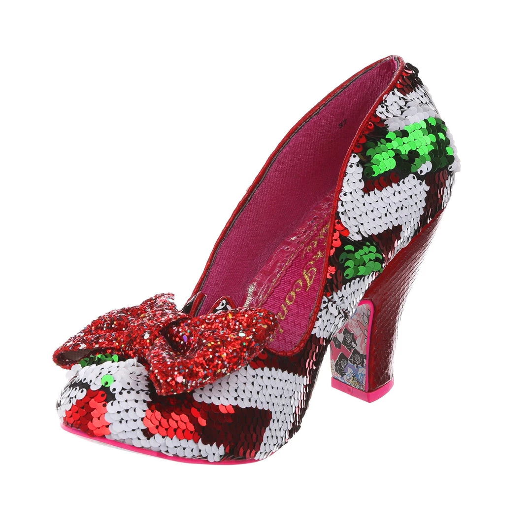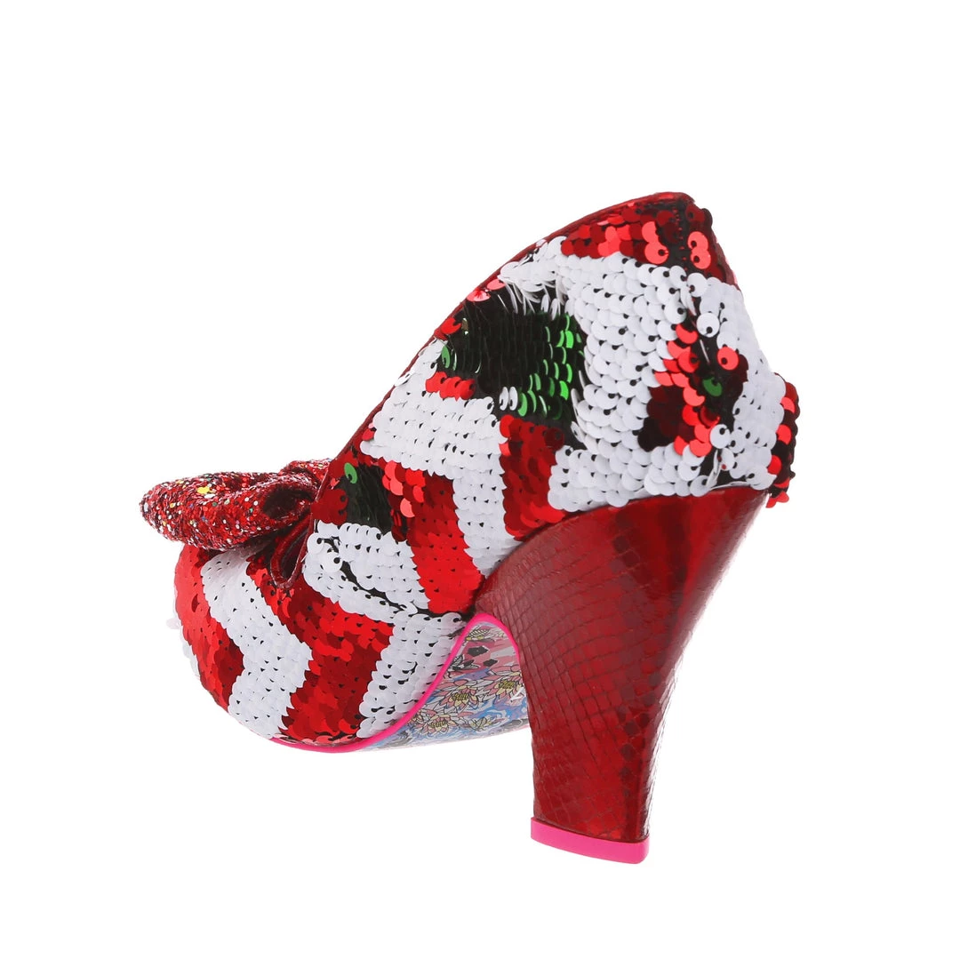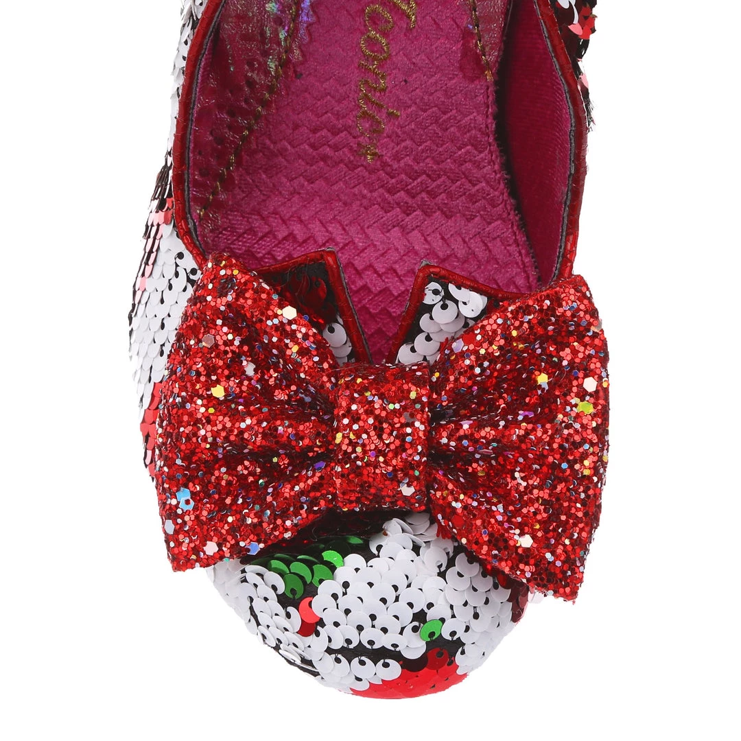 Give your look some serious WOW factor in these sequinned and spectacular heels! Our classic high heels, Nick of Time, have been all decked out in graphic red and green reversible and white sequins in a chevron pattern. Tied together with the striking red glitter bow on the toe, and metallic covered heel – these beauties are here to make your day, and your wardrobe, better!