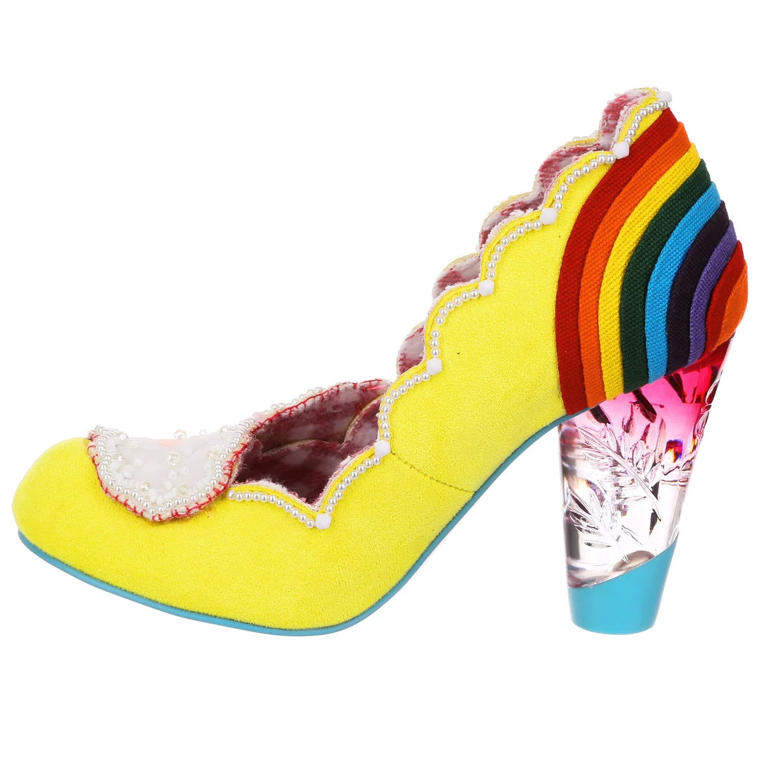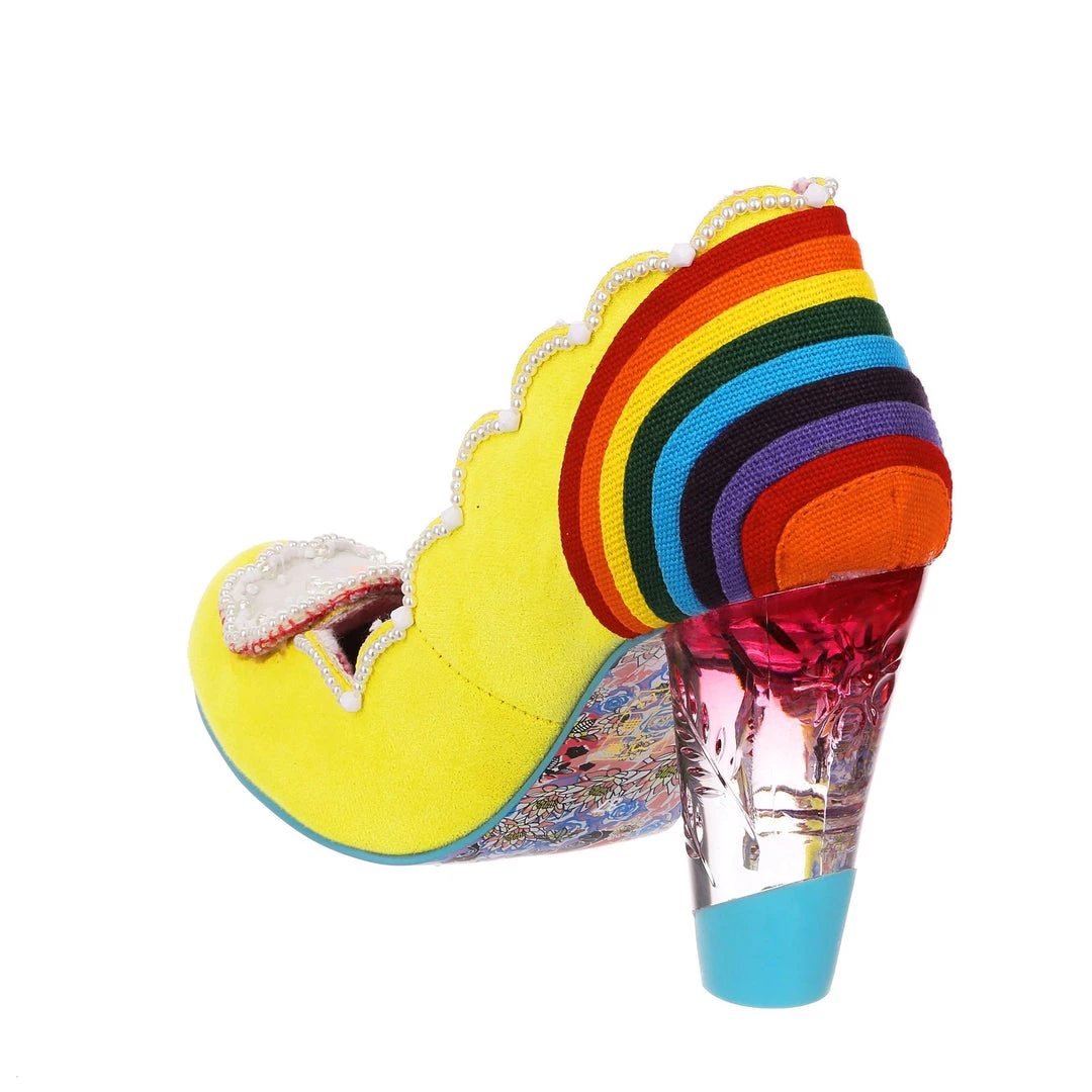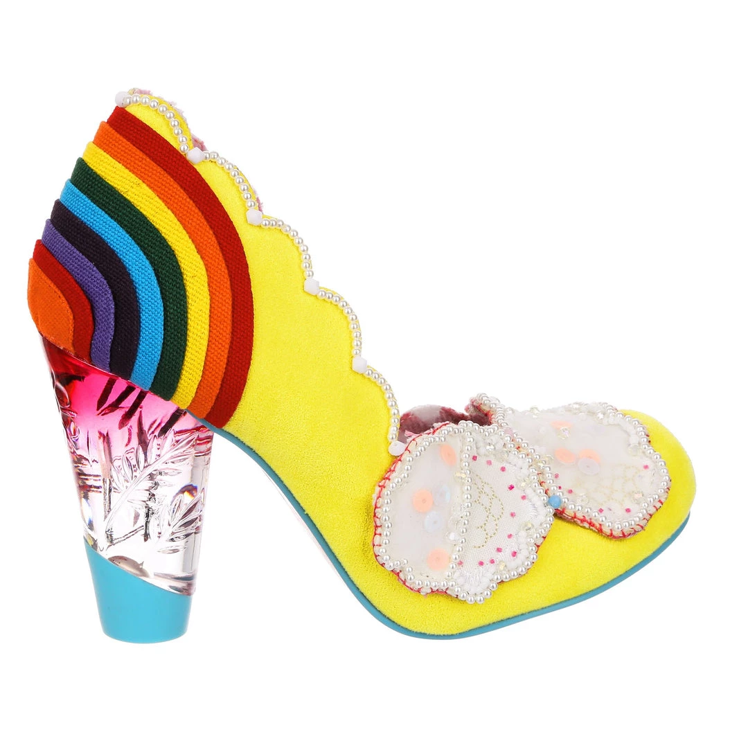 Ready for a trip over the rainbow? Add some whimsy to your feet and fall head over heels for the gorgeous ‘Shirley Bass’ shoes! A sunny yellow base is contrasted with a dazzling rainbow and darling clouds along the toe! All paired with our fabulous lucite heel, these are the pot of gold in any wardrobe!
