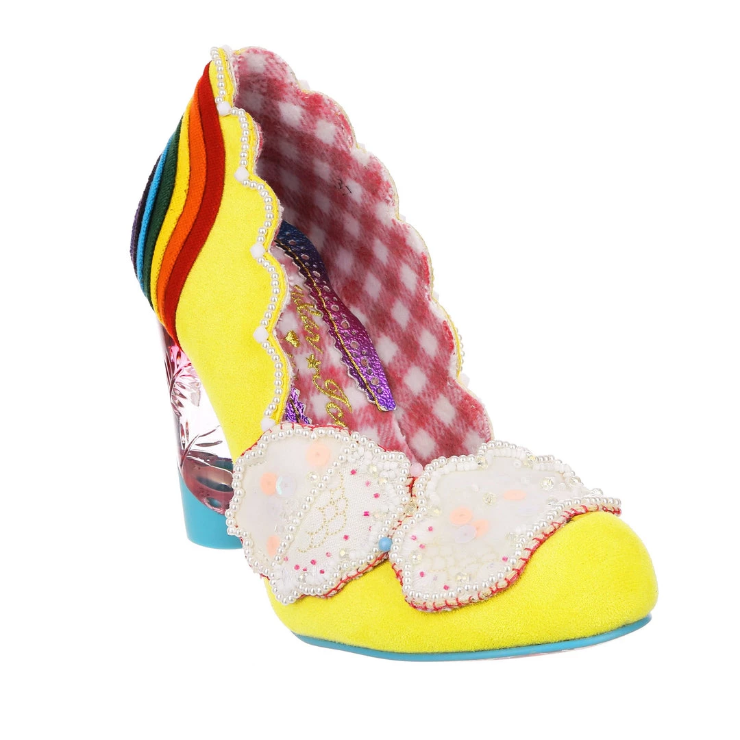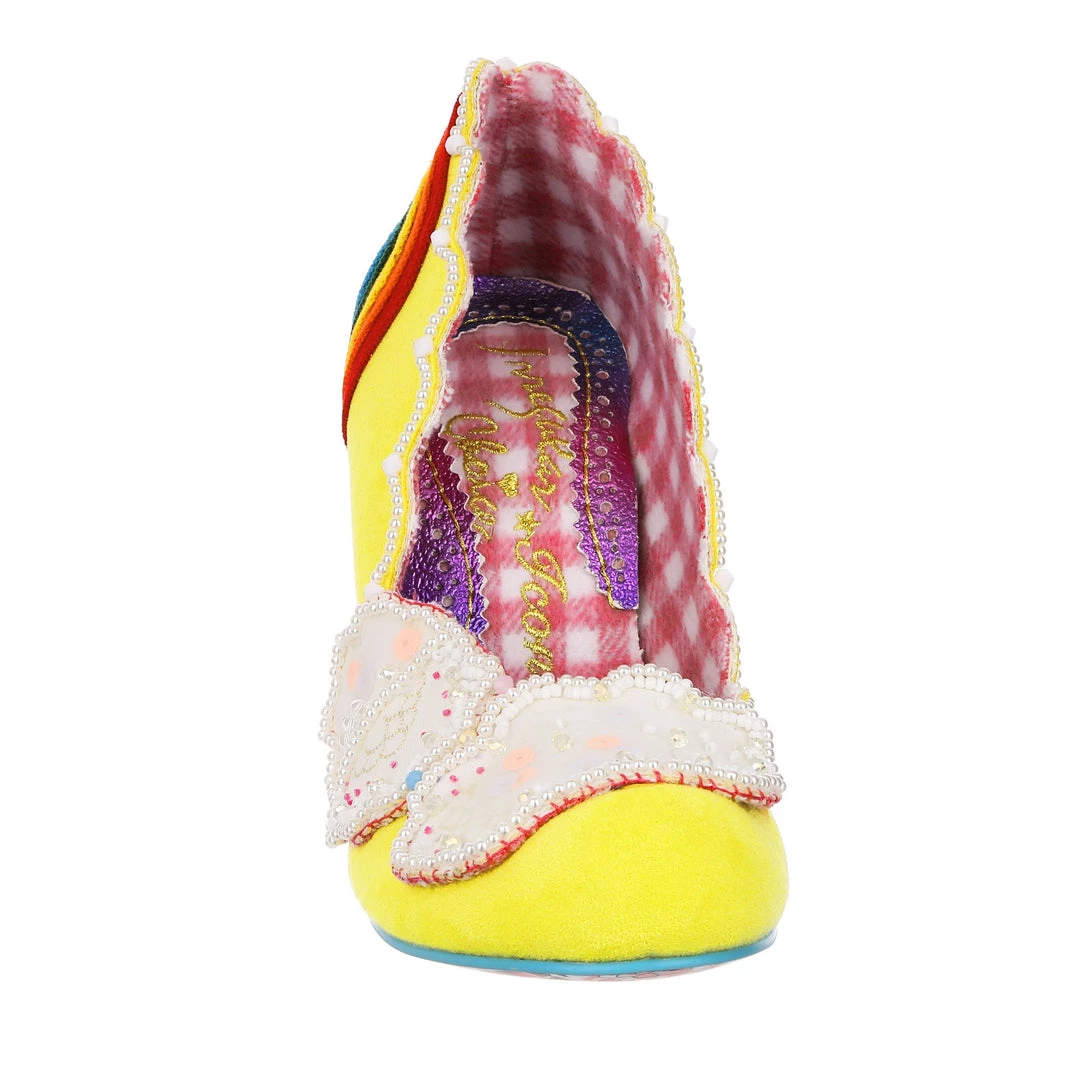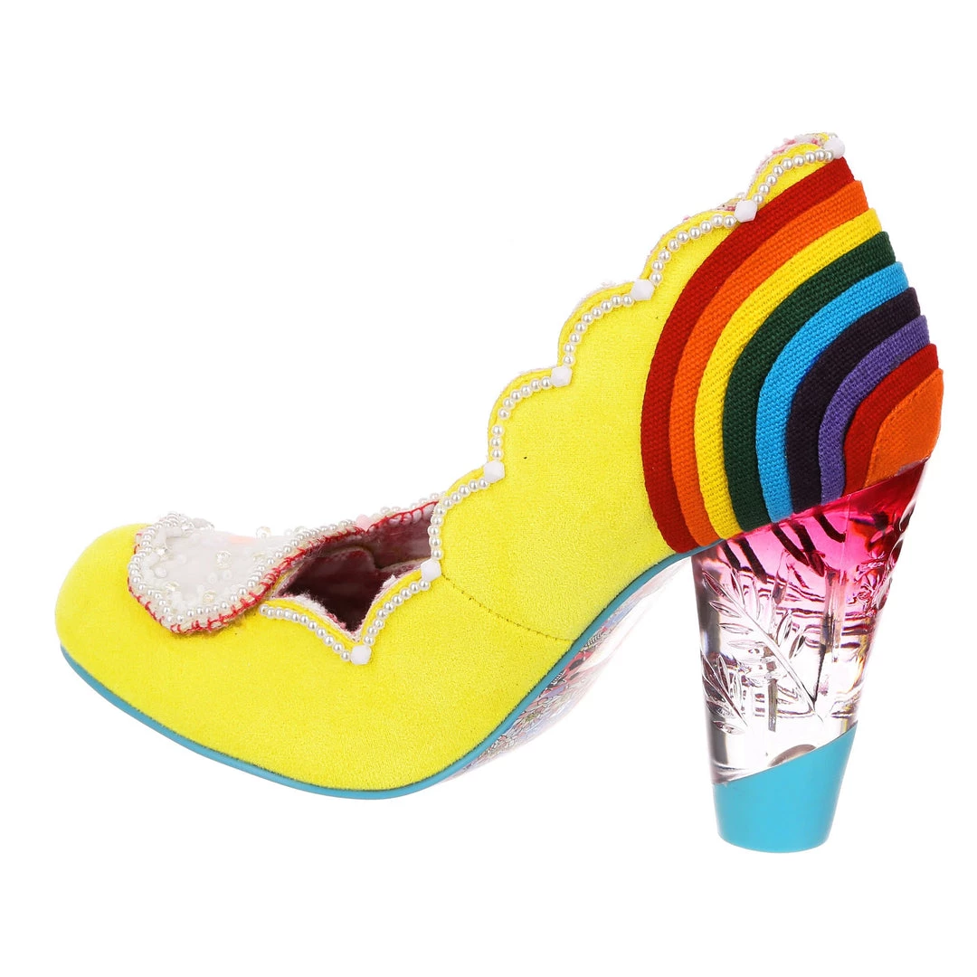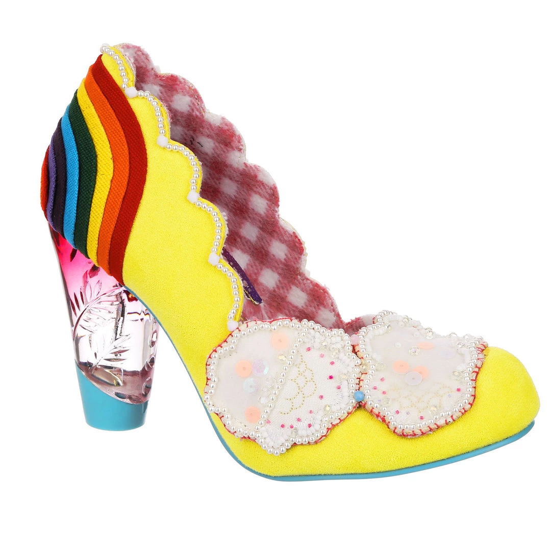 Ready for a trip over the rainbow? Add some whimsy to your feet and fall head over heels for the gorgeous ‘Shirley Bass’ shoes! A sunny yellow base is contrasted with a dazzling rainbow and darling clouds along the toe! All paired with our fabulous lucite heel, these are the pot of gold in any wardrobe!