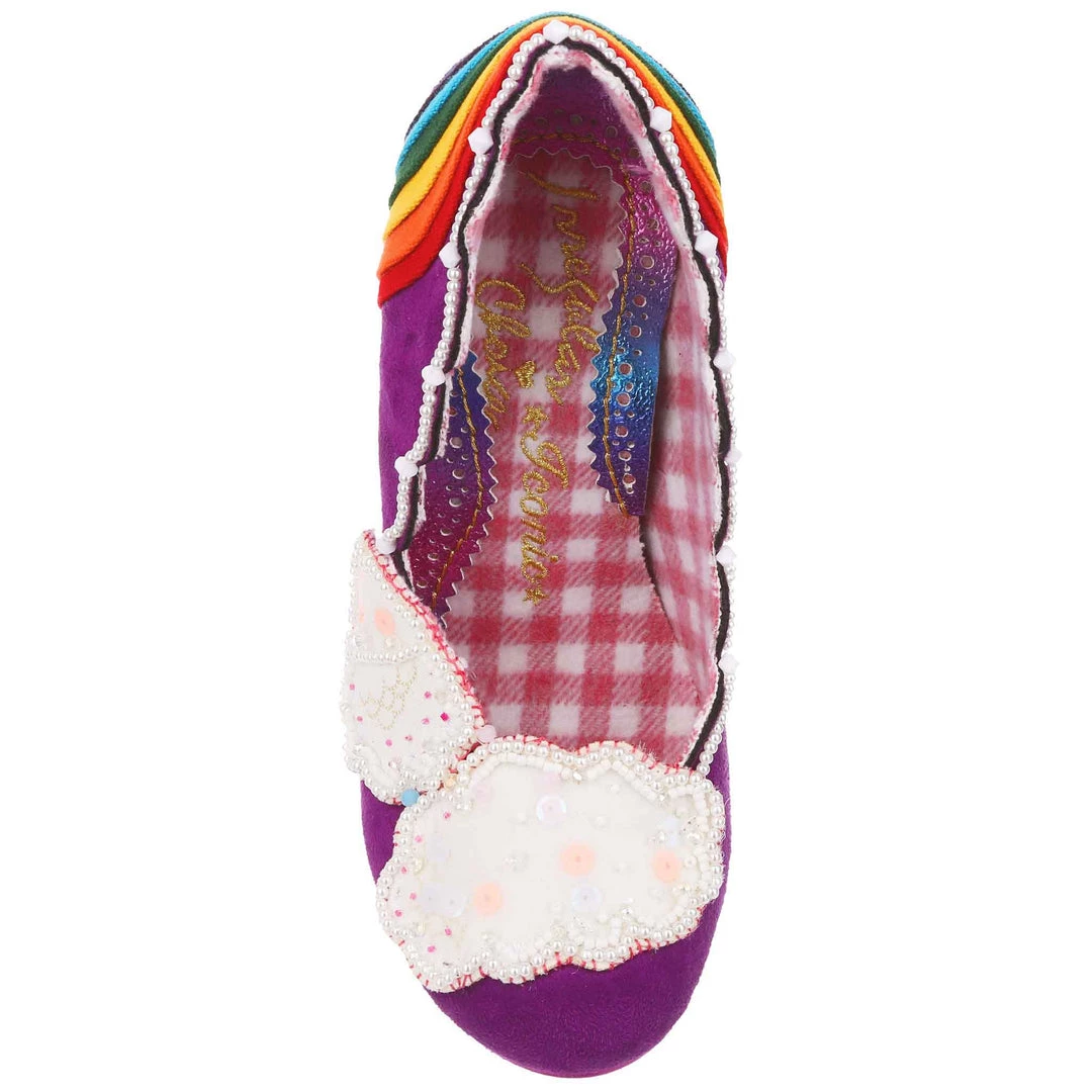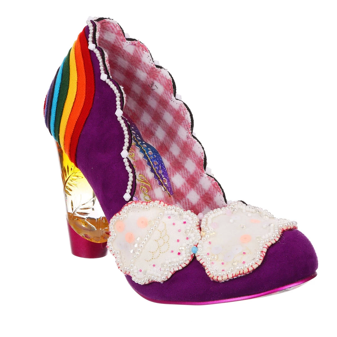 Ready for a trip over the rainbow? Add some whimsy to your feet and fall head over heels for the gorgeous ‘Shirley Bass’ shoes! A perfect deep purple base is contrasted with a dazzling rainbow and darling clouds along the toe! All paired with our fabulous lucite heel, these are the pot of gold in any wardrobe!