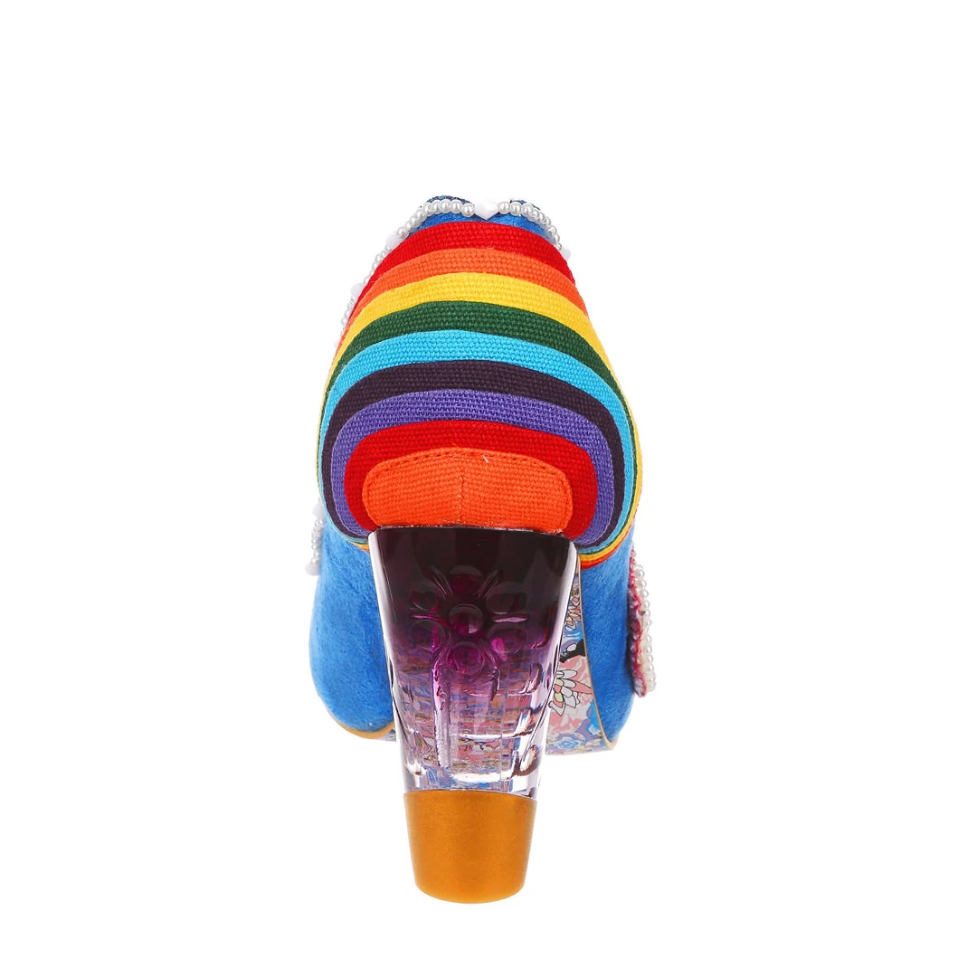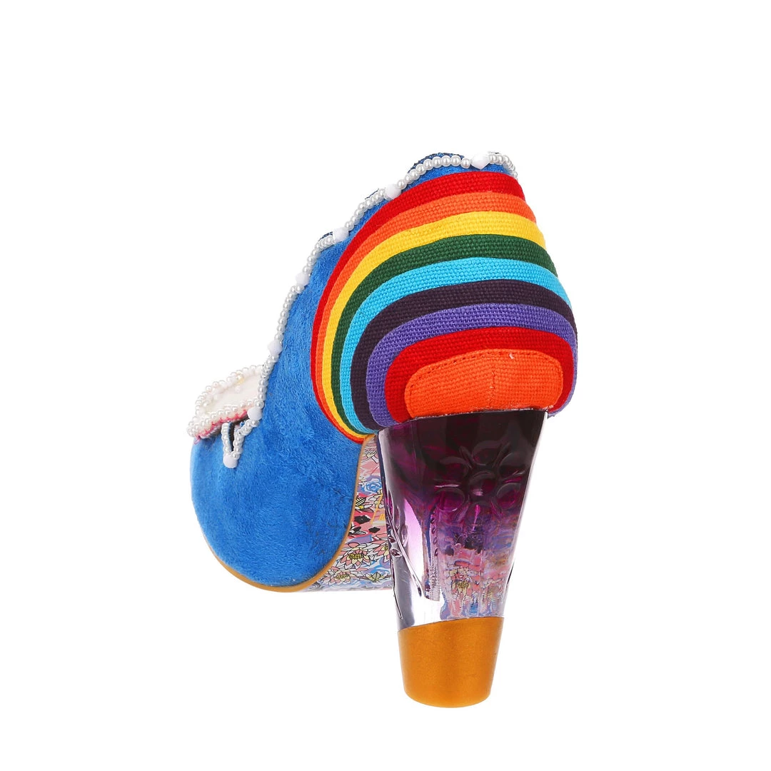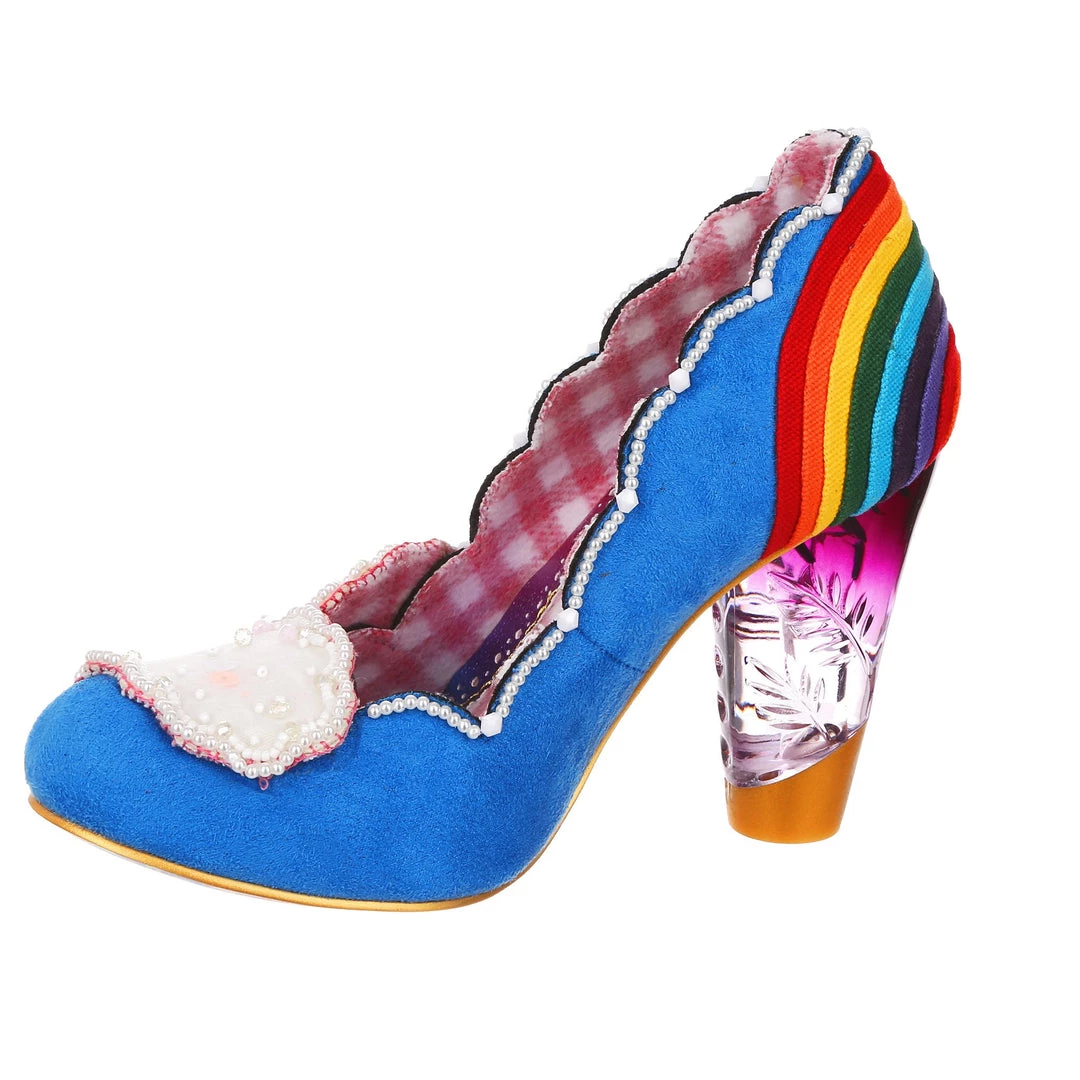 Ready for a trip over the rainbow? Add some whimsy to your feet and fall head over heels for the gorgeous ‘Shirley Bass’ shoes! A bright blue base is contrasted with a dazzling rainbow and darling clouds along the toe! All paired with our fabulous lucite heel, these are a pot of gold in any wardrobe!