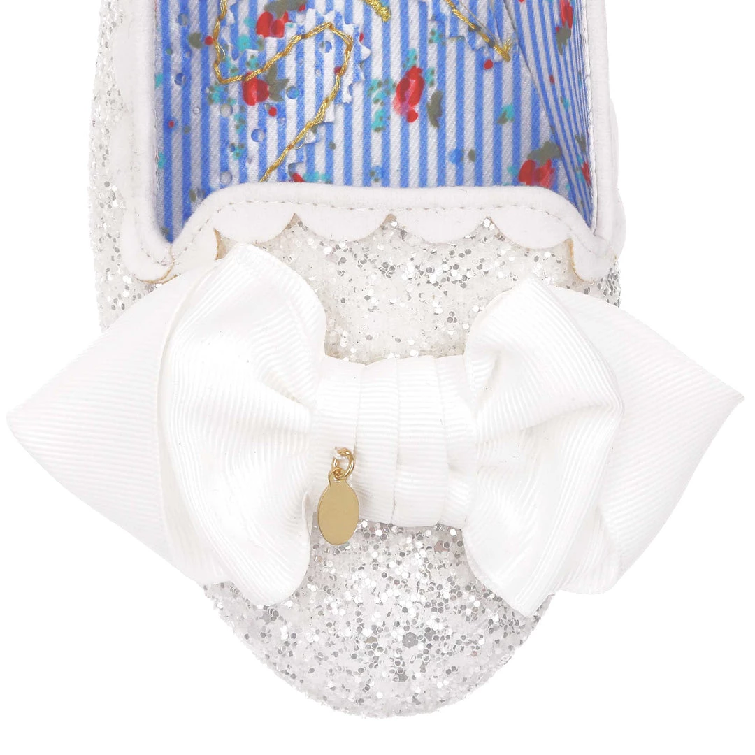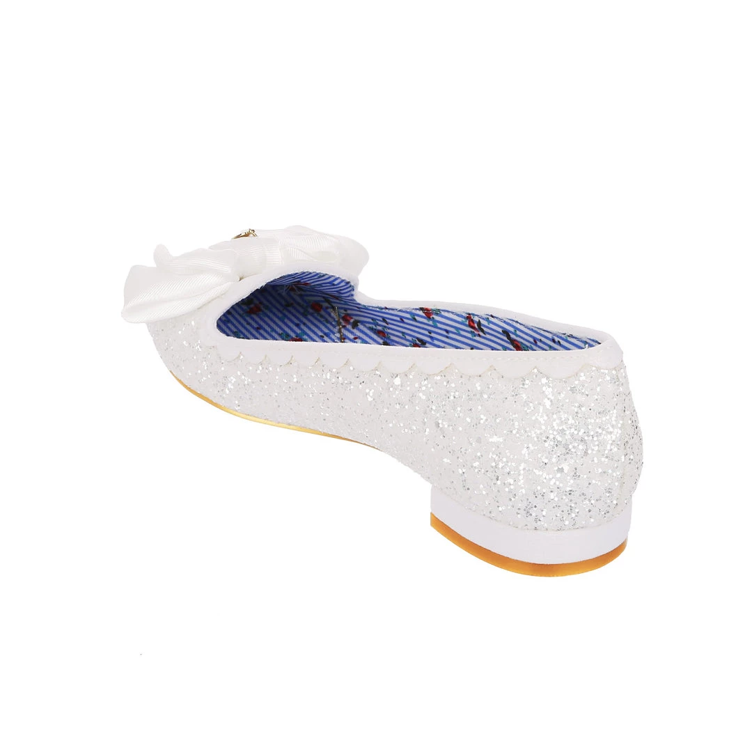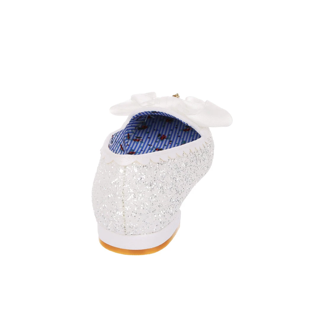 Sparkle from wedding day to night! This angelic little slipper is a comfortable flat sent from heaven. These flat wedding shoes come with a lacy glittery upper, scalloped edging and a delicate folded bow. The perfect slip-ons for every bride!
