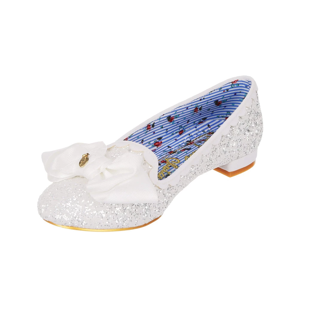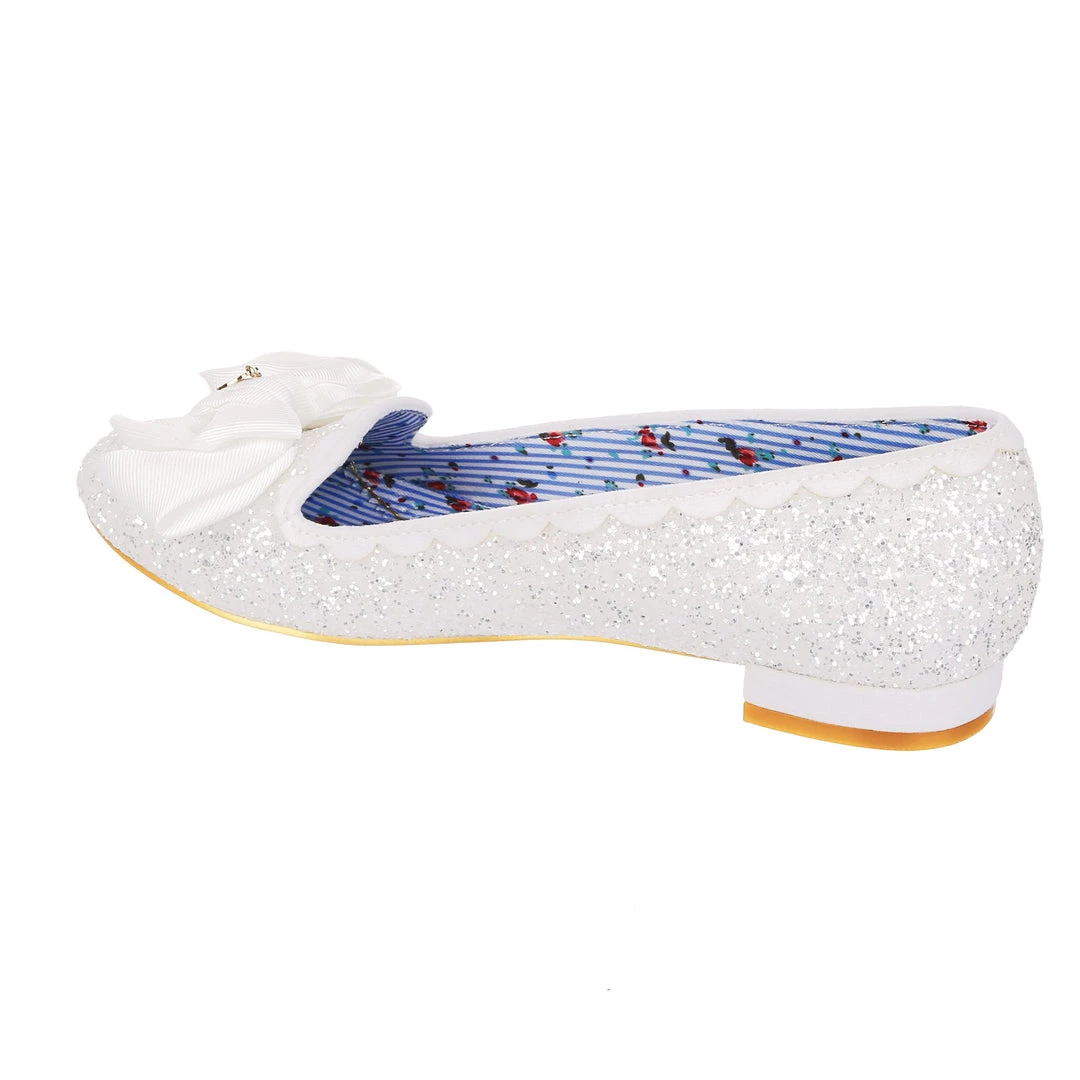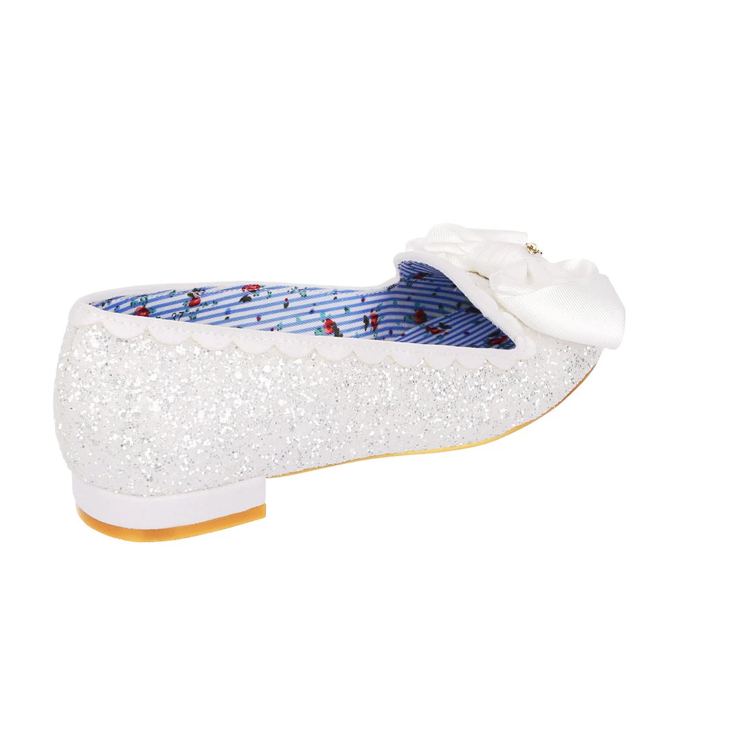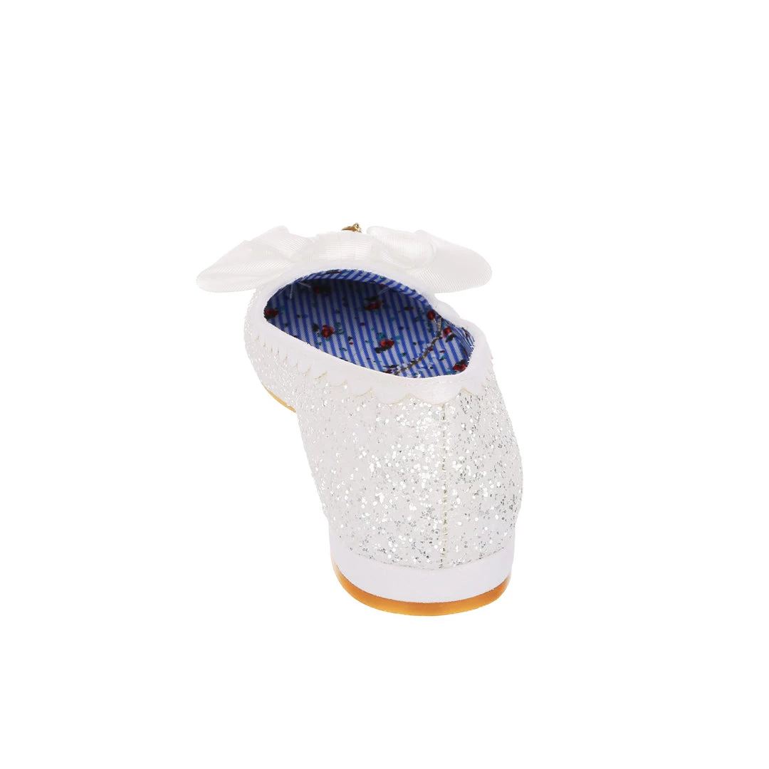 Sparkle from wedding day to night! This angelic little slipper is a comfortable flat sent from heaven. These flat wedding shoes come with a lacy glittery upper, scalloped edging and a delicate folded bow. The perfect slip-ons for every bride!