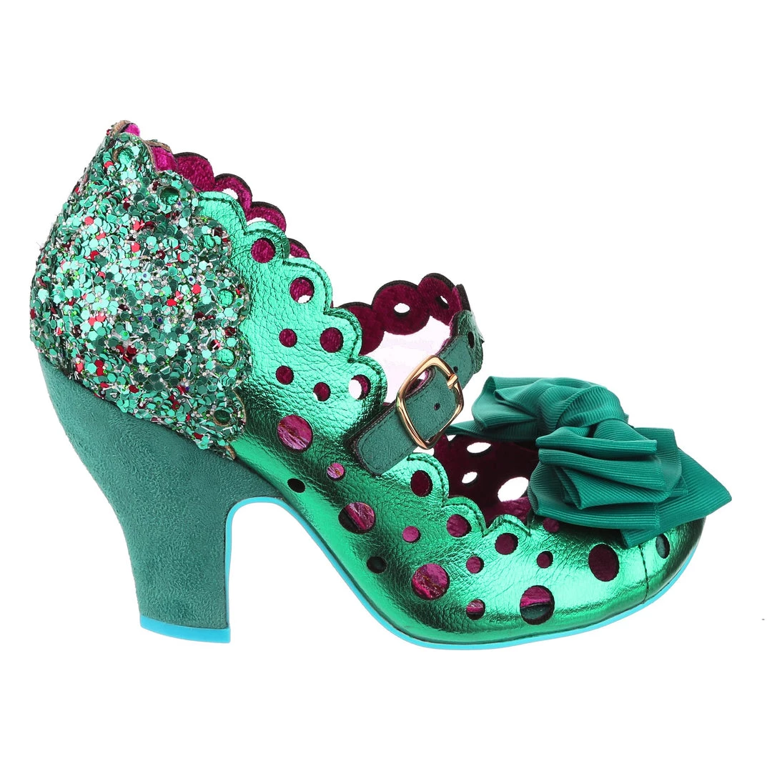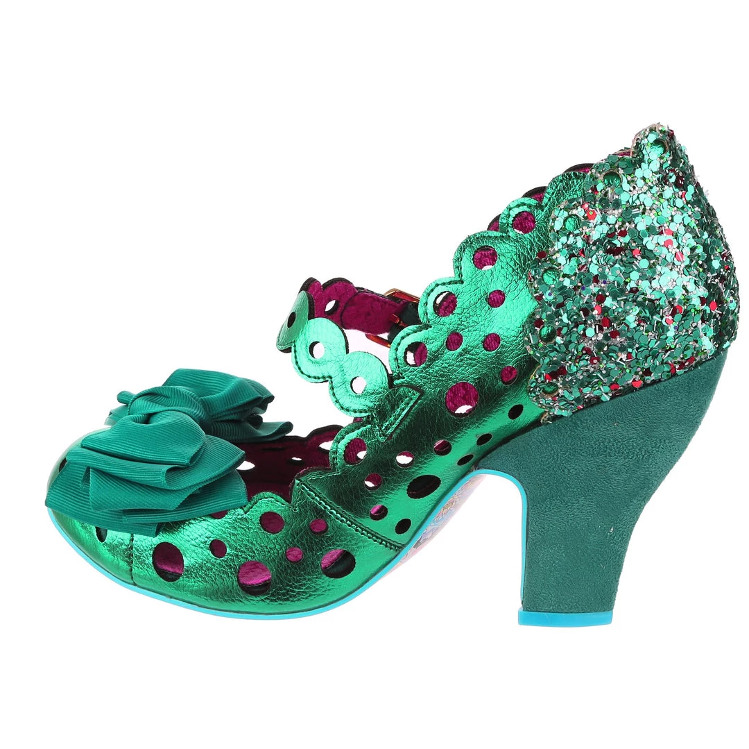 Dotty and fabulous, these heels are a great throwback style which we have reimagined for the season in stunning metallic emerald green, which has adorable holes cut into it in multiple diameters! Featuring a buckled Mary Jane strap in a matching finish, accented by the green suedette heel and iridescent glitter panel on the heel. The toe bow is a gorgeous grosgrain ribbon layered beautifully, the perfect final touch!