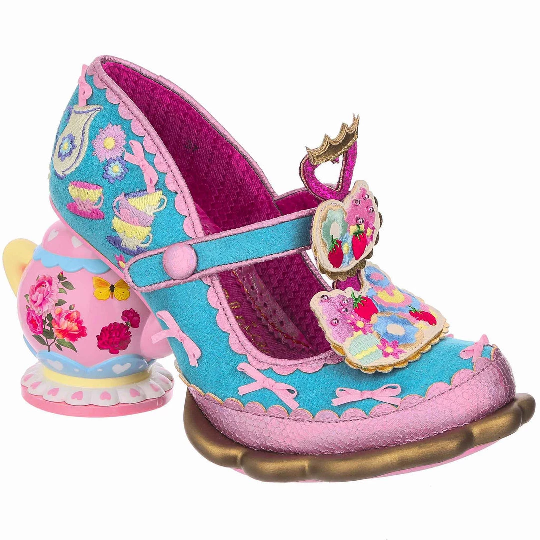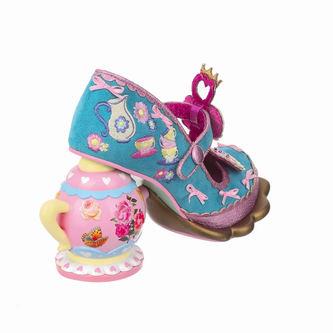 Who’s for a spot of tiffin? Hit the sweet spot in these statement heels! The gorgeous teal upper is embroidered with adorable afternoon tea supplies, and dotted with tiny little bows which lead up to the fabulous decoration on the T-Bar strap! Detailed and gorgeous embellished cakes and treats sit on the front of your foot and look good enough to eat, and if you need something to wash that down then take a look at the heel! Our newest fabulous character heel is shaped like a teapot! Fabulously detailed with a floral design, this pink teapot is spilling out golden tea which forms the sole on these showstoppers!