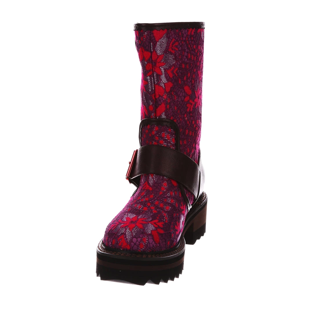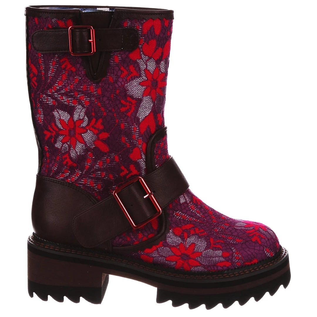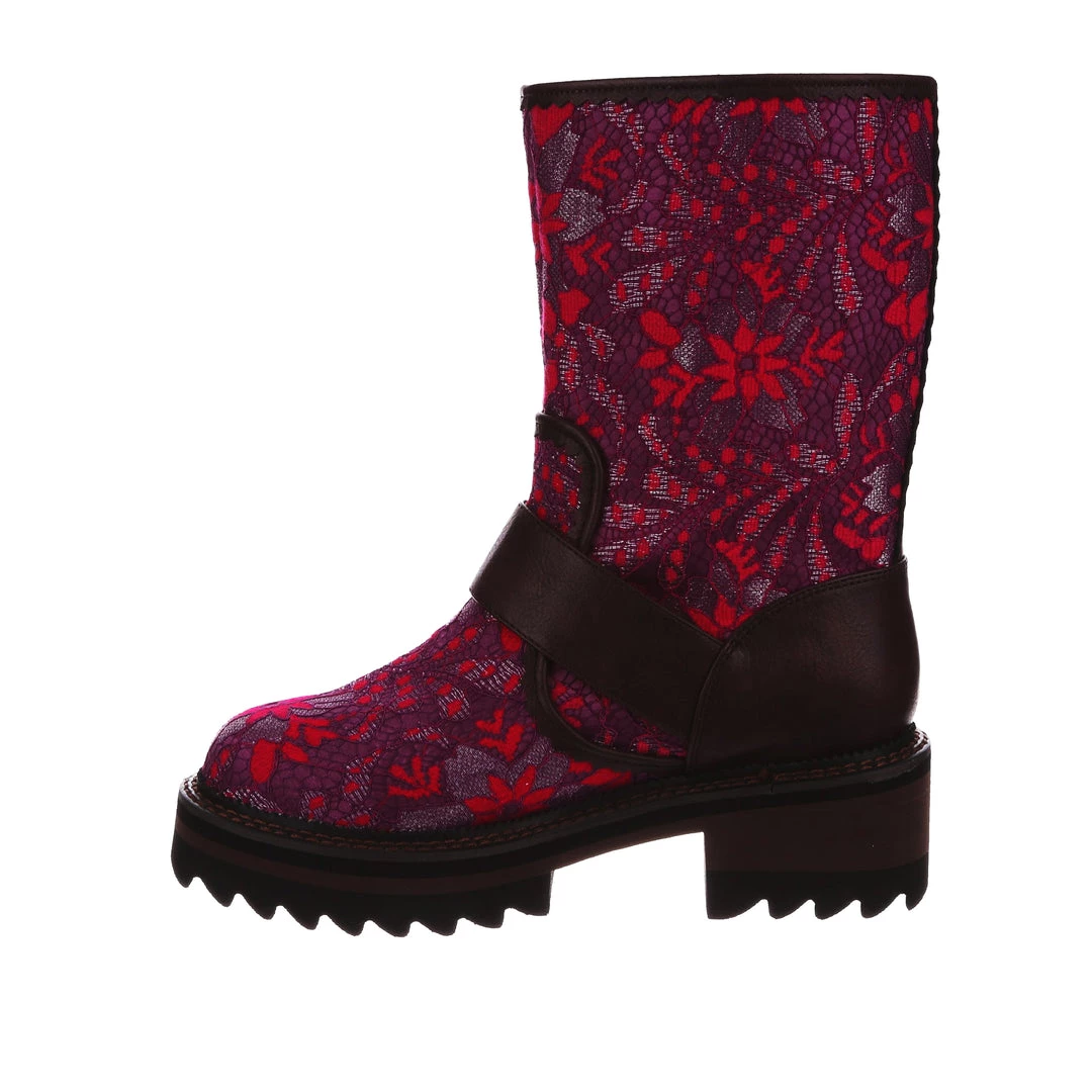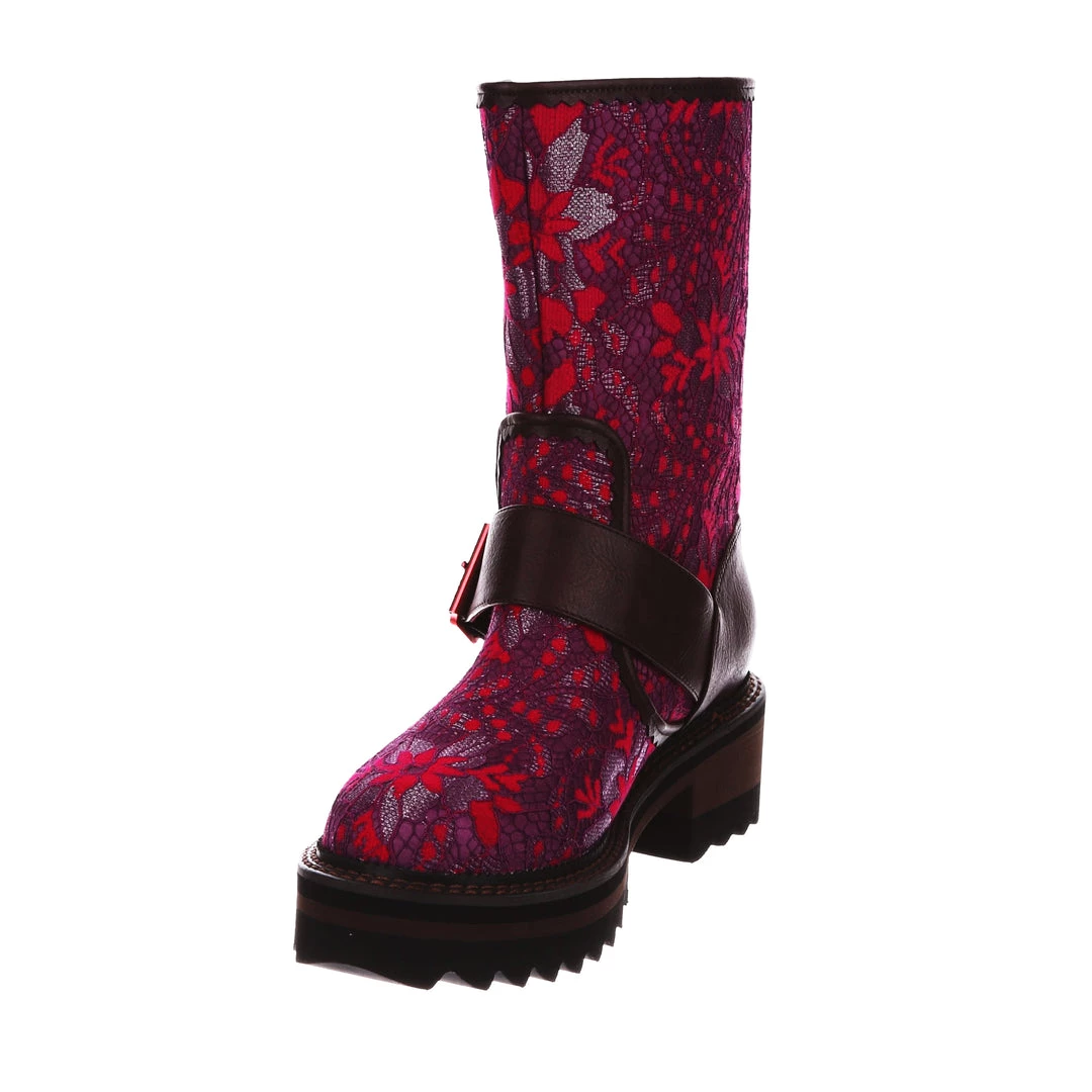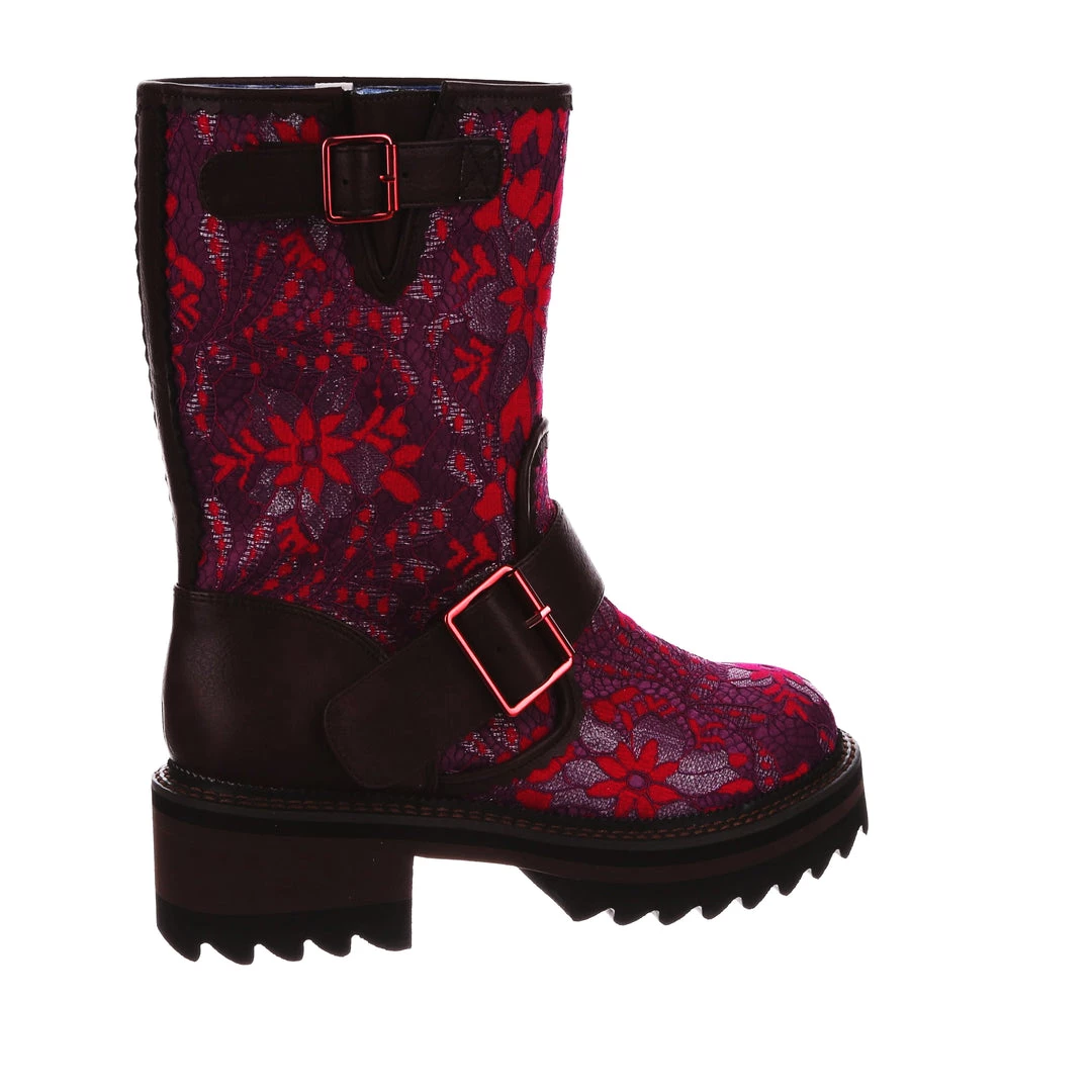 Perfect for those chilly walks, these boots are here to infuse some fun into your wardrobe for the colder months! Featuring a striking purple and hot pink floral fabric, accented with an aubergine leather texture and rose gold buckles – these boots are sure to take any outfit to the next level! The chunky tread means that they are super comfortable and also create a great impact when worn! Perfect to pair with some fun tights or snazzy trousers, add them to your life today!