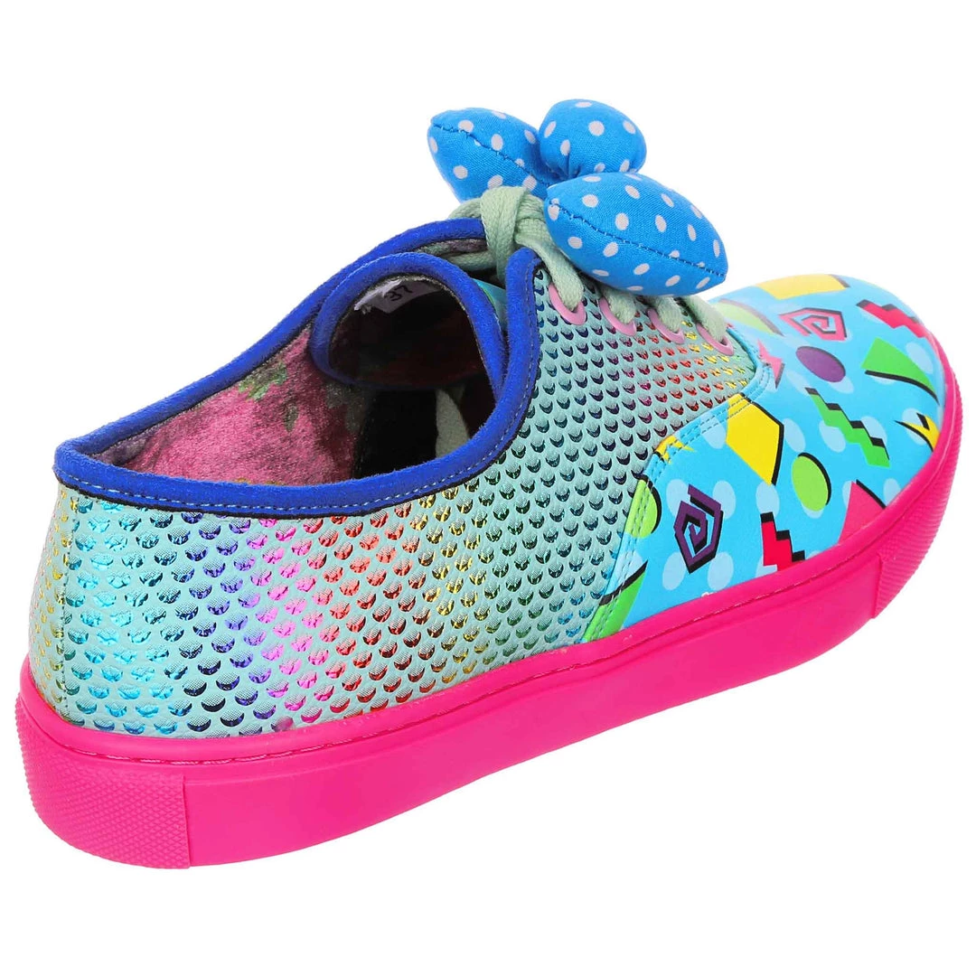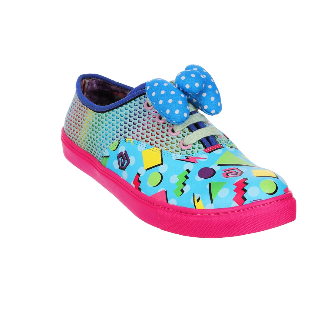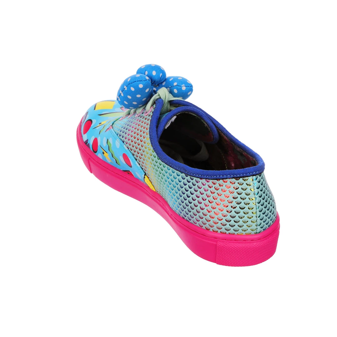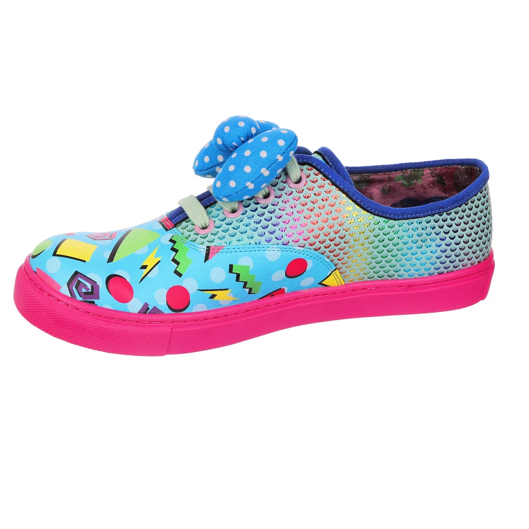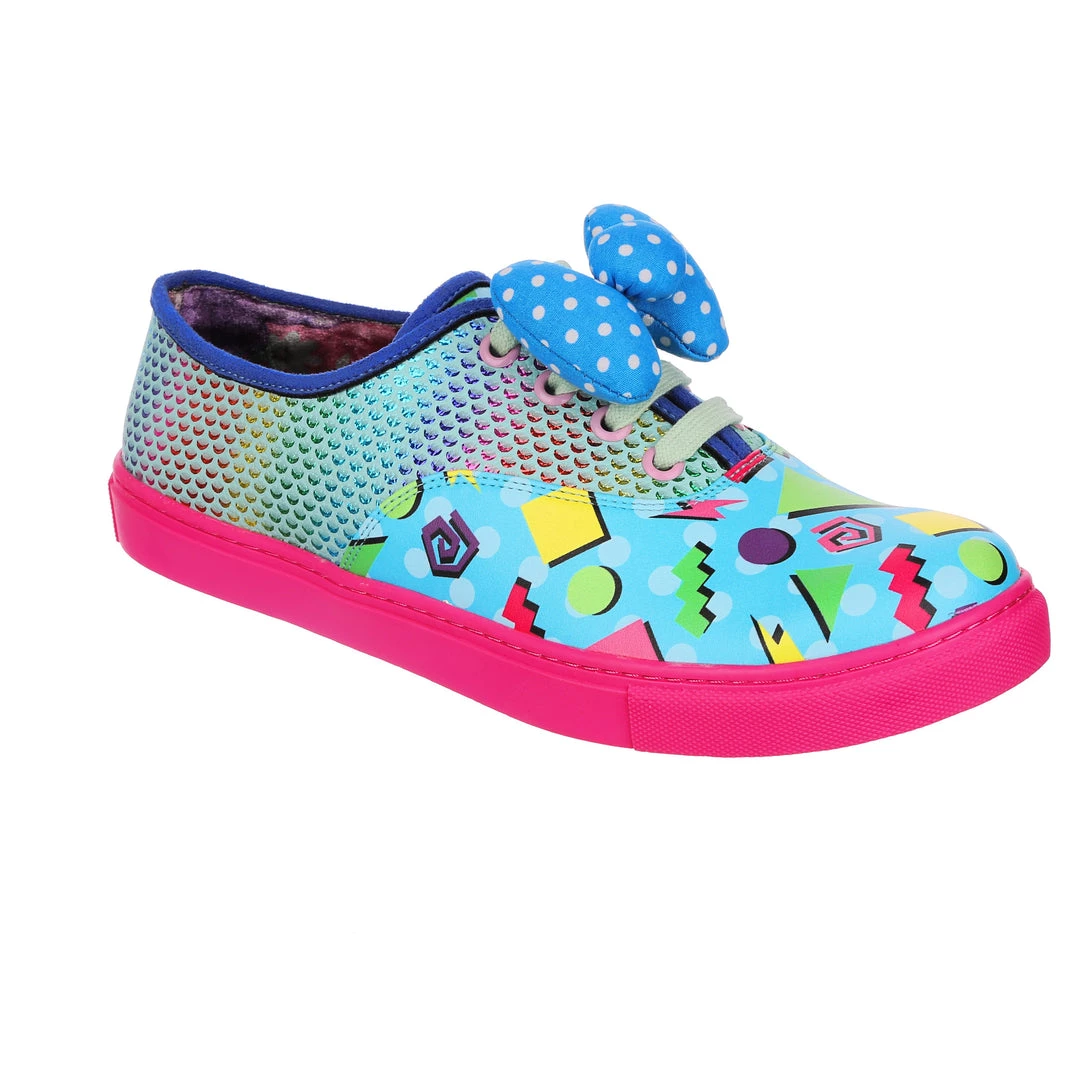 Feel fresh in these jazzy trainers! Stunning sparkly rainbow reptile scales are matched with a colourful 90’s style abstract pattern and with a bright pink sole that really pops! Fastened with mint laces and topped with a padded blue and white polka dot bow. These trainers would be a totally rad addition to your wardrobe!