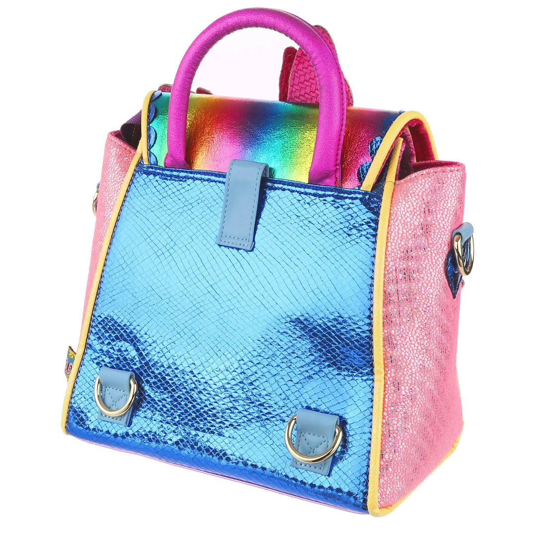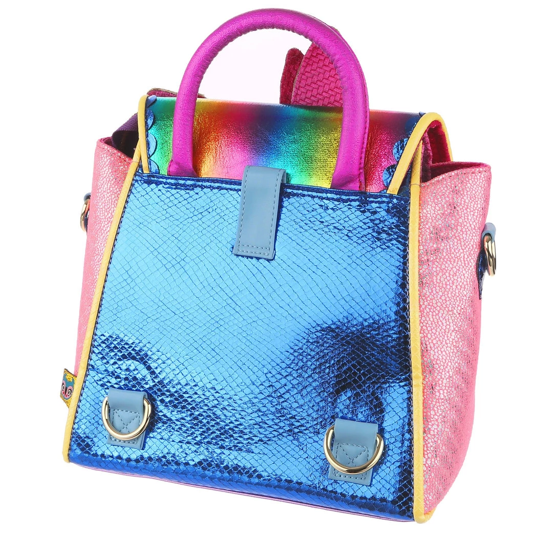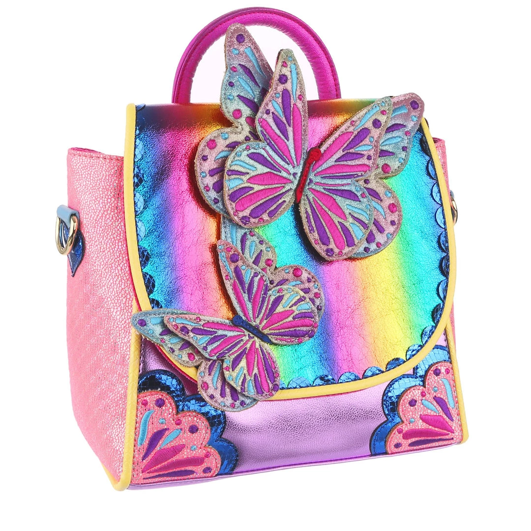 Feel flutterly fabulous with this colourful backpack! A metallic rainbow fold over front has two stunning 3D butterflies fluttering over it in iridescent, pink and purple. Pastel pink glitter sides are contrasted with yellow piping and a metallic blue reverse with attachments for the removable straps so that you can wear it as a backpack, shoulder bag or handheld! Fastened with a magnetic snap button and zip across the top, inside there are two pockets to store your valuables in. Grab one before they fly away!
