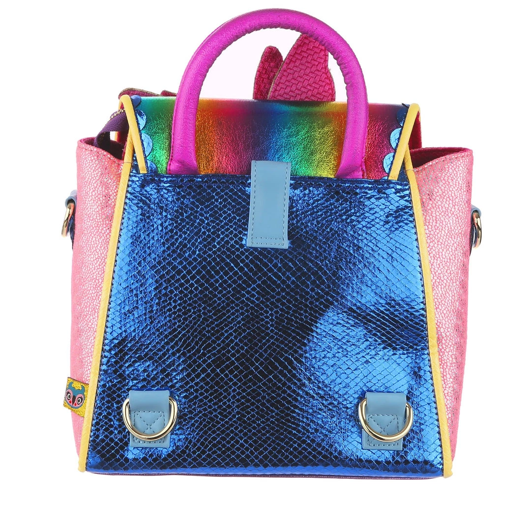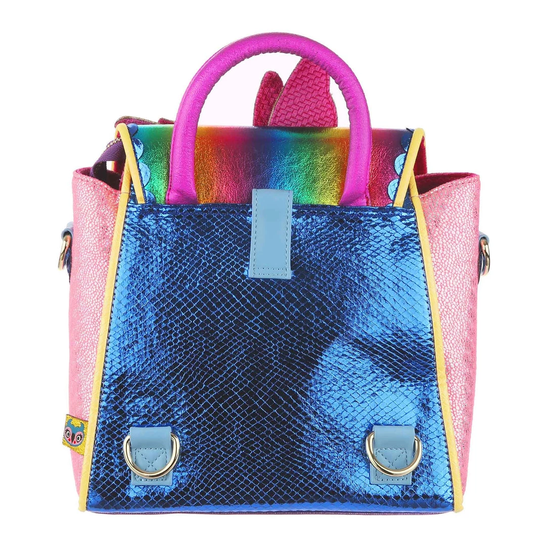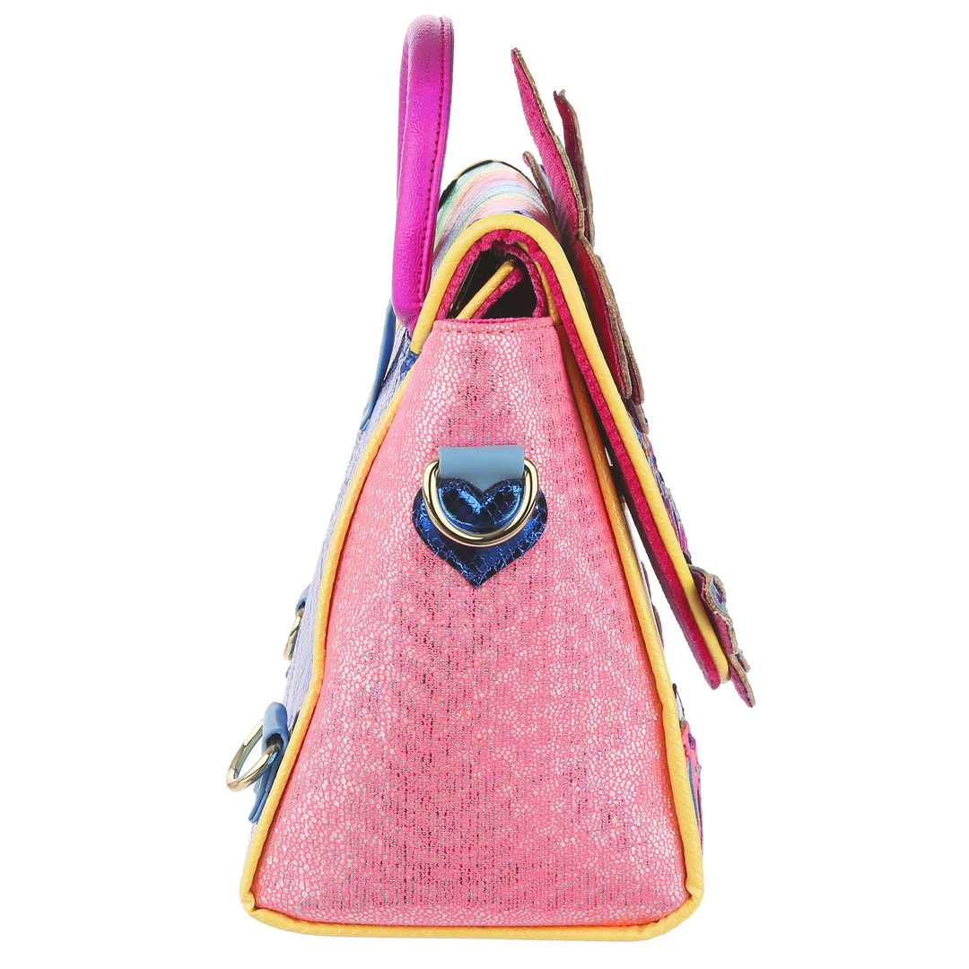 Feel flutterly fabulous with this colourful backpack! A metallic rainbow fold over front has two stunning 3D butterflies fluttering over it in iridescent, pink and purple. Pastel pink glitter sides are contrasted with yellow piping and a metallic blue reverse with attachments for the removable straps so that you can wear it as a backpack, shoulder bag or handheld! Fastened with a magnetic snap button and zip across the top, inside there are two pockets to store your valuables in. Grab one before they fly away!