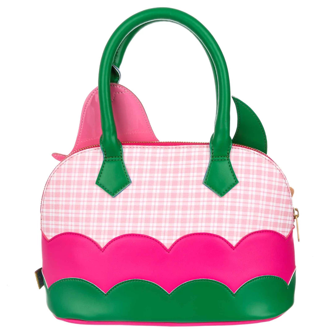Feel the bunny love with this adorable handbag. The striking baby pink and white gingham is topped with a fuzzy applique of the cutest bunny you ever did see, lying down and playing with a ladybird! The strap of the bag forms the stalk of the flower that the ladybird is on, giving a lovely overall aesthetic! Extra details include the hot pink scalloping along the middle of the bag, and the 3D deep green leaf at the base of the stalk! The perfect addition to any cute lovers closet!