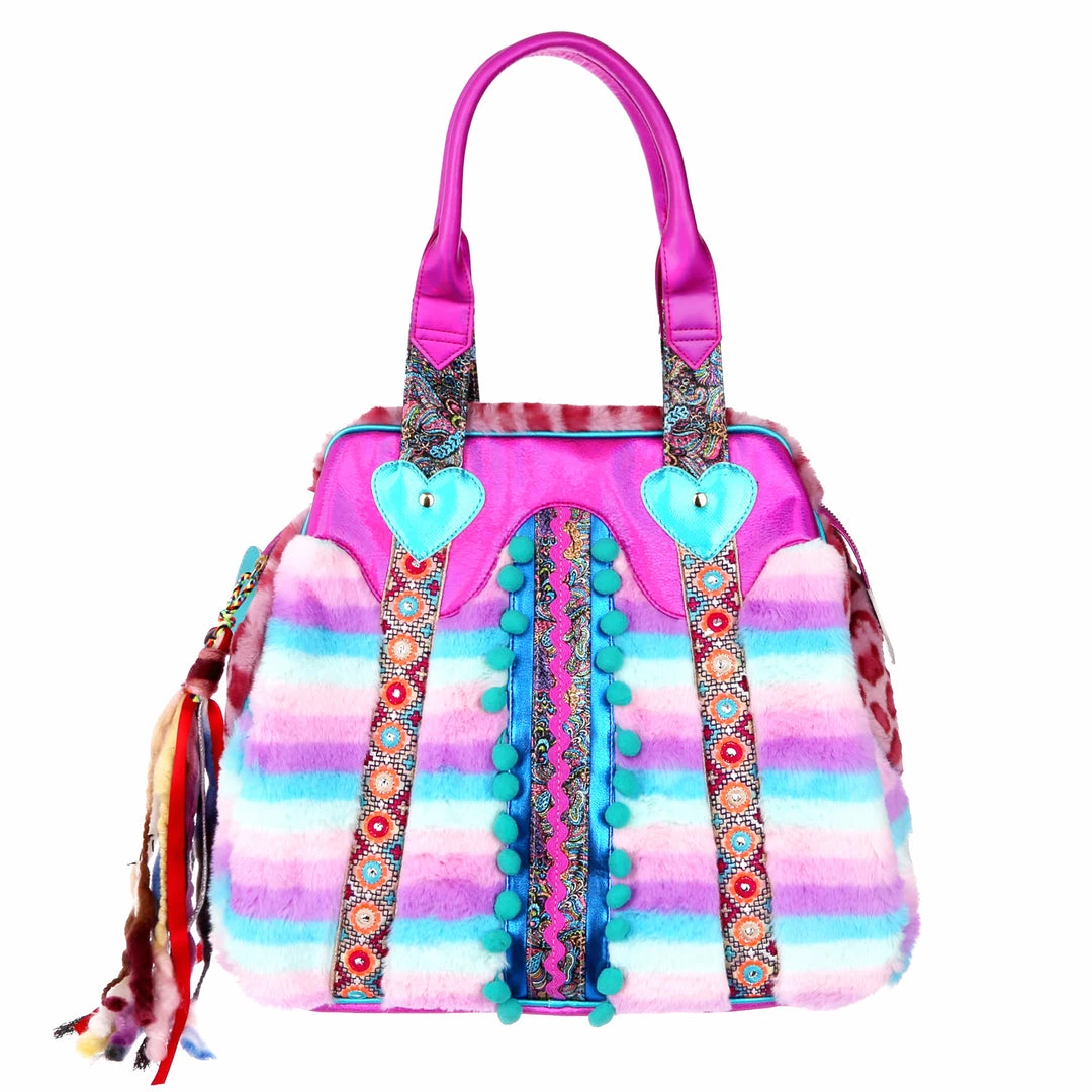 Perfect to add some disco eclectic vibes to your look, this soft faux fur bag has all the colour you need to make any outfit pop! Striped pastel rainbow fluff is trimmed with folky woven ribbon and plump pompoms, and finished with a fabulous statement dangling tassel made of soft wooly threads.