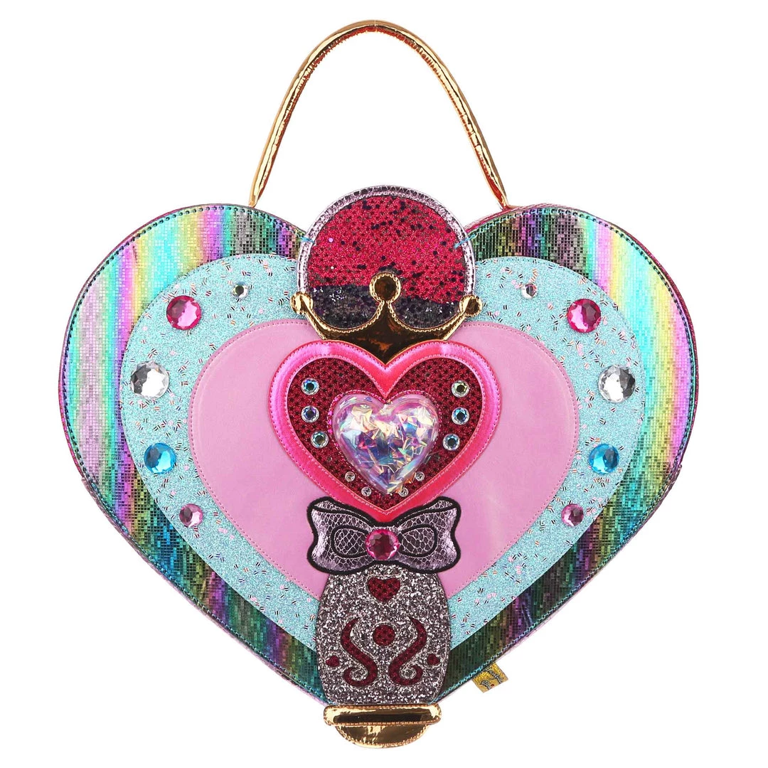 Wave that magic wand and BOOP! The perfect accessory! This larger than life heart shaped majesty of a bag is here to UP your style game – seriously! Dazzling metallic pink, purple and fuchsia is combined with incredible applique of a wand to match our fabulous magic wand concept heels! The front of the bag even features a 3D domed plastic heart filled with iridescent magical-ness! Fastens with a zip and super roomy for all your adventuring needs!