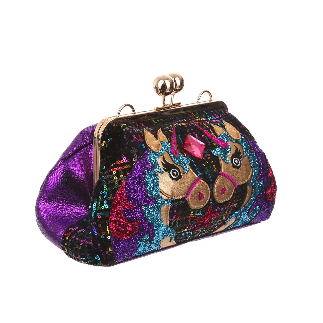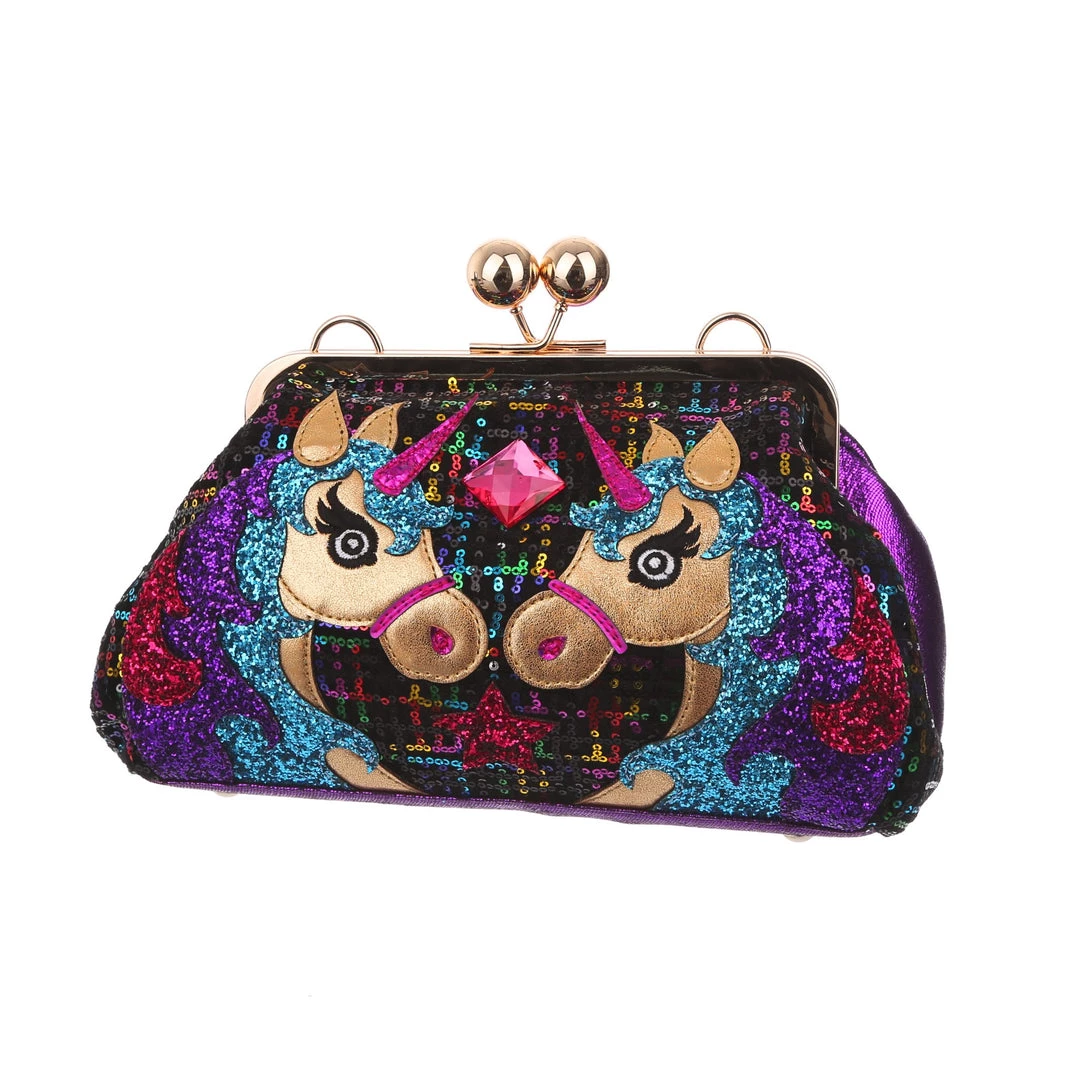 Shine bright like a unicorn! Transport your precious things to a magical unicorn kingdom with this IC classic Magic Pony bag. A double image of sparkly Misty the unicorn sits on a shiny rainbow sequin fabric with a large pink gemstone in the centre. Fastened with a ball clasp, this doctors style handbag also comes with an adjustable shoulder strap that matches the metallic purple reverse. Travel far and wide with this enchanting must-have accessory!