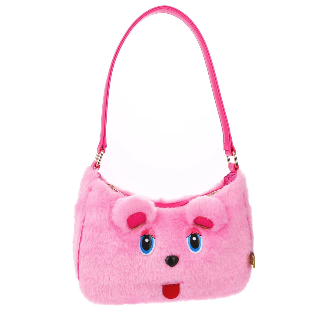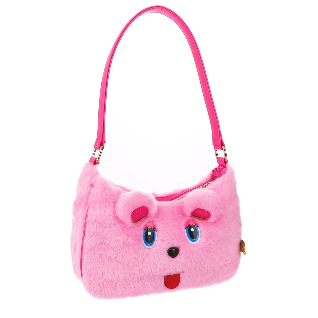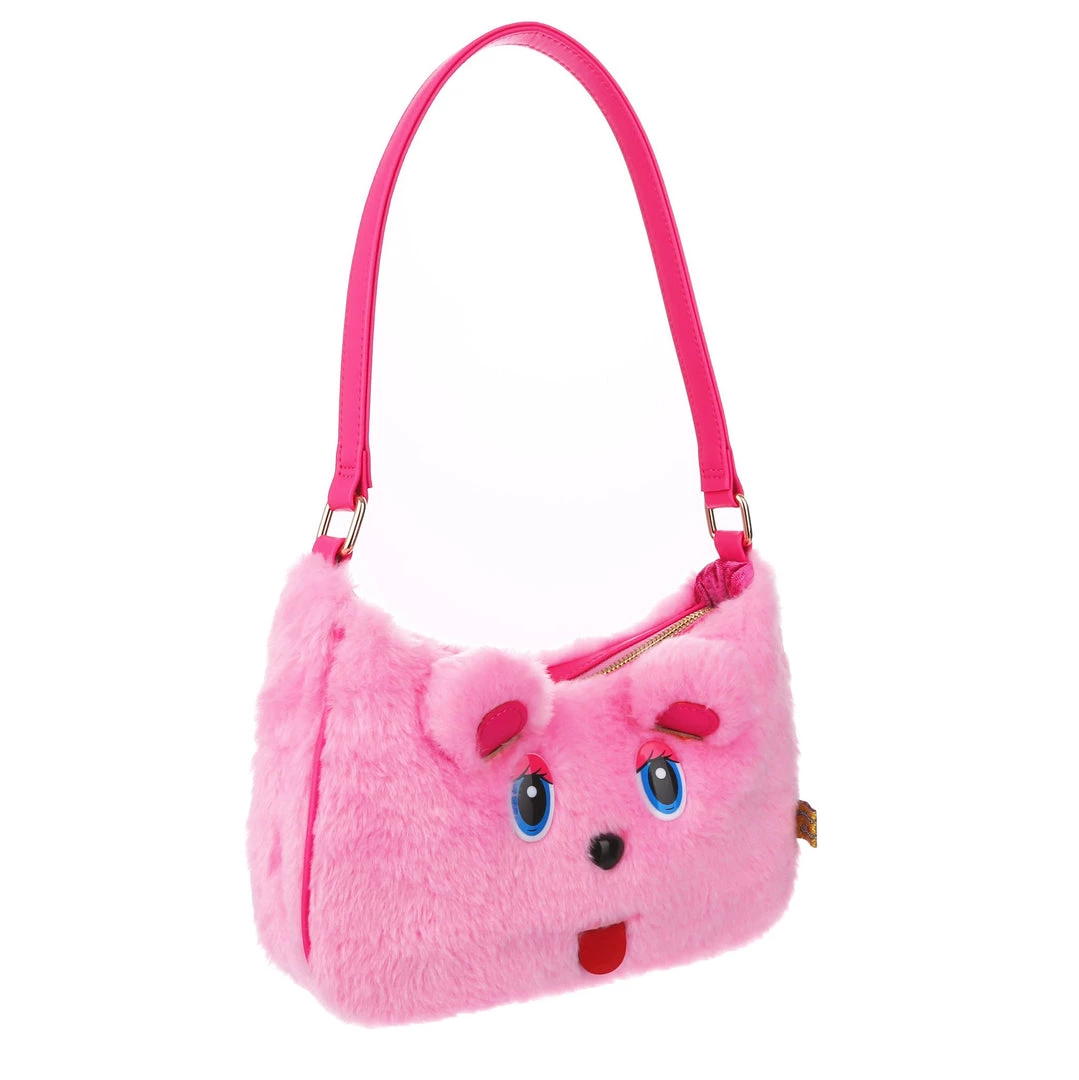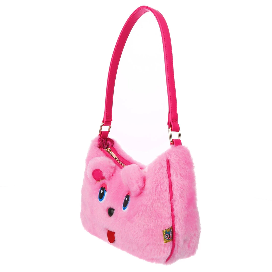 The cutest, fluffiest little friend! This little handbag has all the adorable vibes you want! A handheld strap and zip fastening adorn this cutie patootie, and the main fabric is a fabulous pink faux fur which is embroidered and embellished with all the details (including little 3D ears) to make it look like a teddy bear face! Cute, kitschy and perfect for you!