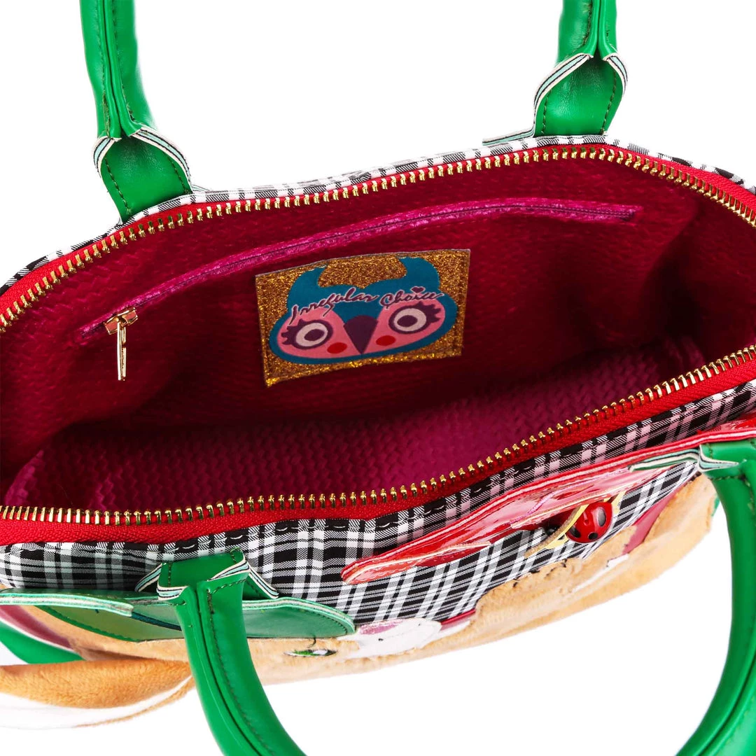 Feel the bunny love with this adorable handbag. The striking black and white gingham is topped with a fuzzy applique of the cutest bunny you ever did see, lying down and playing with a ladybird! The strap of the bag forms the stalk of the flower that the ladybird is on, giving a lovely overall aesthetic! Extra details include the deep red scalloping along the middle of the bag, and the 3D deep green leaf at the base of the stalk! The perfect addition to any cute lovers closet!