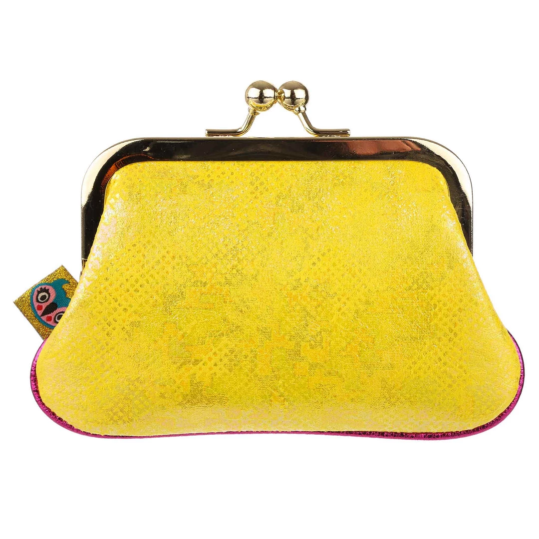 Play among the summer flowers with this adorable purse! A cute embroidered kitten is catching butterflies and flowers on this yellow and orange gingham coin purse with a gold ball clasp fastening to keep your cash safe. With a textured yellow reverse and contrasting bright pink lining this is the purr-fect purse!
