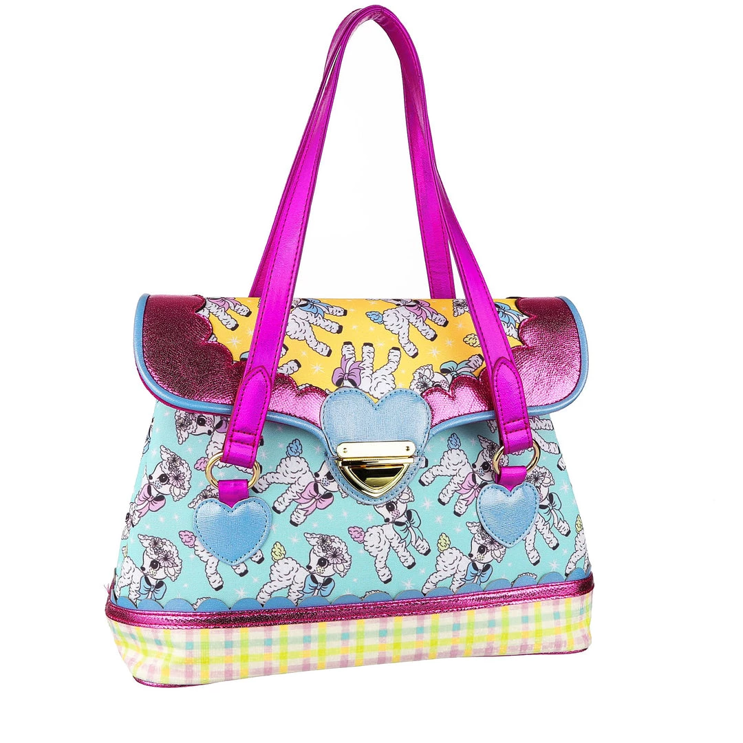 Have a spring fling with this baa-ag! This large tote bag is covered in our classic IC lamb print from AW17 in blue and yellow, surrounded by a metallic pink scalloped edge and blue piping. With a removable metallic pink shoulder strap and matching top handles, it is finished with a gold push lock to keep your goodies safe.