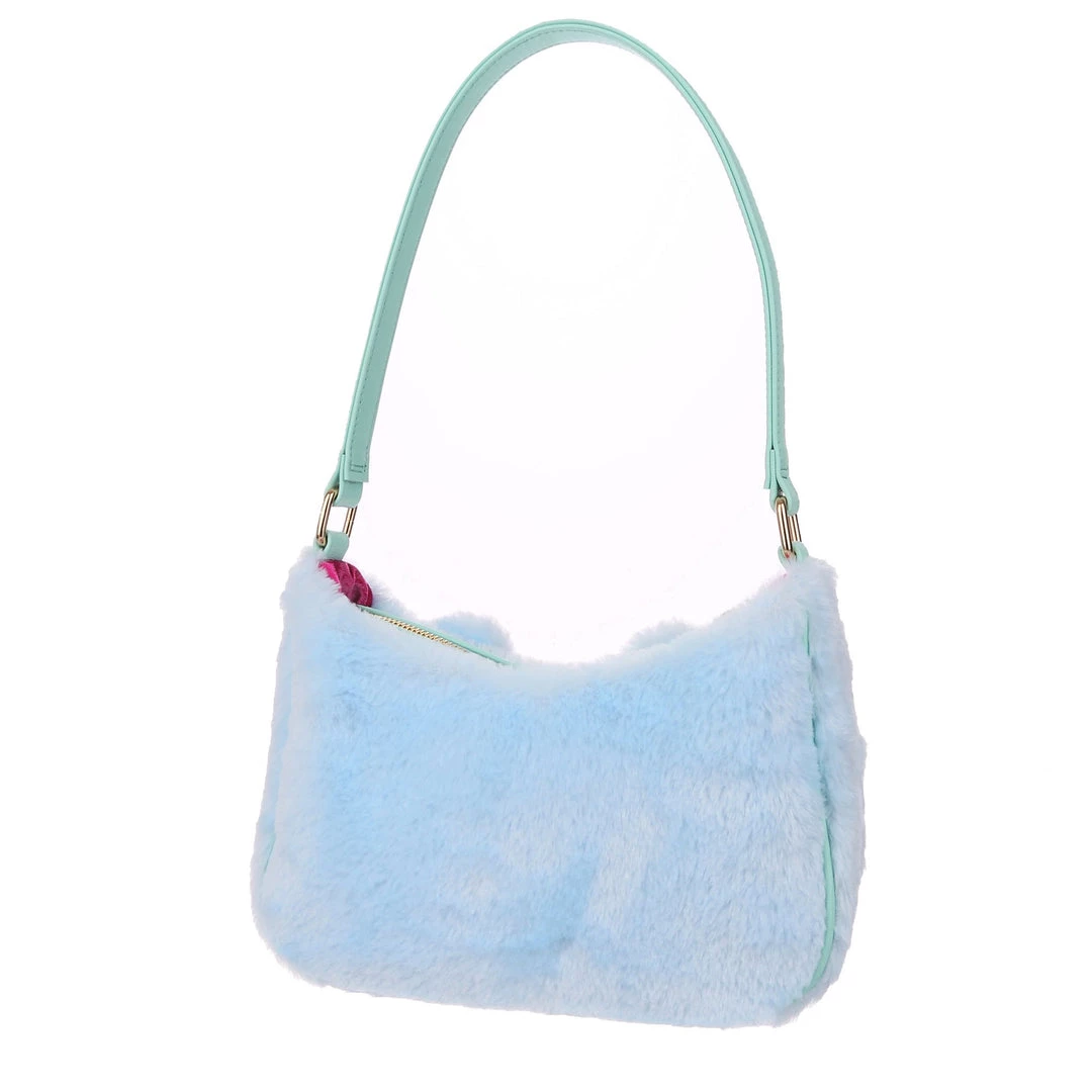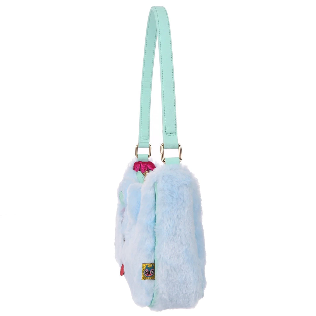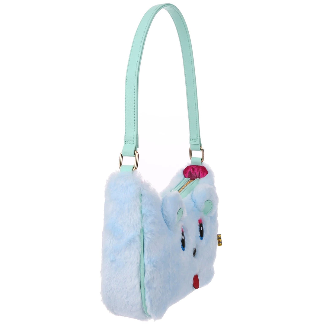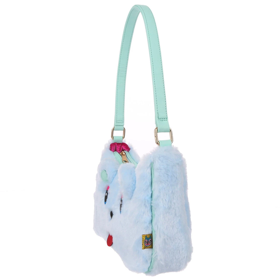 The cutest, fluffiest little friend! This little handbag has all the adorable vibes you want! A handheld strap and zip fastening adorn this cutie patootie, and the main fabric is a fabulous baby blue faux fur which is embroidered and embellished with all the details (including little 3D ears) to make it look like a teddy bear face! Cute, kitschy and perfect for you!