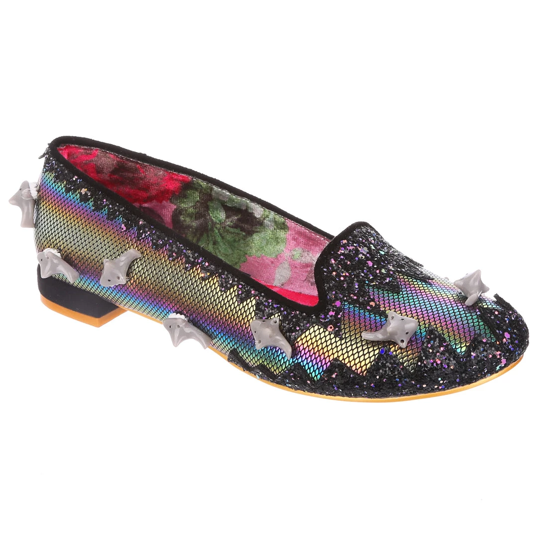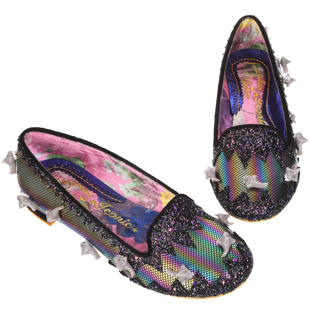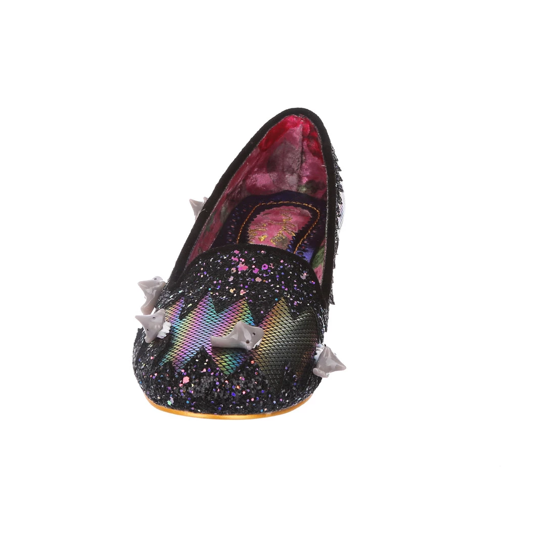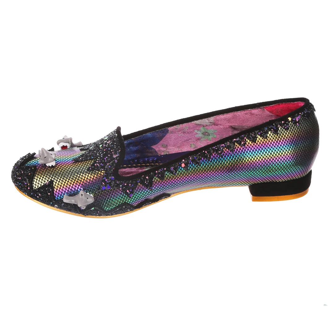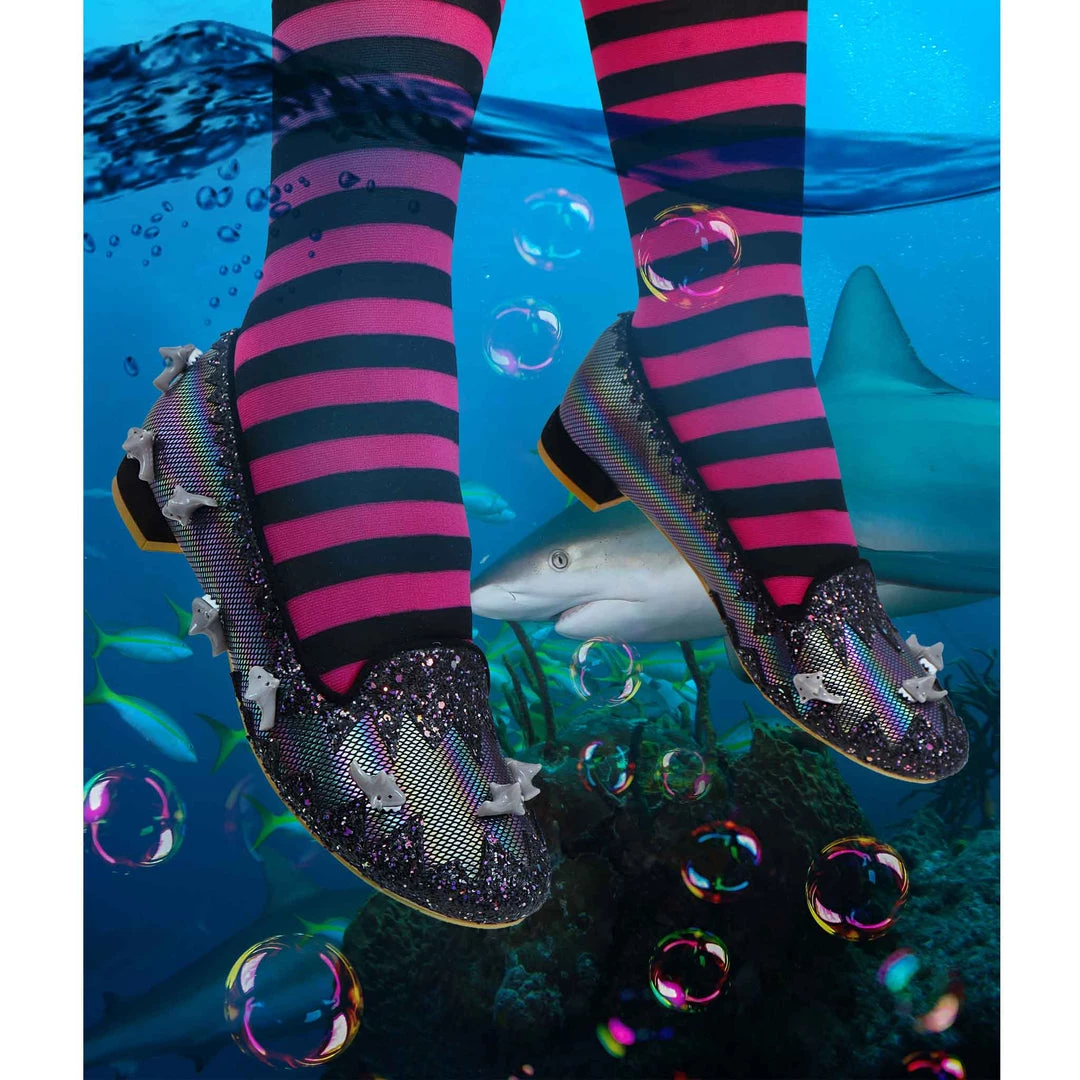 Feeling hungry? Snack on these flat black slip-on pumps with cute little sharks swimming on the metallic rainbow fabric, surrounded with sparkling black and purple glitter in a zig-zag pattern and finished with a small black block heel. Dive into these cuties and feel like a tasty treat!