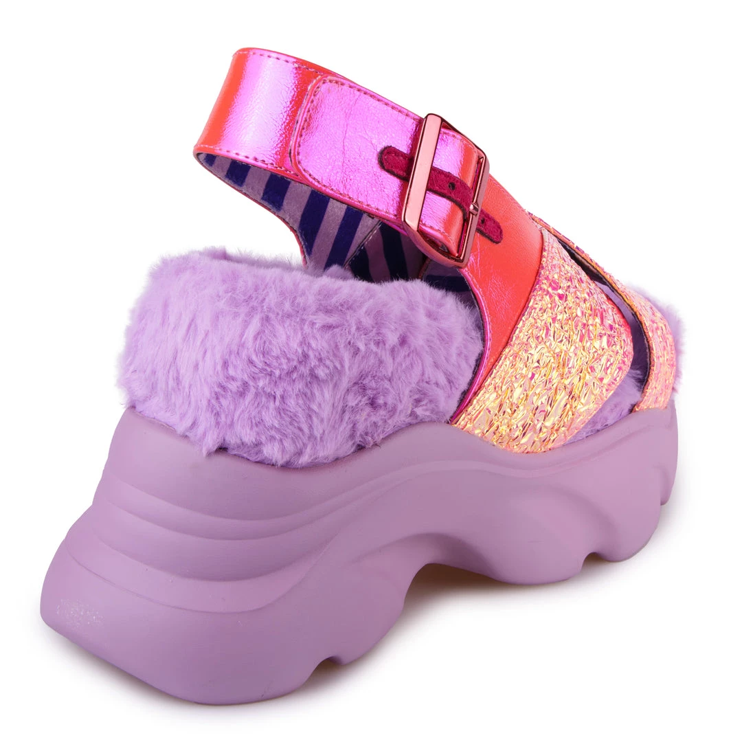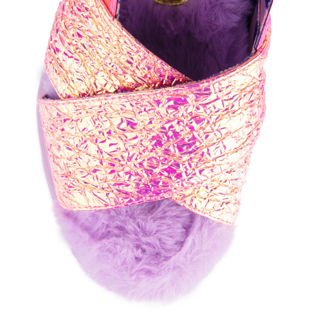 Buckle into these beauties! A statement sandal with some edge, iridescent crinkled metallic pink chunky straps criss cross your toes, and a complimentary adjustable strap goes around our heel for stability! All tied together with a pastel lavender platform sole and matching fluffy faux fur on the insole! Perfect to add a bit of oomph to any outfit!