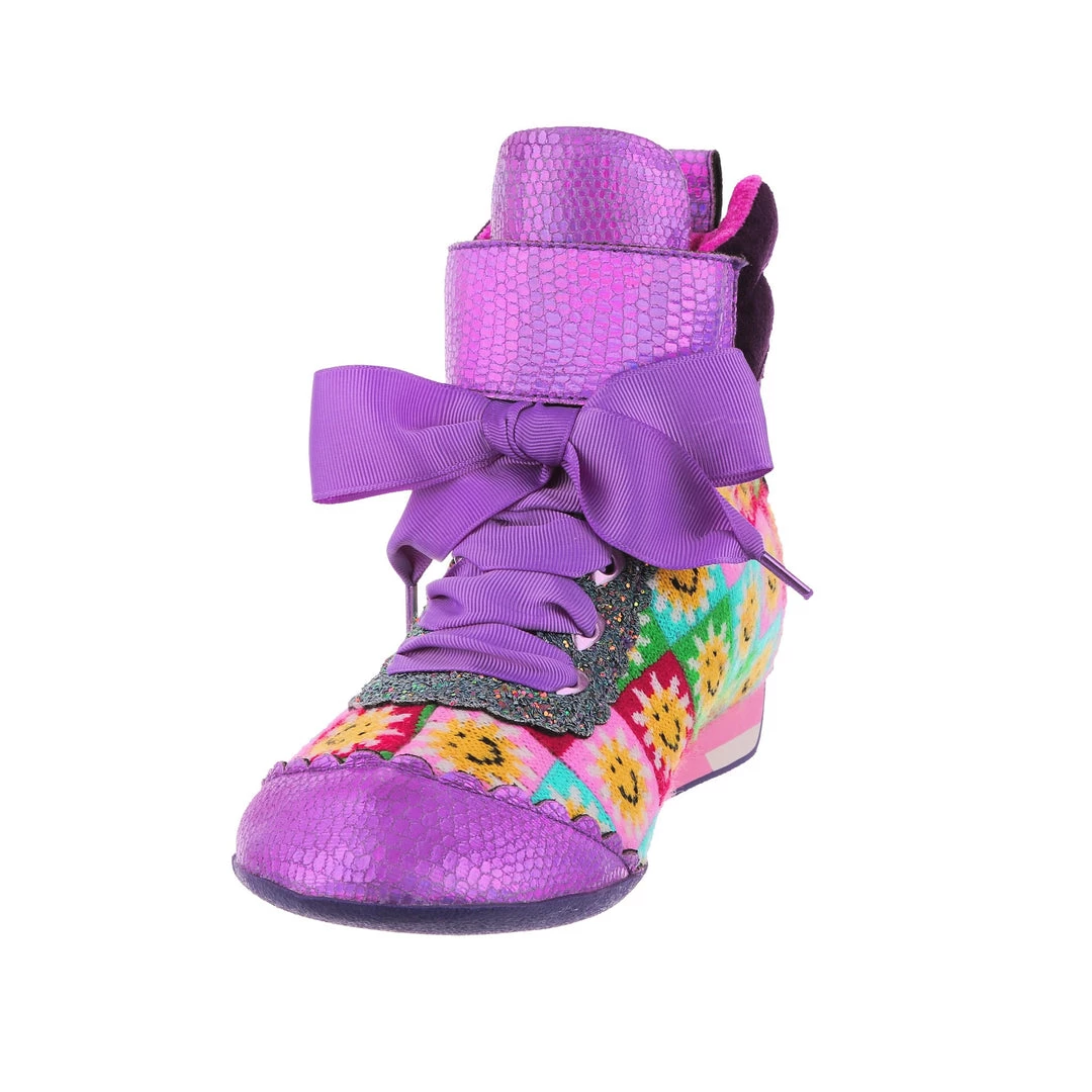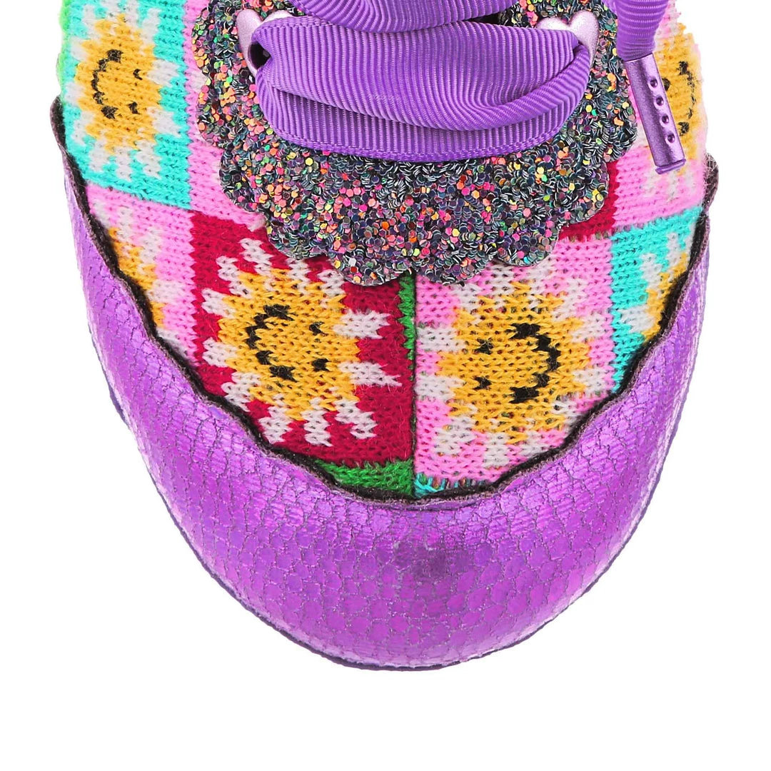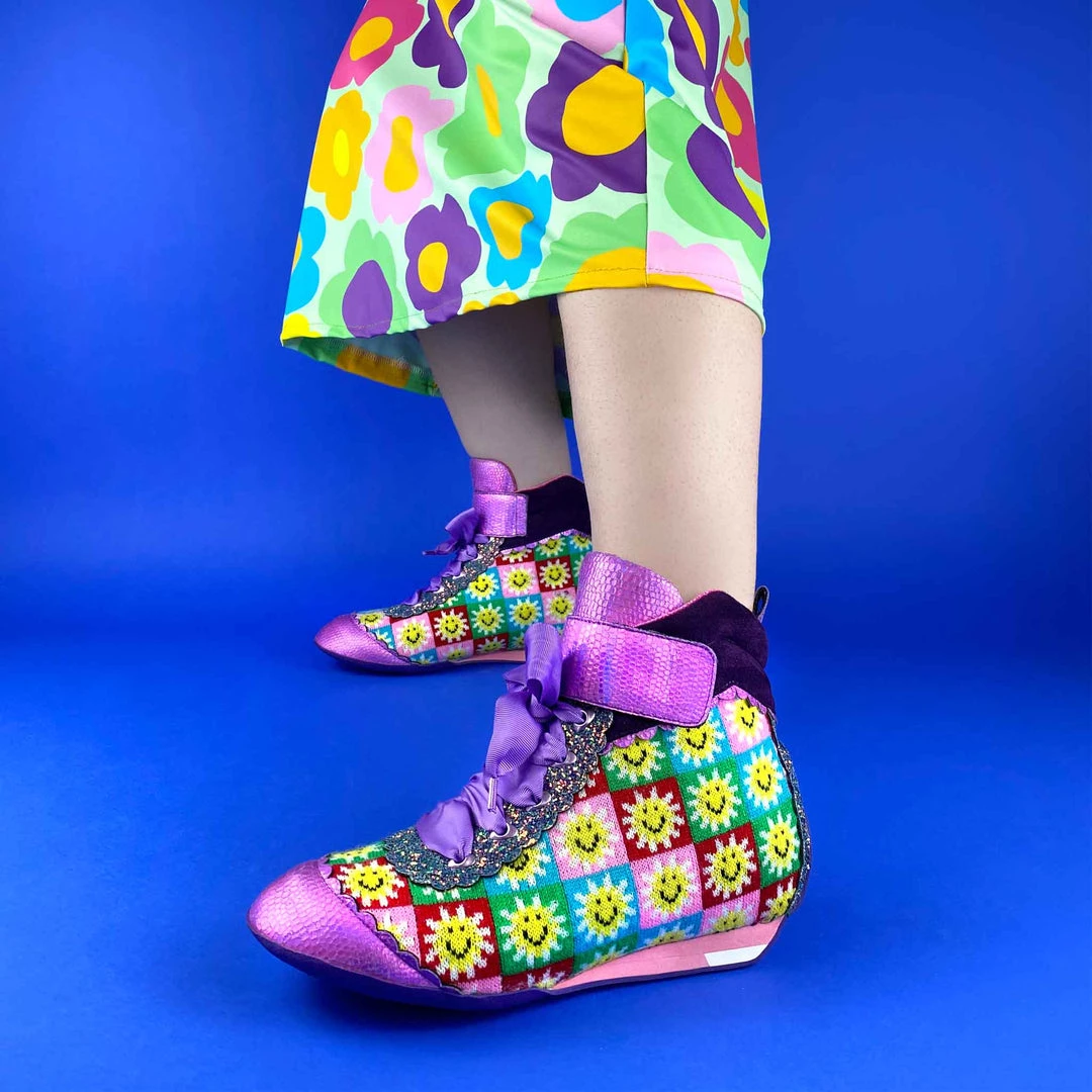 Flowery and fun, these trainers are here to brighten your day! A super cute multicoloured crochet upper is covered in smiley flowers, which is complemented by the bright purple satin ribbon laces, matching metallic hook and loop strap and dark purple padded collar! With an athletic-inspired shape, these pumps are sure to get you going with a smile on your face!
