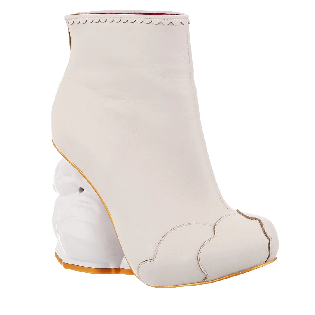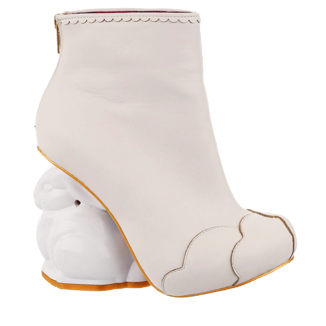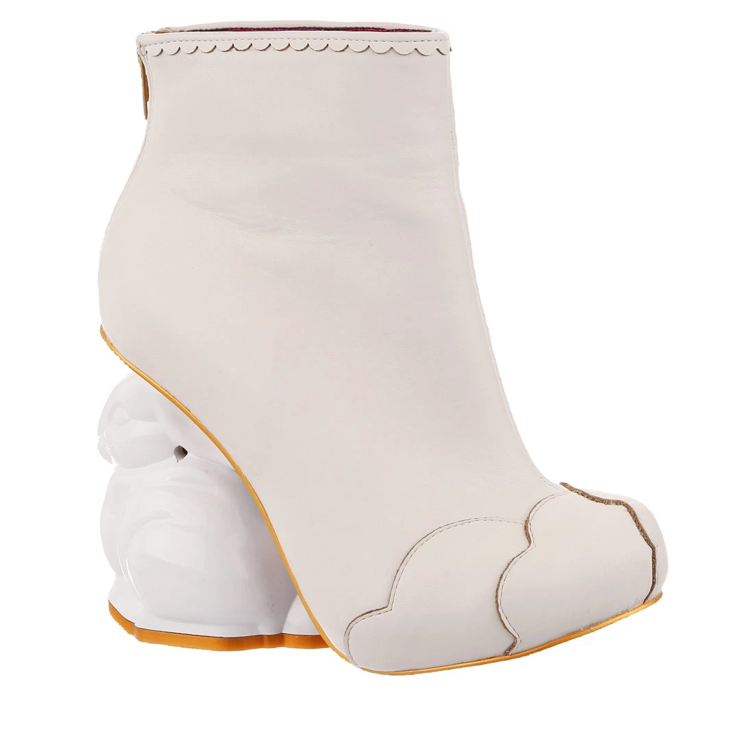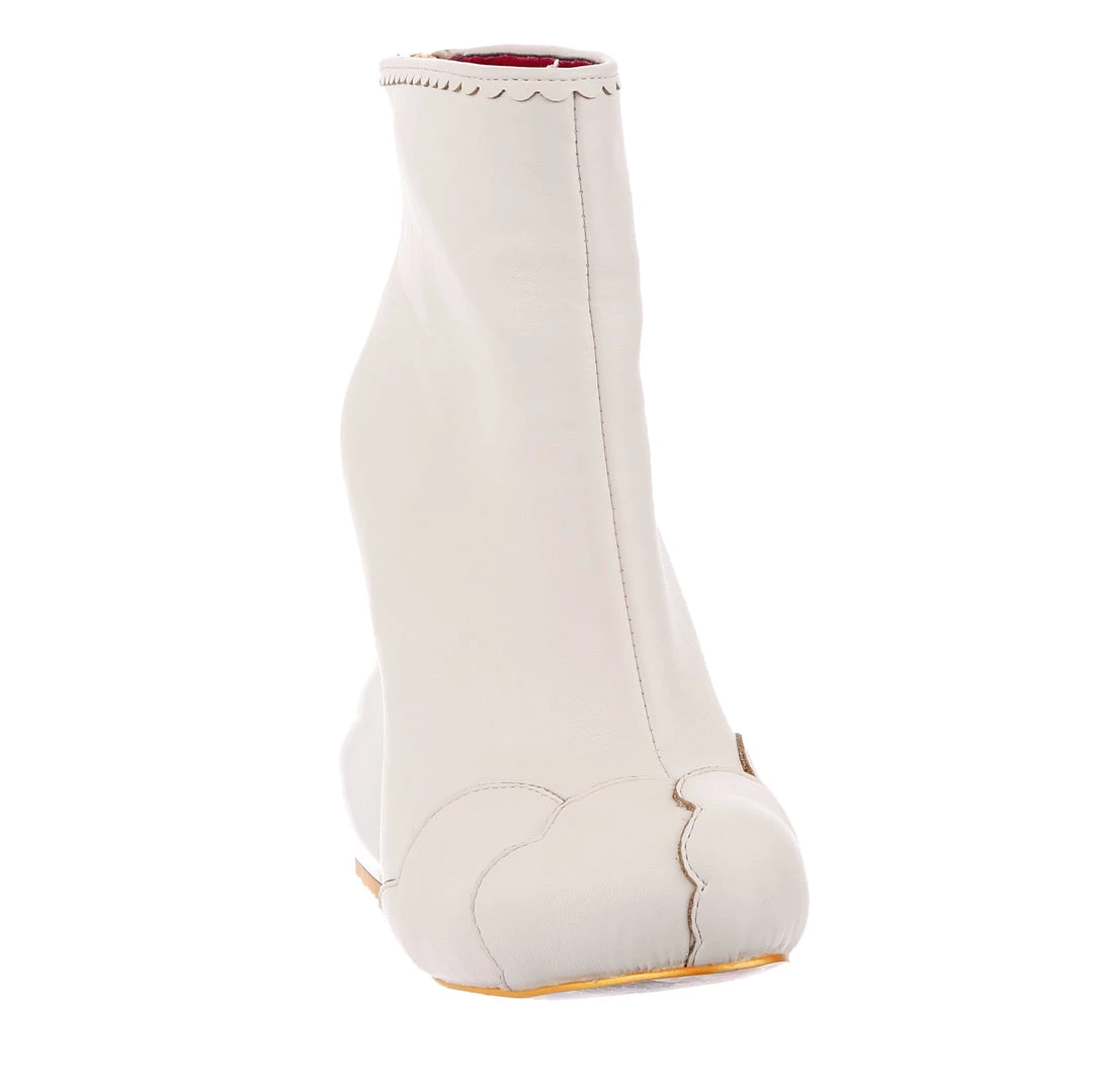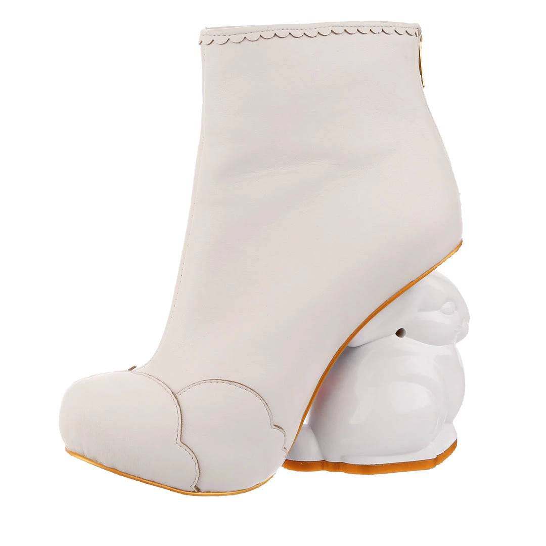 Get your paintbrush ready for these bunny boots! High heel ankle boots are left as a blank canvas for your creative designs, completed with a bunny heel, that has a hole ready for a bow of your choice! The zip fastening at heel makes these so easy to pop on and off. Finished with scallop detailing around the ankle and layered clouds on the toe, fulfil your bunny dreams with these fabulous boots today!