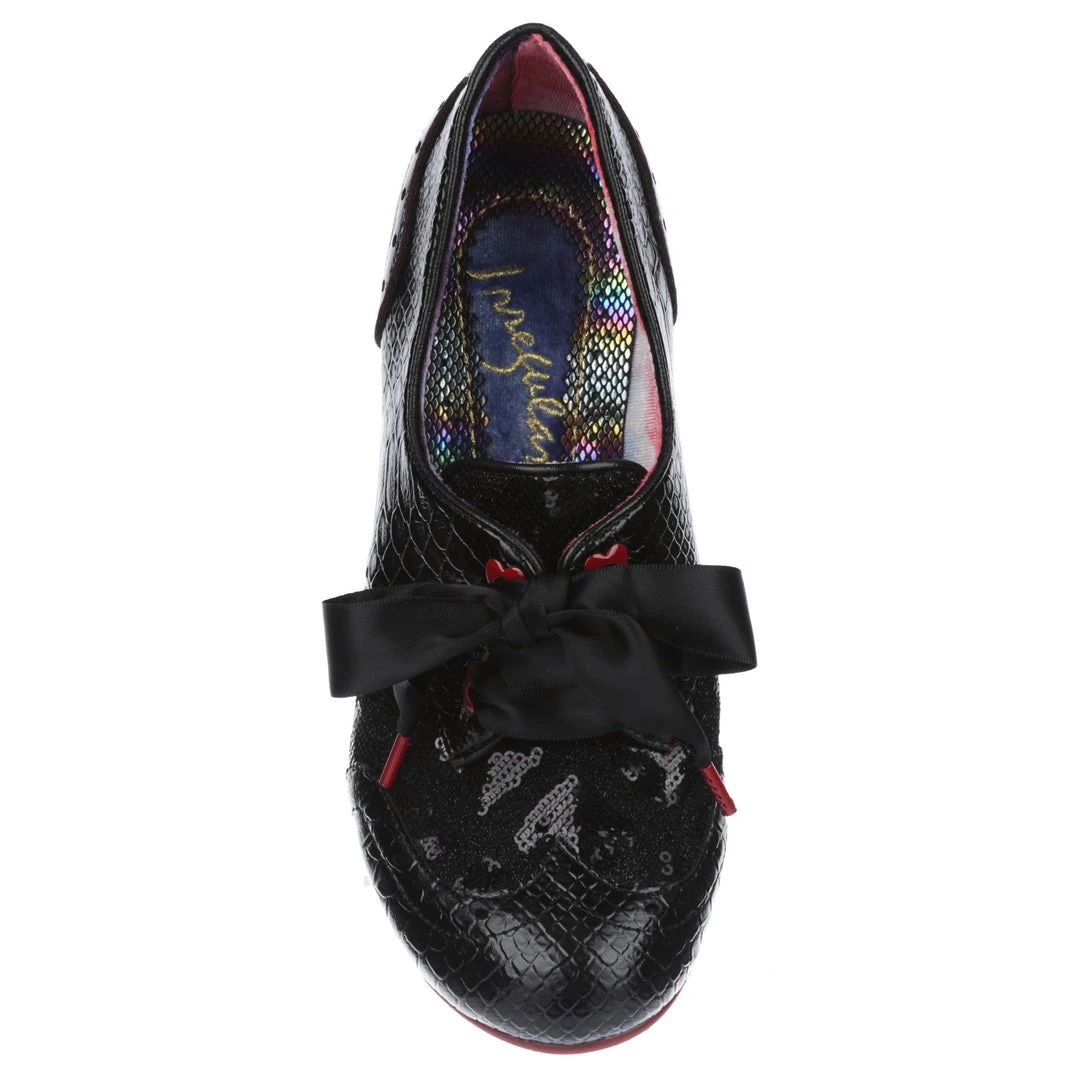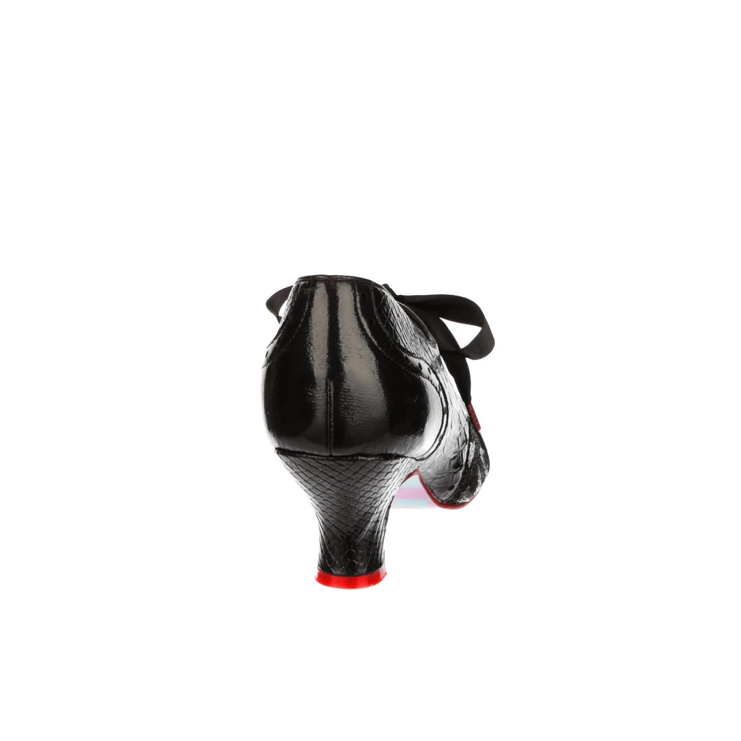 Have a Victorian adventure in these stunning lace ups! A low wearable heel is combined with elegant black tones of metallic, snake print and sequins. A perfect mix of textures, topped off with a contrasting red edged sole and heel, black ribbon laces and red eyelets! Perfect to give any preppy look just a little extra boost!