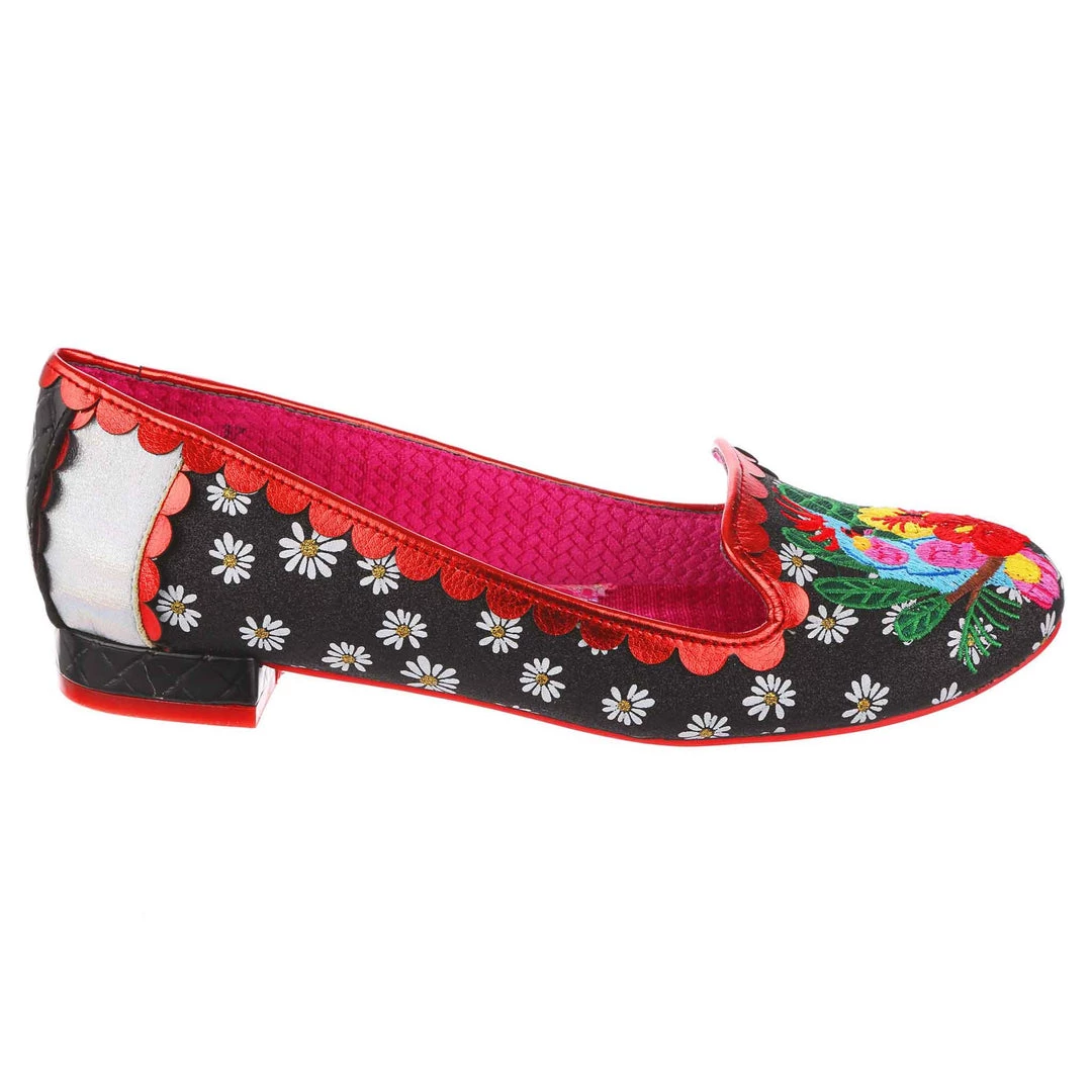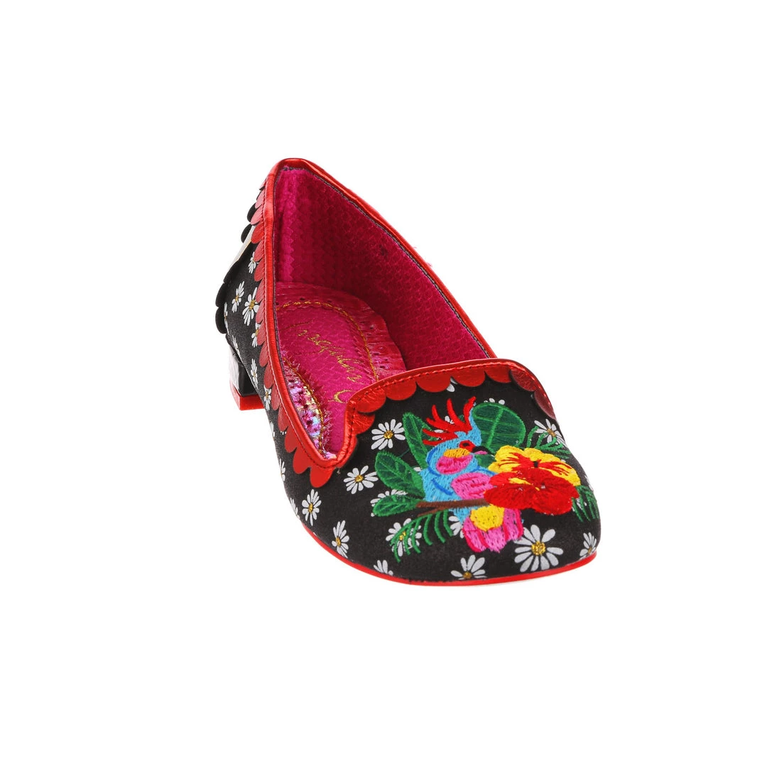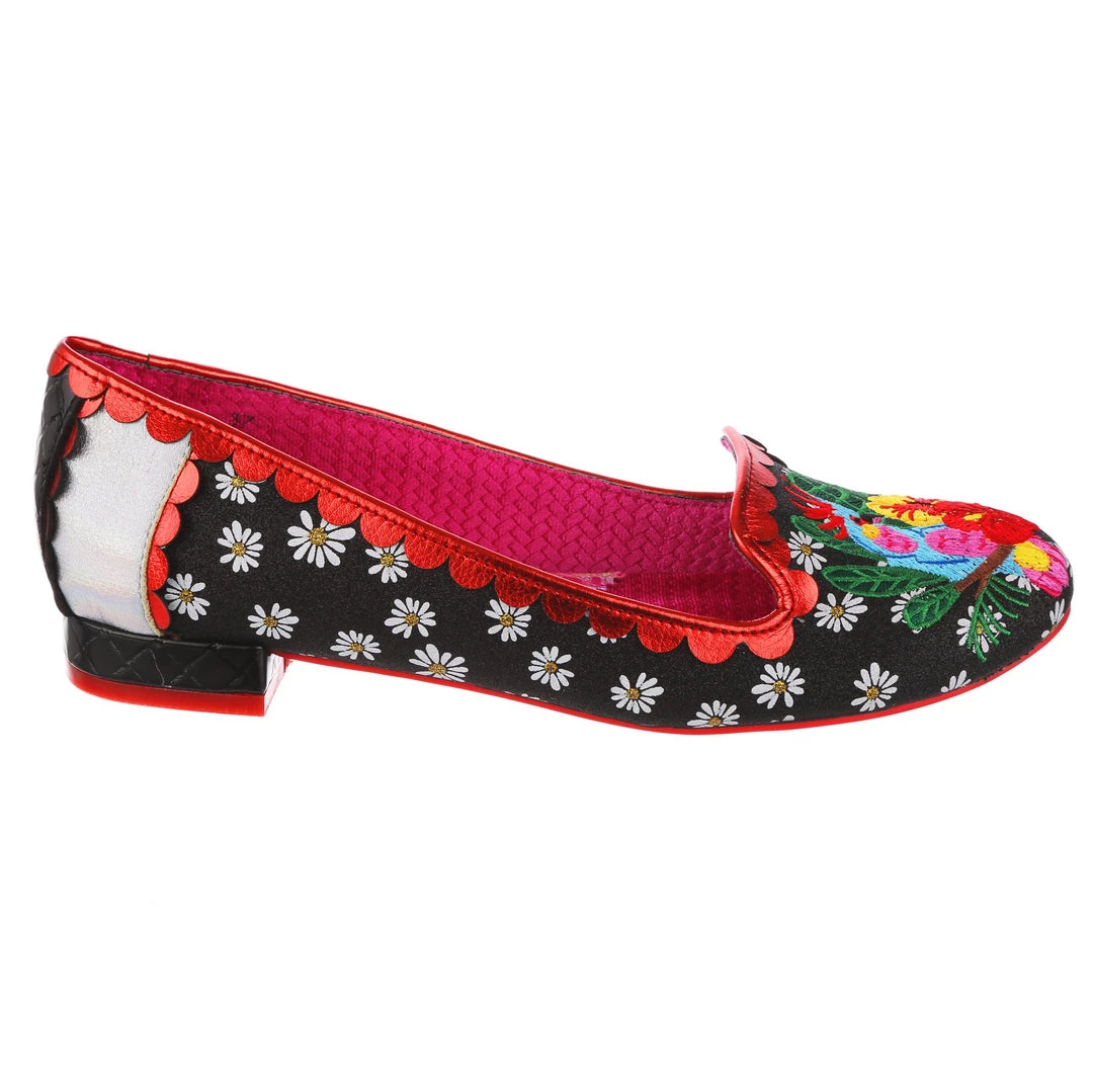 Are you a real bird of paradise? We reckon these flats will be singing to you! A gorgeous black glitter fabric is printed with daisies, bordered with a metallic red scalloping and adorned on the toe with the most darling embroidery of a cockatoo! Fun, flirty and flat, they are a great wardrobe staple!