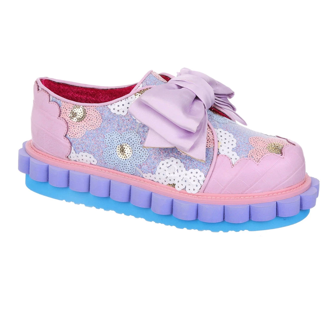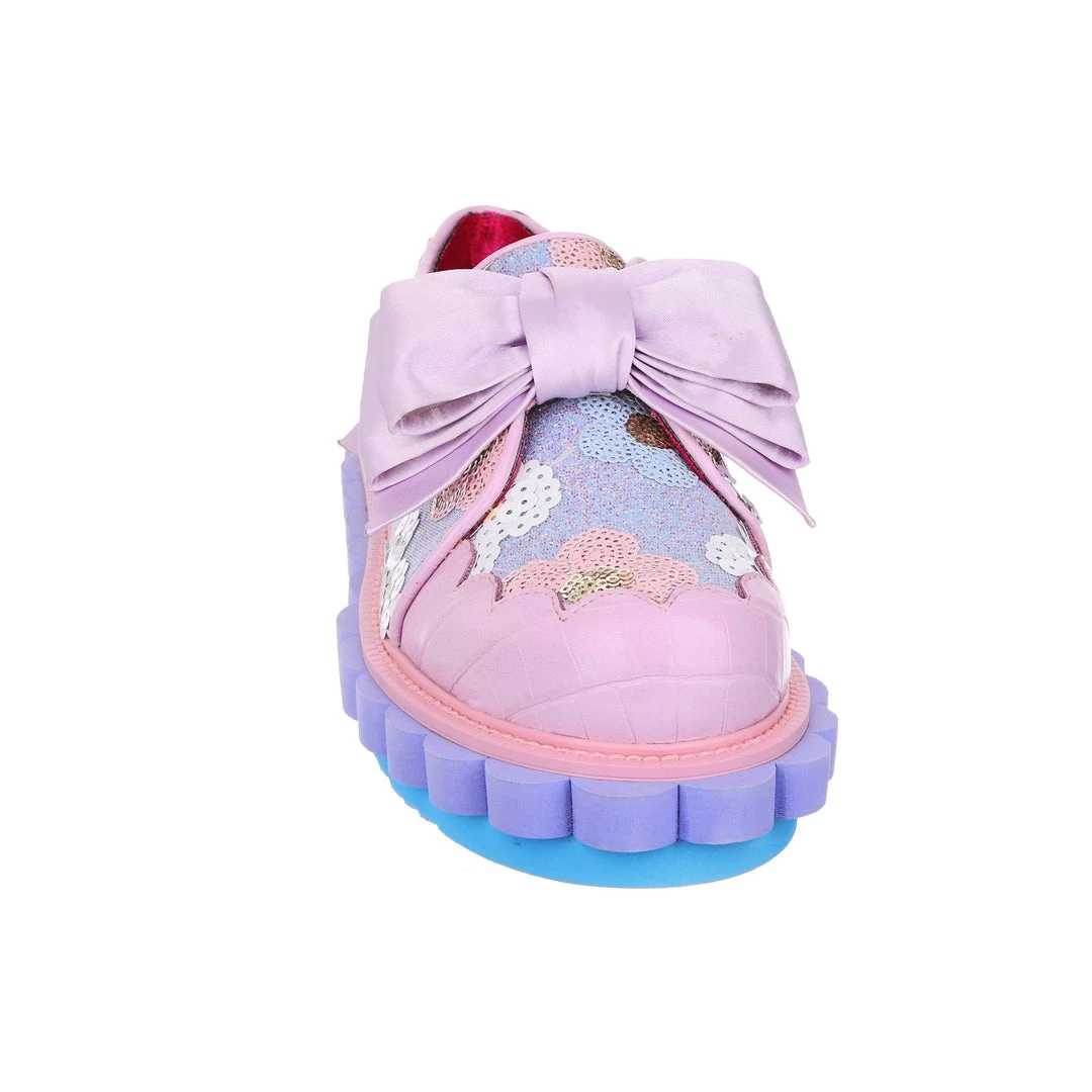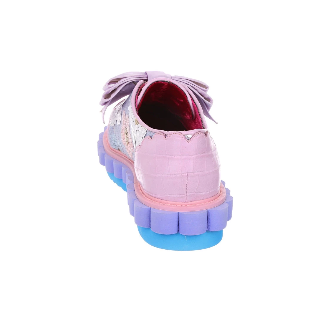 So so sweet and so so chic, these platforms are here to up your game! A stunning lilac base is embellished with sequin graphic flowers in pink, blue and white, which is in turn accented by the matte pink reptile texture scalloping on the toe and heel! The tongue of the shoe is adorned with a sumptuous and luxurious statement lavender satin bow, and the sole of the shoe is a magical mix of blue and aqua scalloped and smooth edges! Slip them on and feel super!