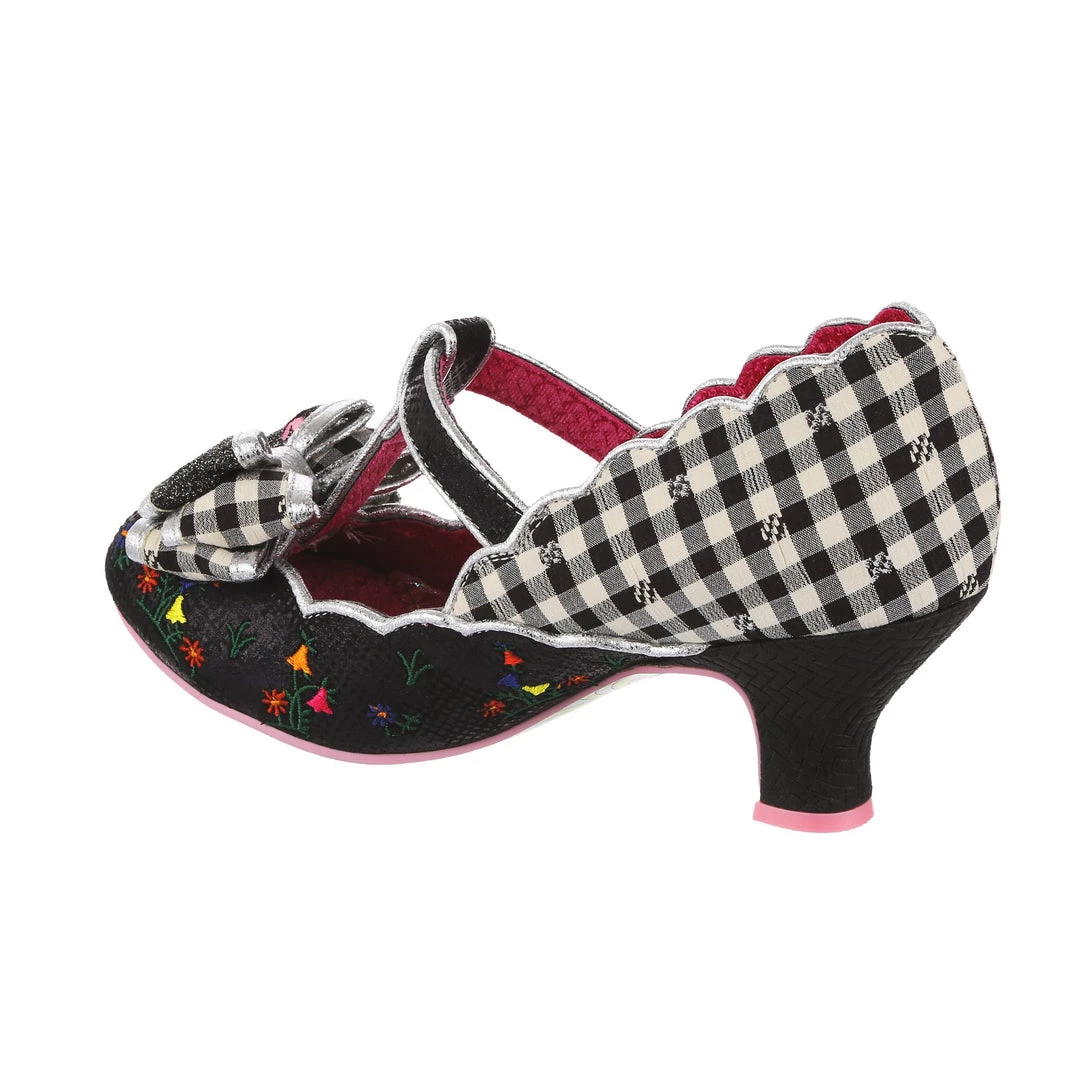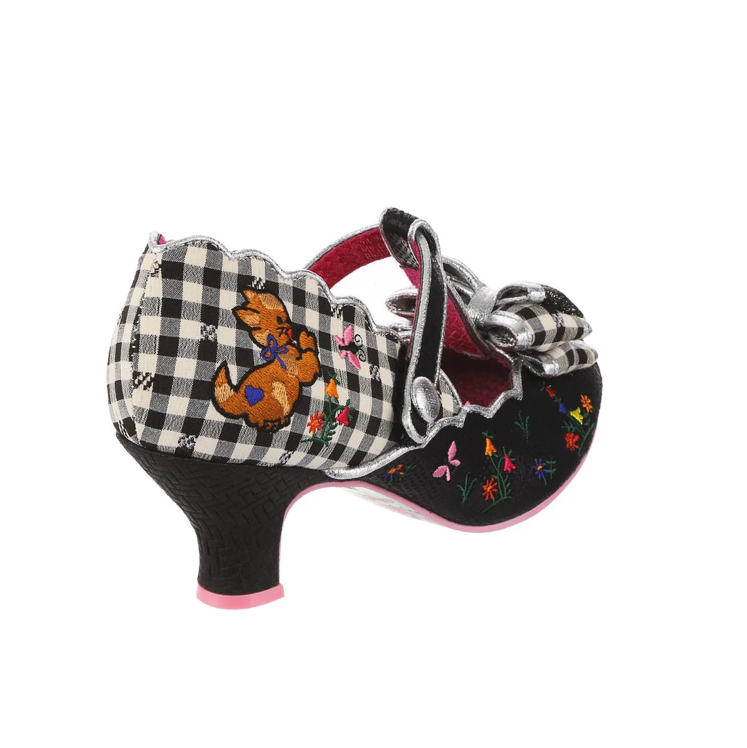A whimsical wonder, these adorable mid heels are a little breath of fresh air for your wardrobe! A fabulous monochrome colour scheme is embellished with tiny little embroidered posies, which is bordered by the scalloped edges with wrap around the whole shoe! A T-Bar strap leads to the most extravagant black and white gingham bow on the toe, which ties into the white piping and details all around the topline! Of course, we can’t forget to mention the darling little kitty and butterfly embroidered on the side too – simply purr-fect!