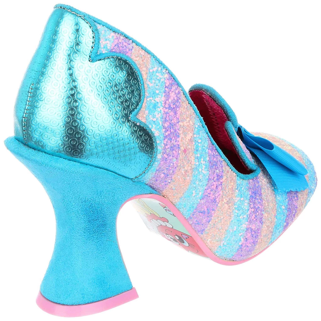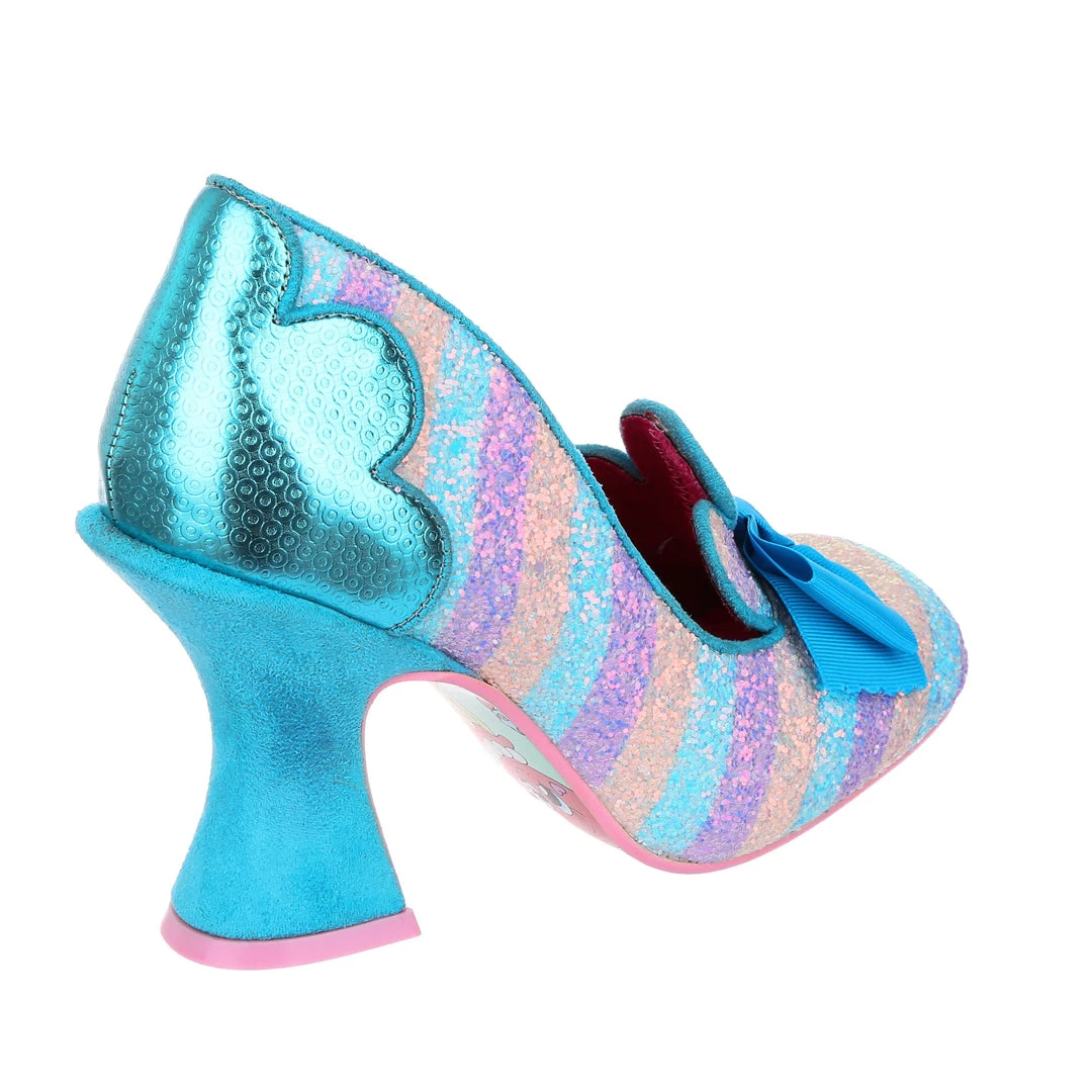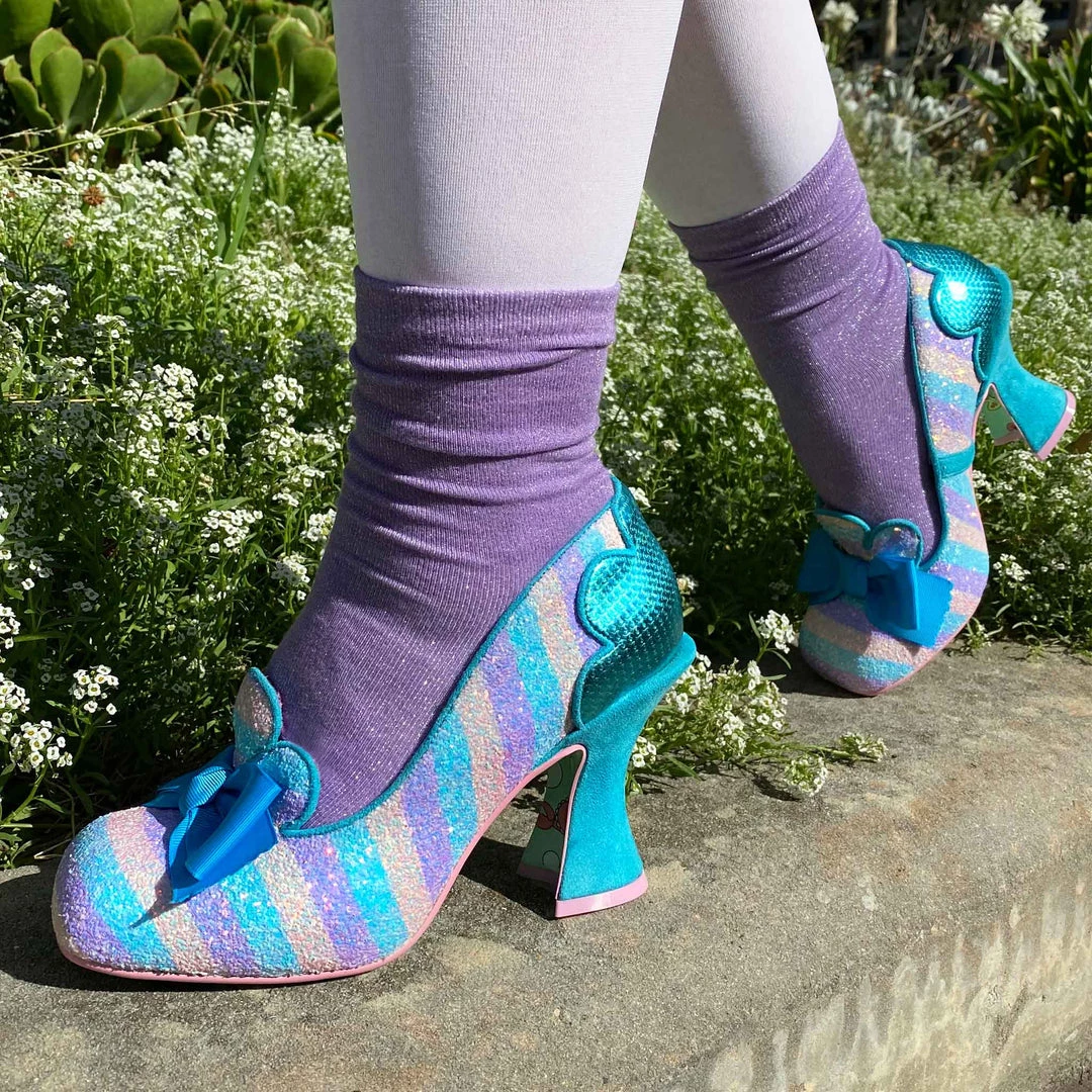 Feel like royalty in these regal heels! Featuring a shimmering aqua blue fleur de lis on the heel of the upper and tongue of the shoe, these bow toped lovelies are accented with a gorgeous curving heel to really give that opulent feeling all over! The pastel striped glitter upper is perfect to pair with all your favourite bright clothes, or even a more muted outfit so that they can really pop! Give them a whirl, why not?