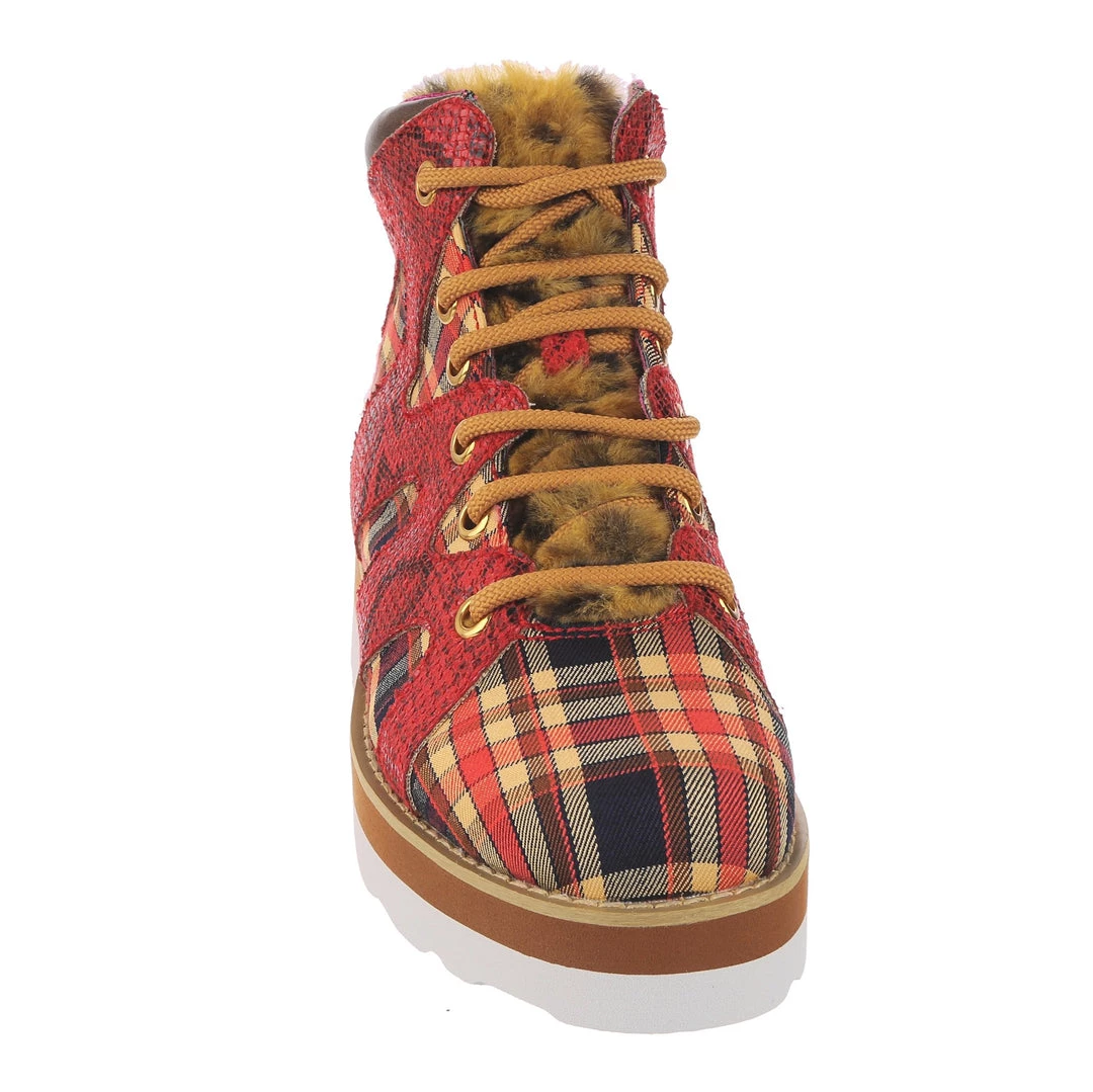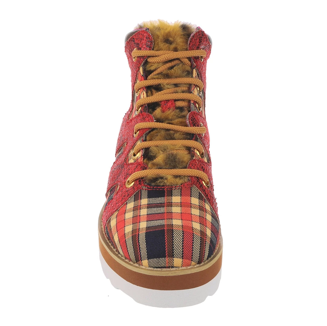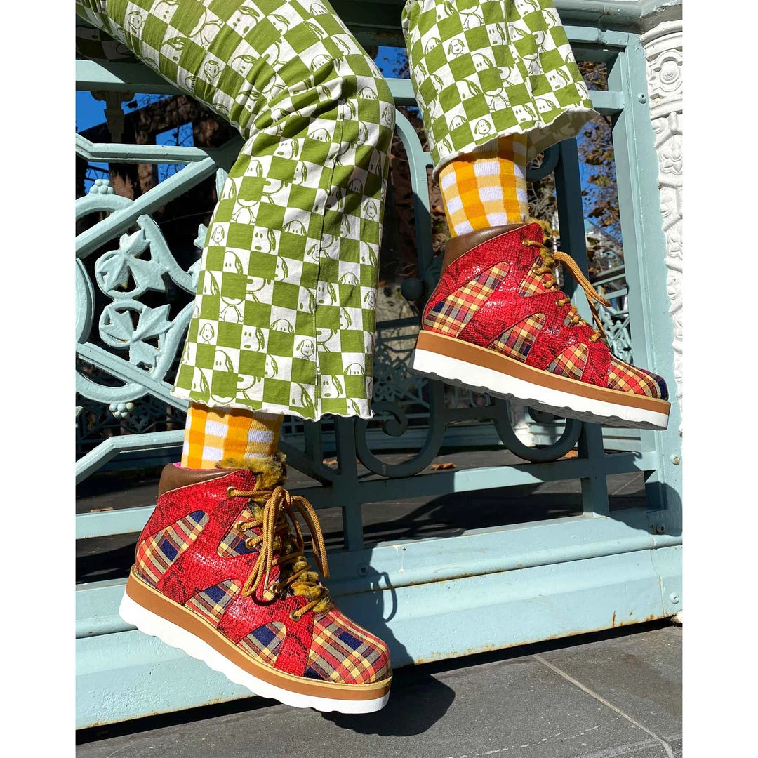 Lace-up into these awesome high tops! A striking dark red snakeskin texture crisscrosses along the blue, yellow and red tartan upper, complemented by the tonal stacked sole and fun faux fur tongue! The perfect way to inject some texture and cool into your outfit!
