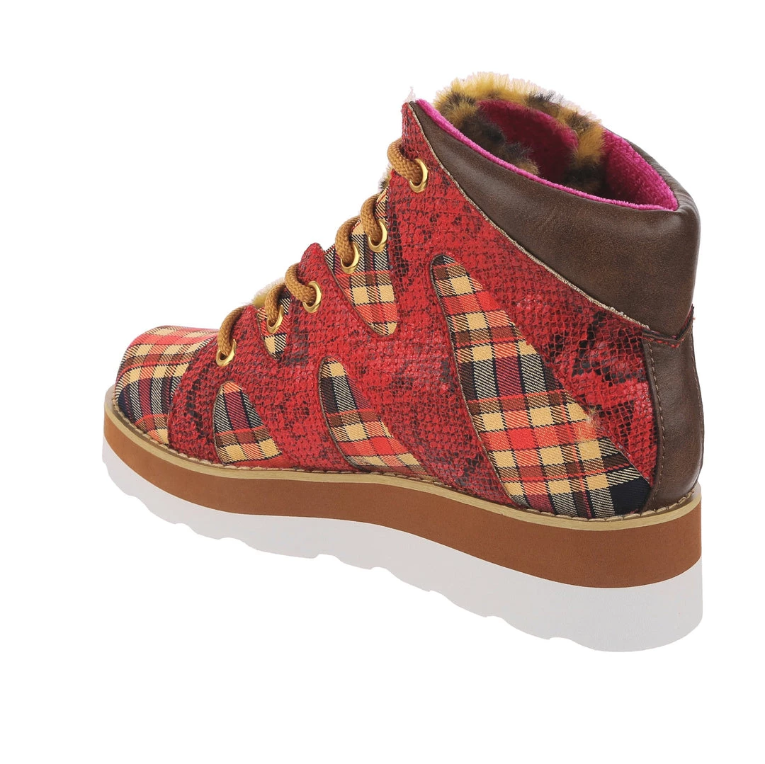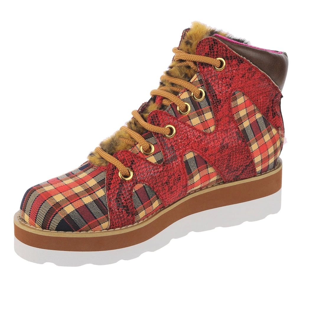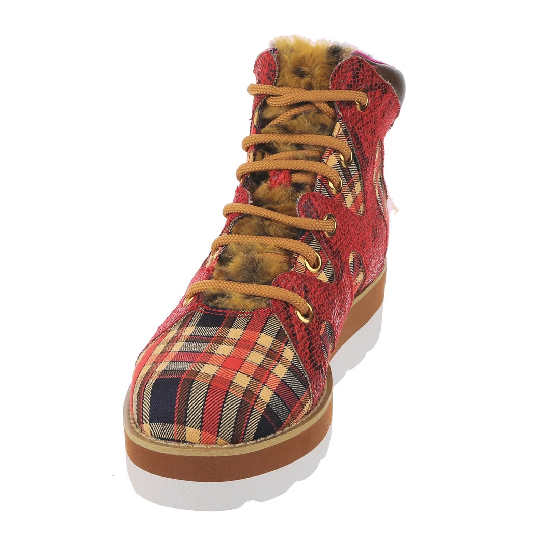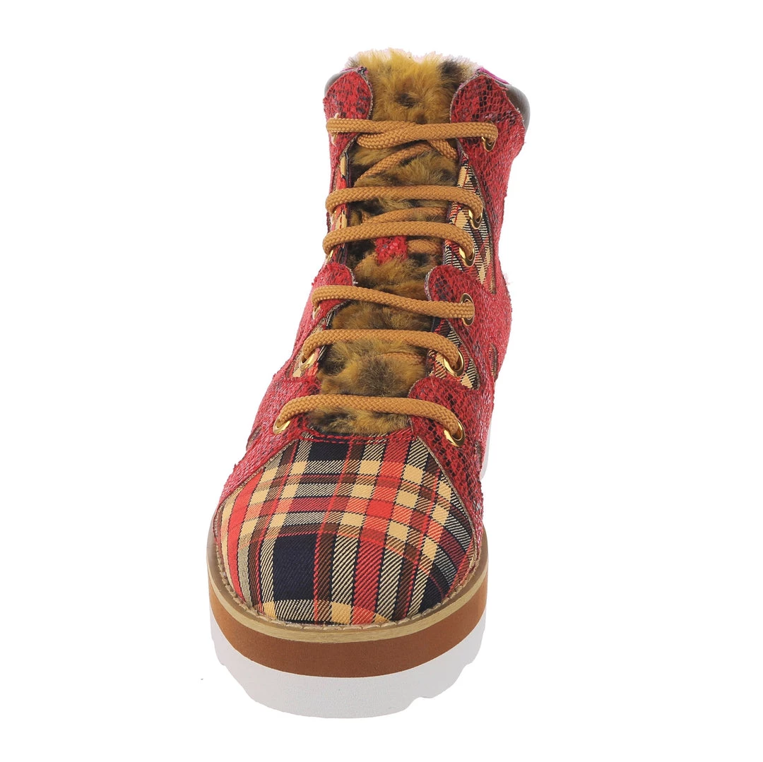 Lace-up into these awesome high tops! A striking dark red snakeskin texture crisscrosses along the blue, yellow and red tartan upper, complemented by the tonal stacked sole and fun faux fur tongue! The perfect way to inject some texture and cool into your outfit!