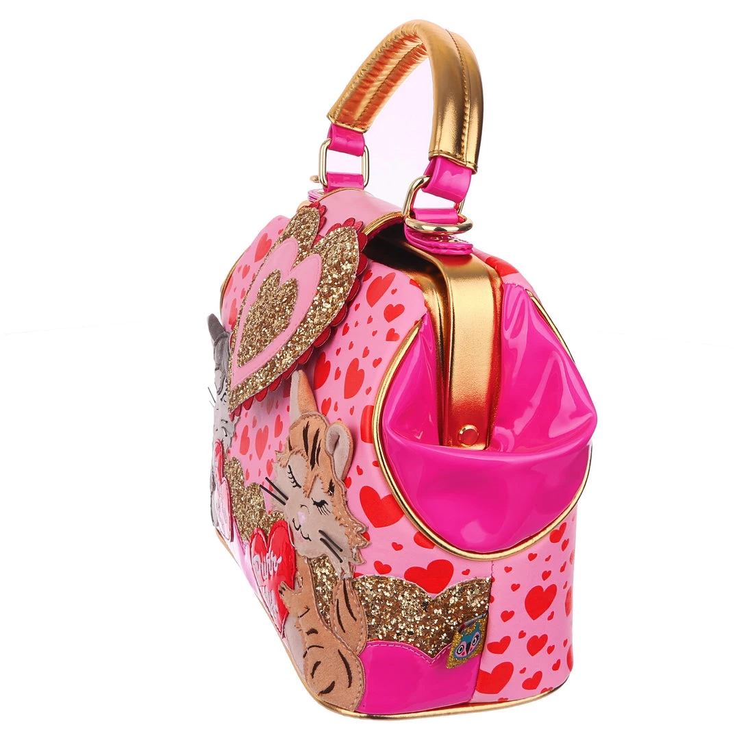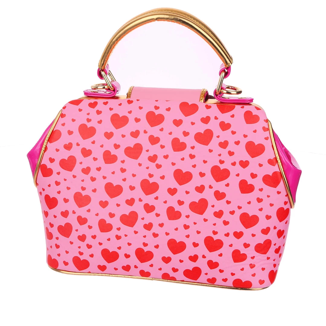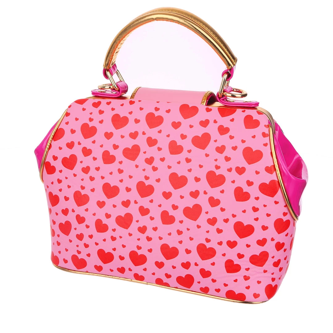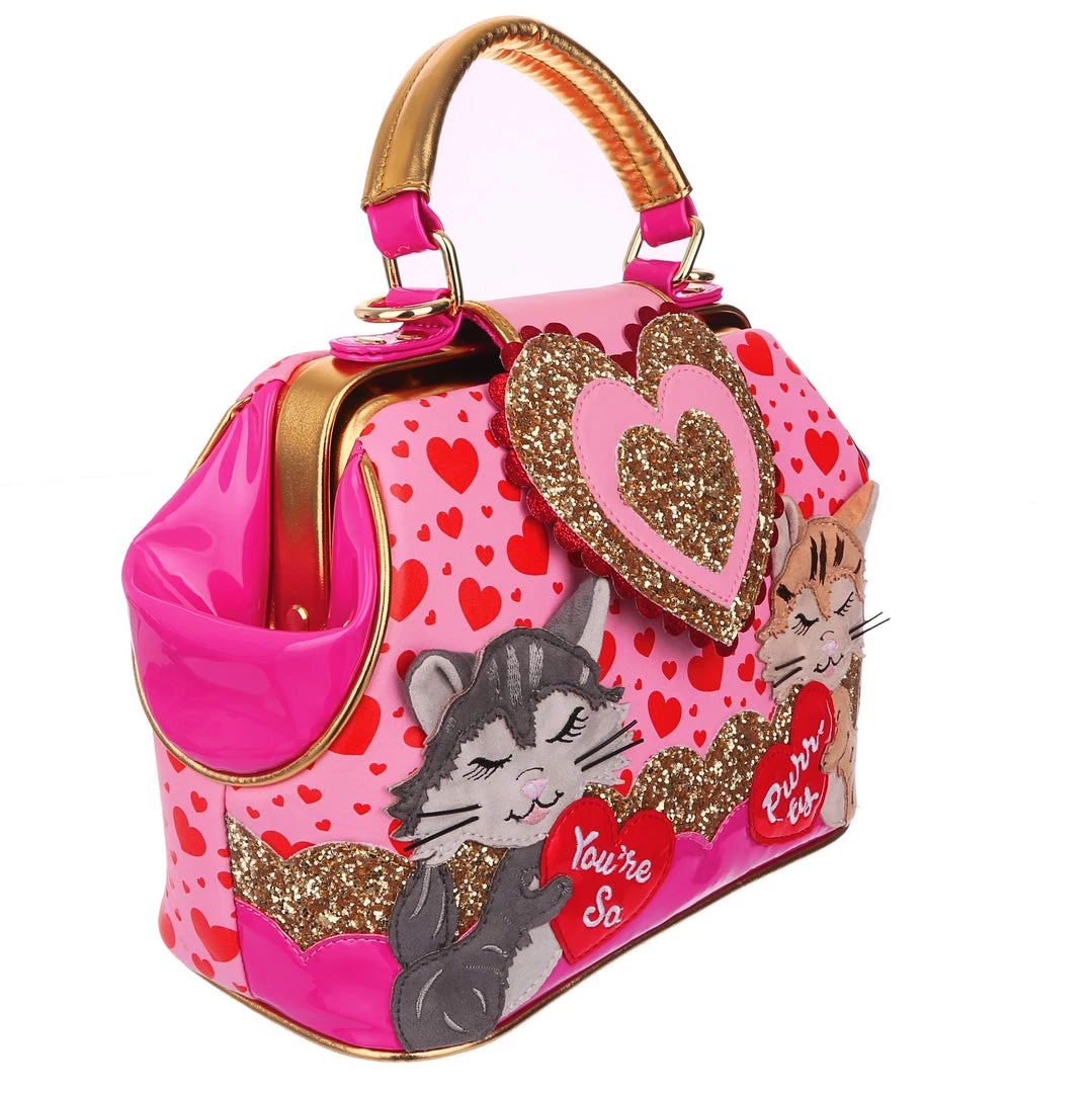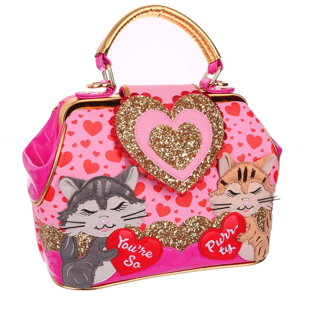 Are you feline fabulous? We know you are! Feel the love with this dreamy handbag which features two little kitties exchanging hearts which spell out “You’re so purr-fect”! Backed onto an adorable red and pink print of multi sized hearts, and accented with ruby red and gold scalloped details, this hand held bag also comes with an adjustable and detachable strap, so you can wear it however you would like!