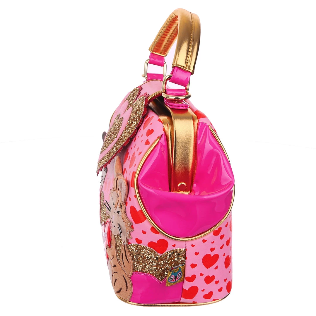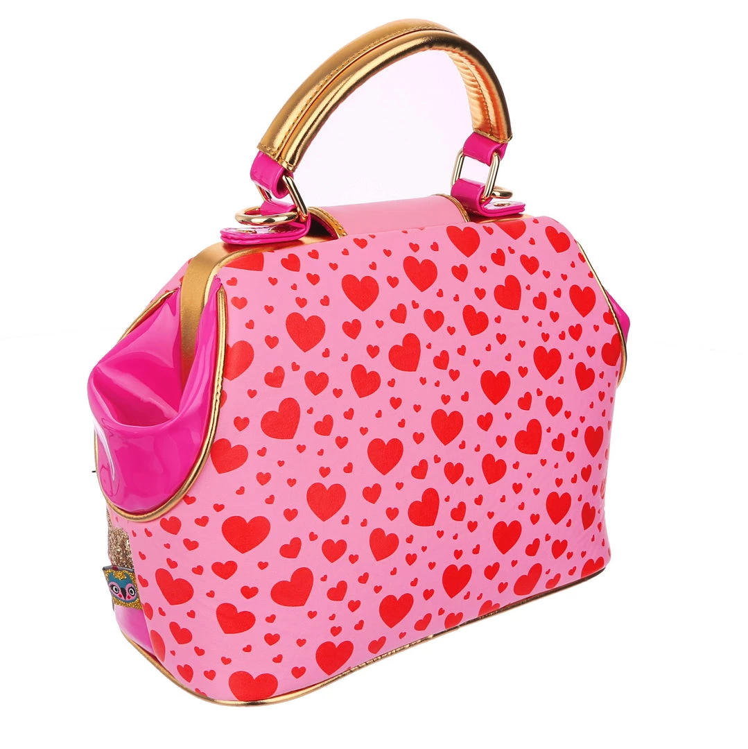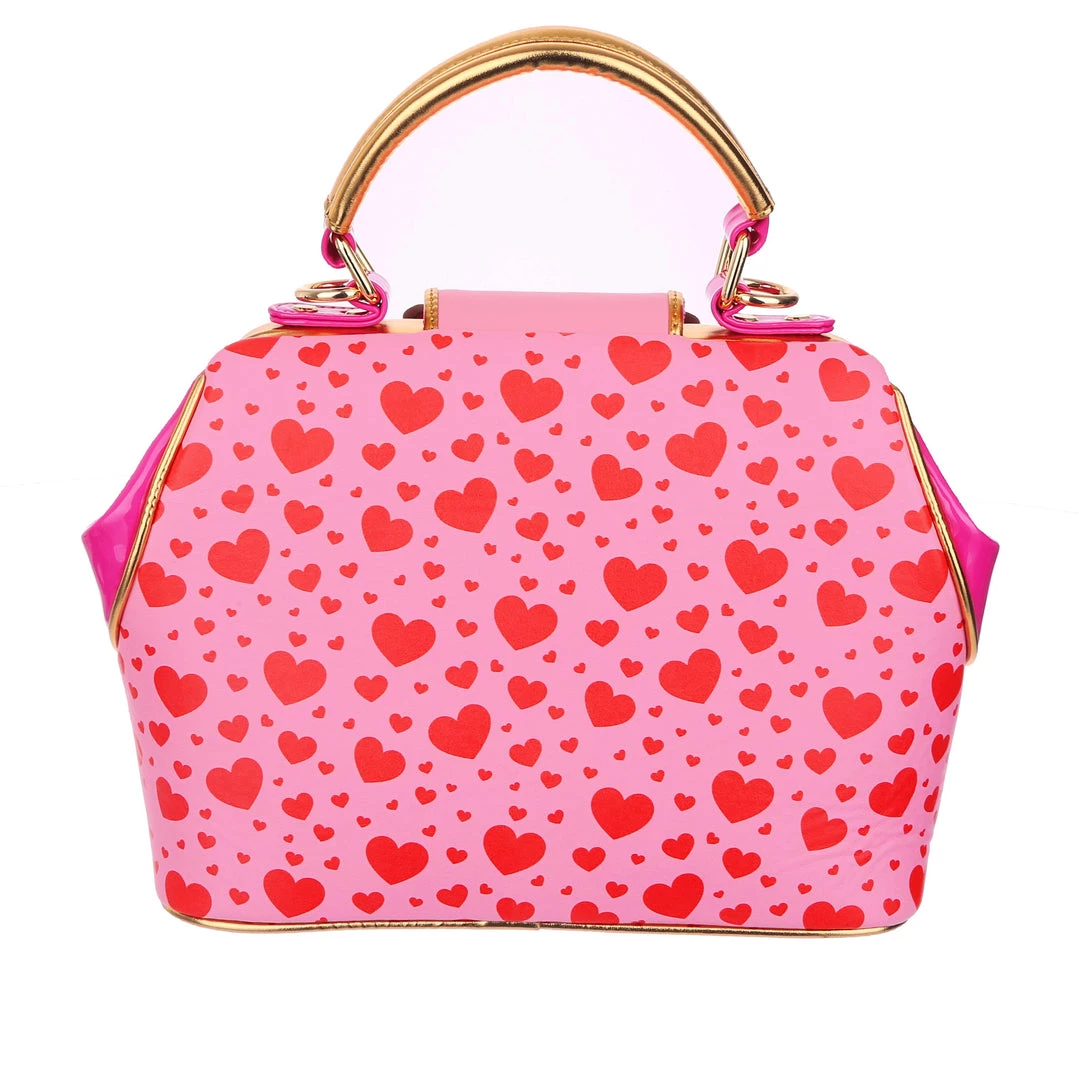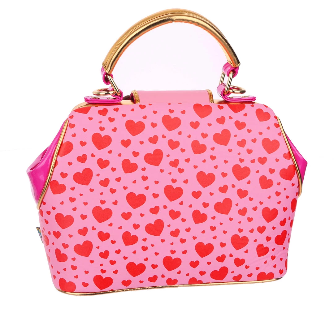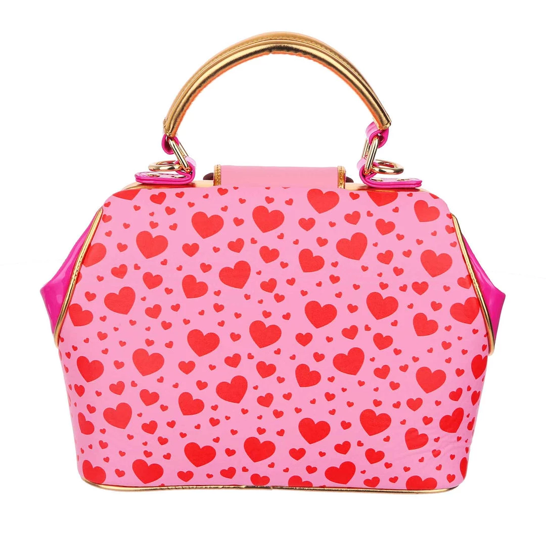 Are you feline fabulous? We know you are! Feel the love with this dreamy handbag which features two little kitties exchanging hearts which spell out “You’re so purr-fect”! Backed onto an adorable red and pink print of multi sized hearts, and accented with ruby red and gold scalloped details, this hand held bag also comes with an adjustable and detachable strap, so you can wear it however you would like!