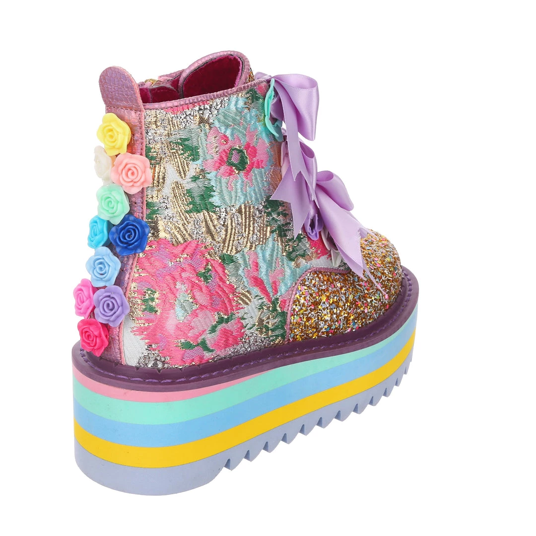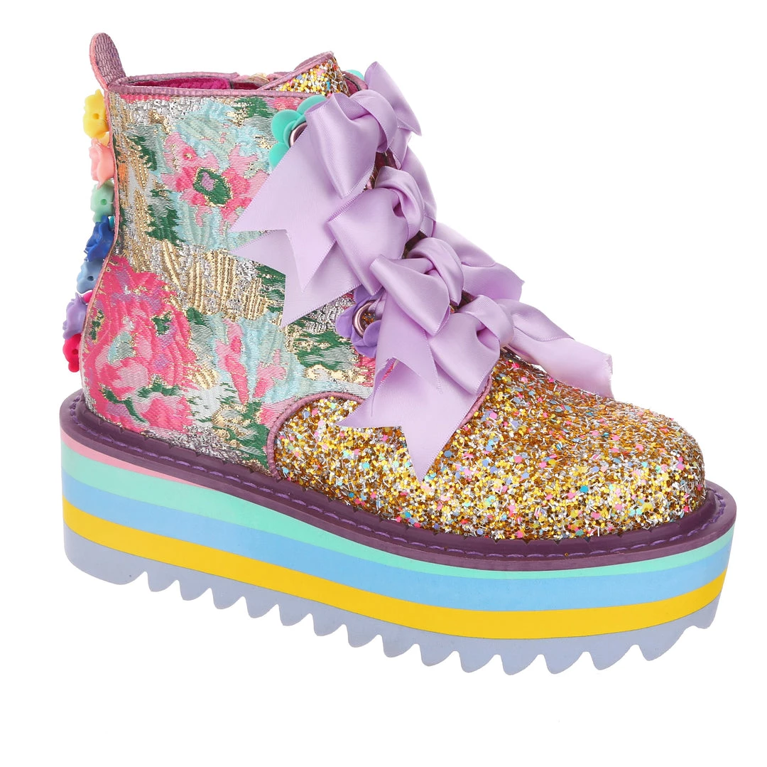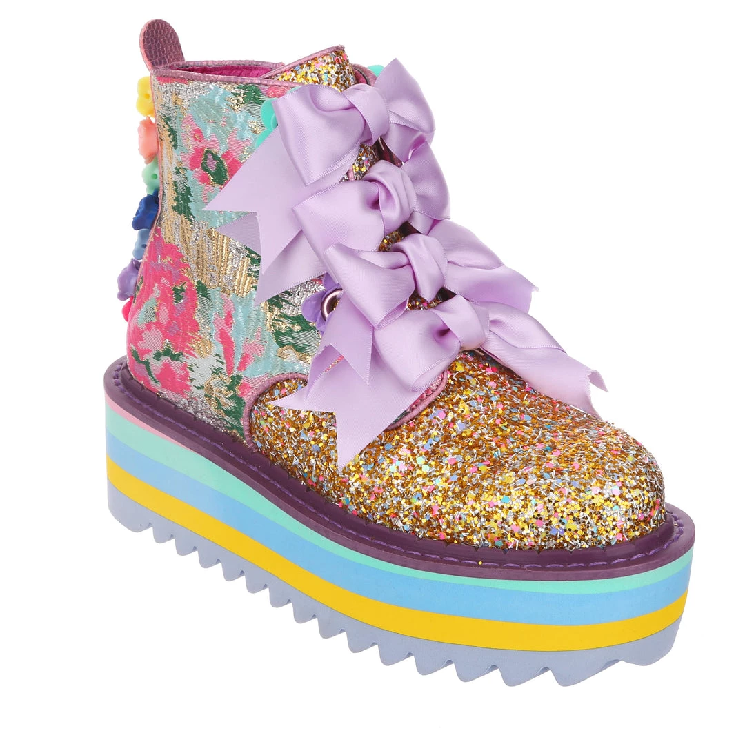 Covered in bows, these boots are a combination of textures, from the lilac ribbons on the laces, to the tapestry brocade in blues, pinks and green on the side, to the gold glitter on the toe, these lovelies are sure to turn heads! Little details like the multicoloured roses along the back, and the stacked sole with a jagged tread give these shoes a bit of a bright streetwear feel, perfect to give your outfit that boost you’ve been looking for!